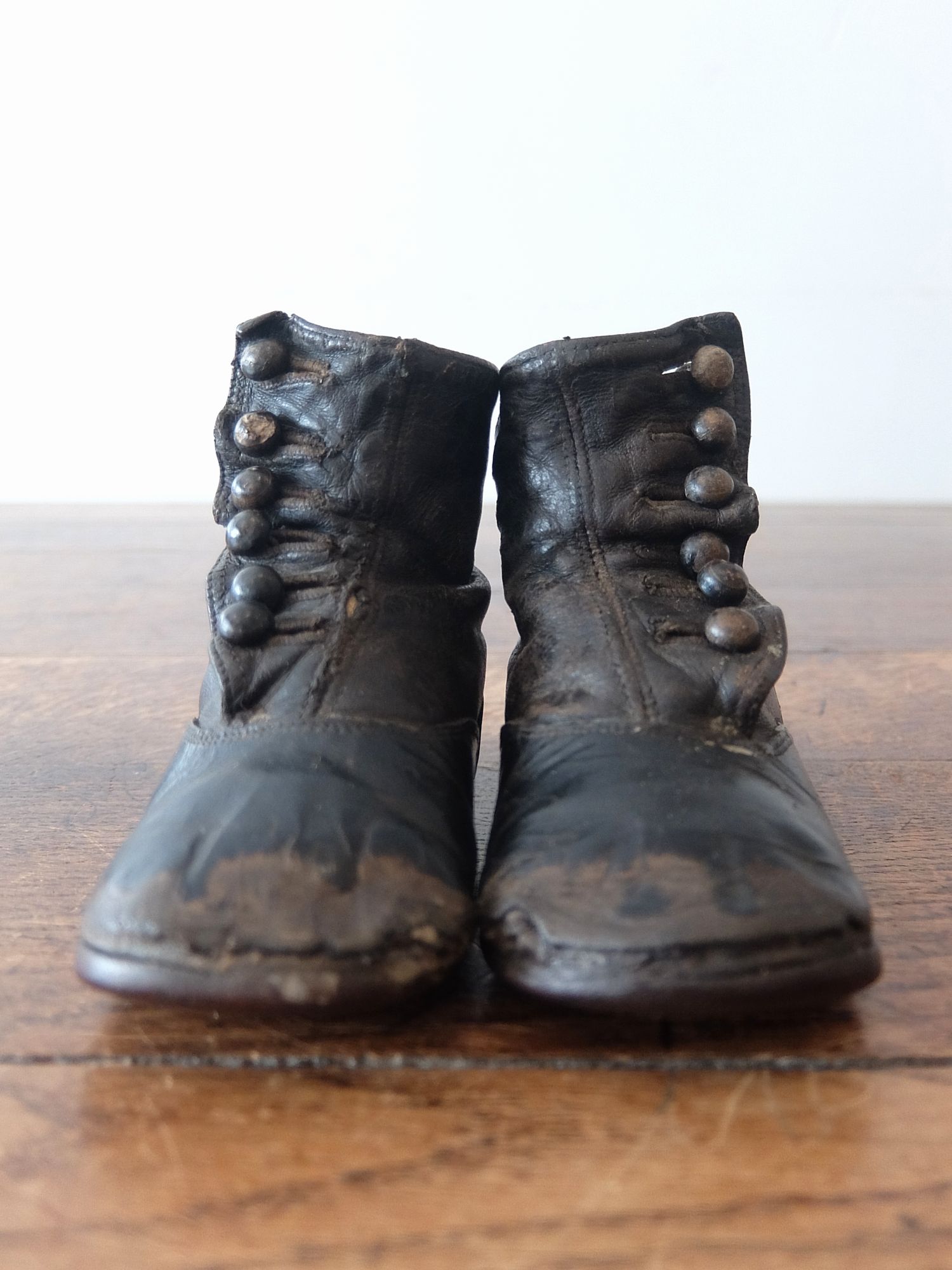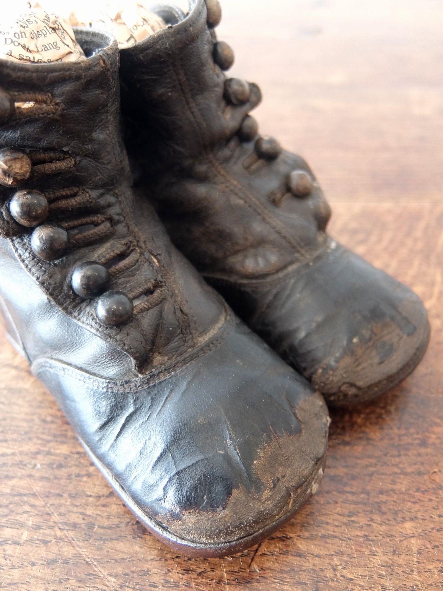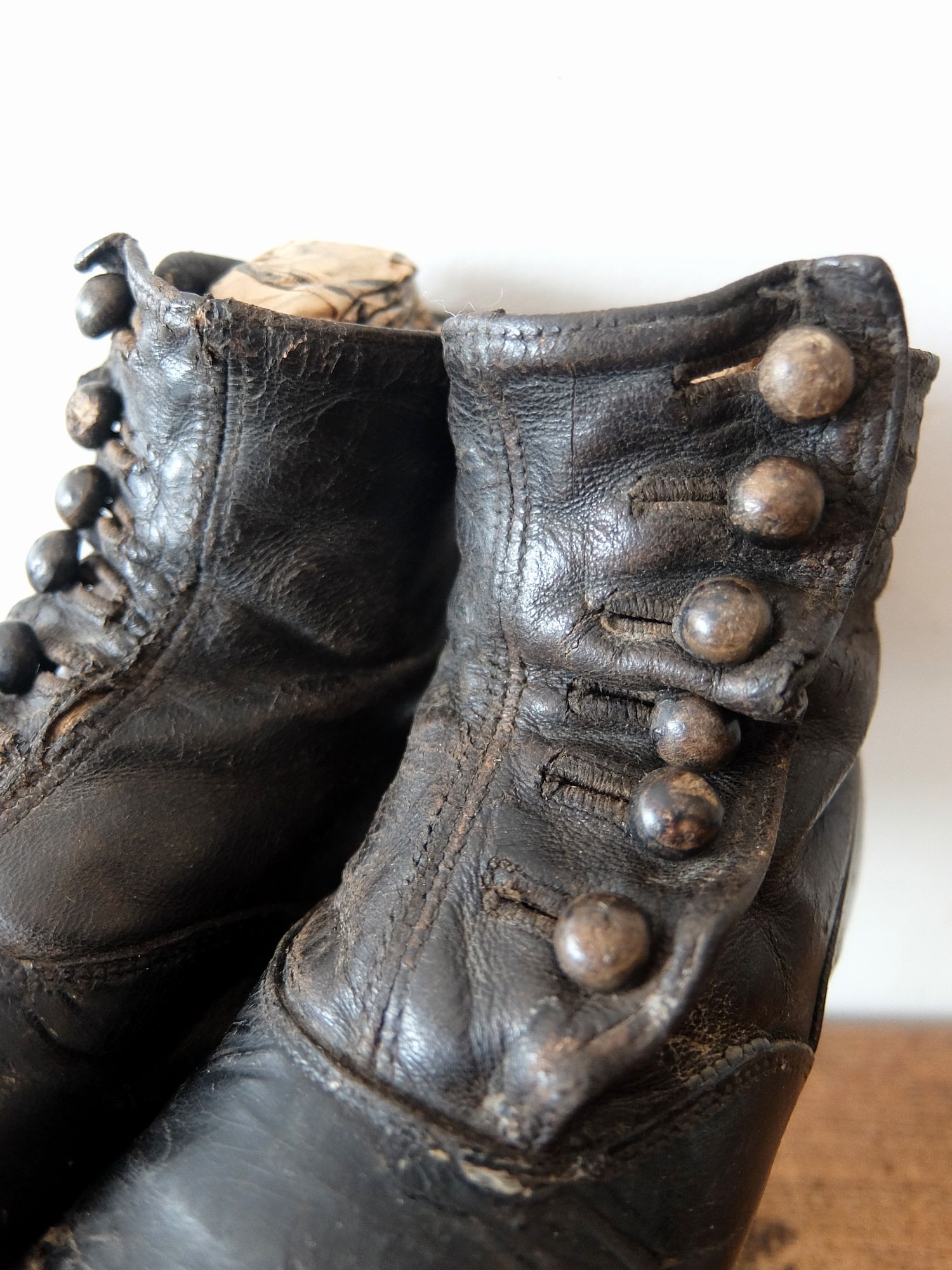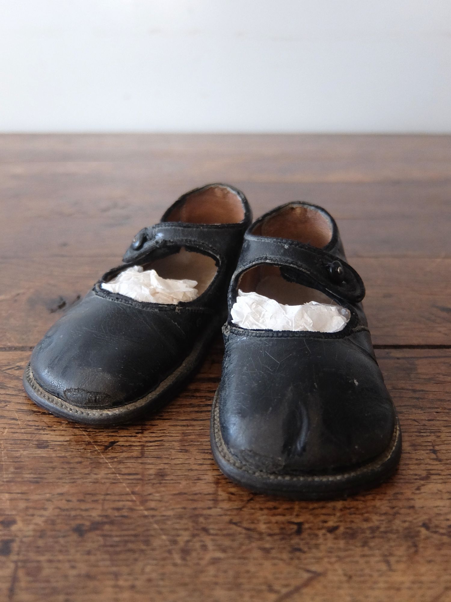 使い込まれた革の雰囲気が魅力的な子供用/人形用のヴィクトリアンベビーシューズ