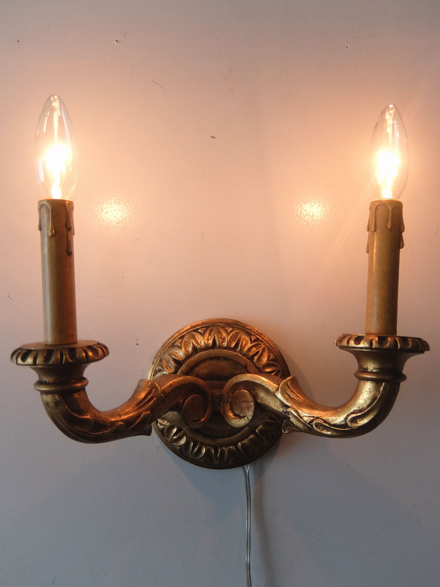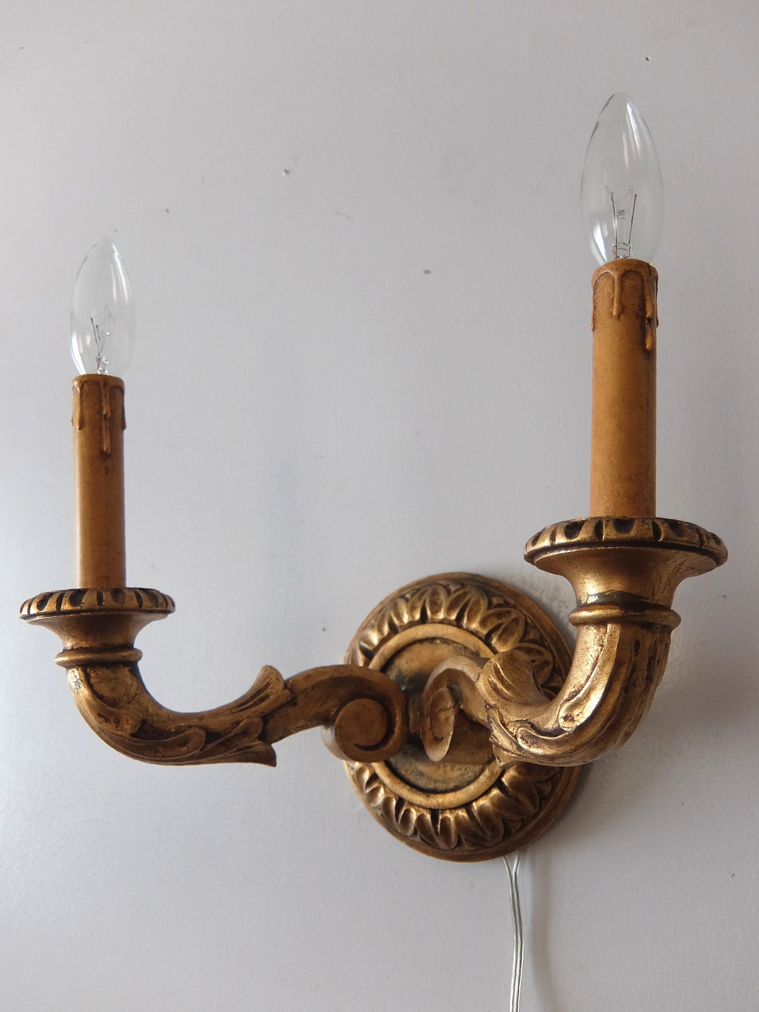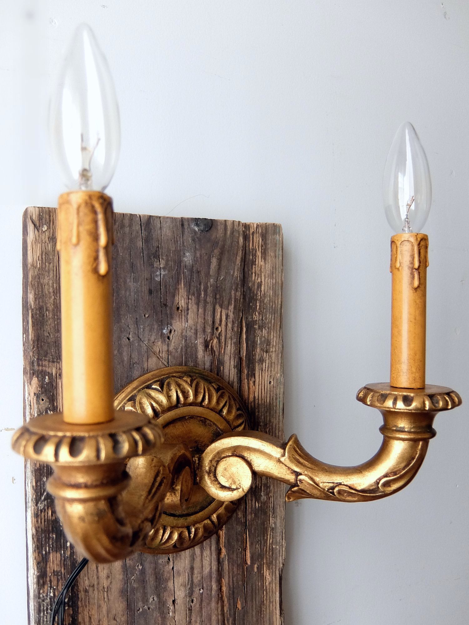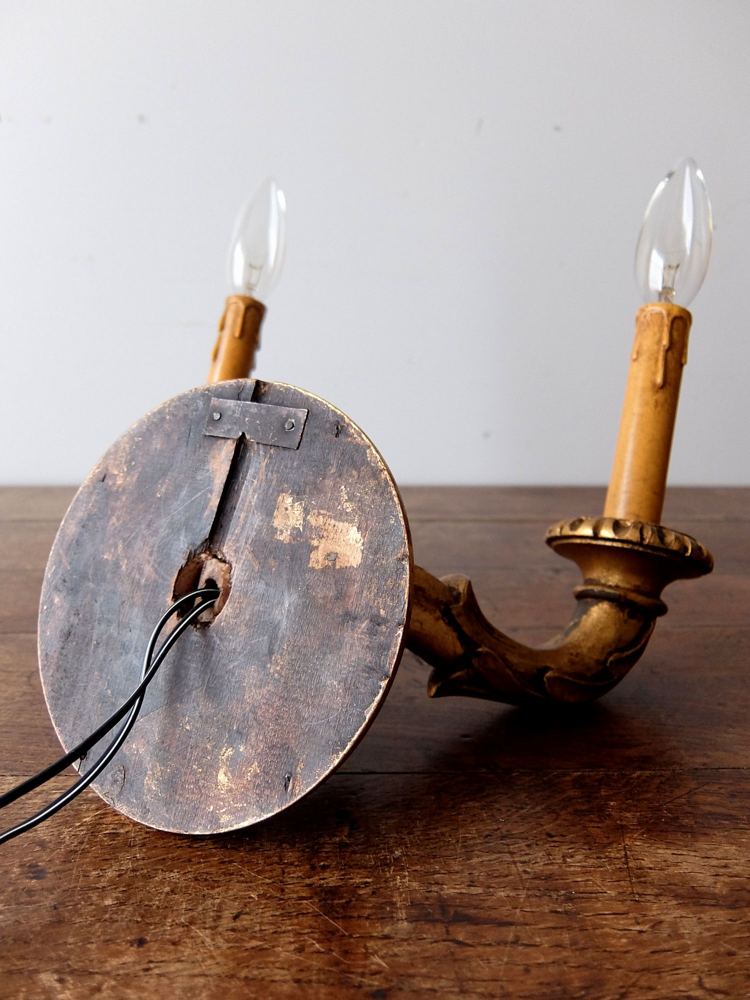朽ちたゴールドの塗装が美しい木製の2灯ブラケットランプ