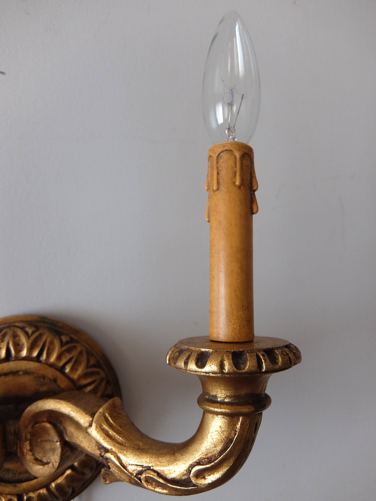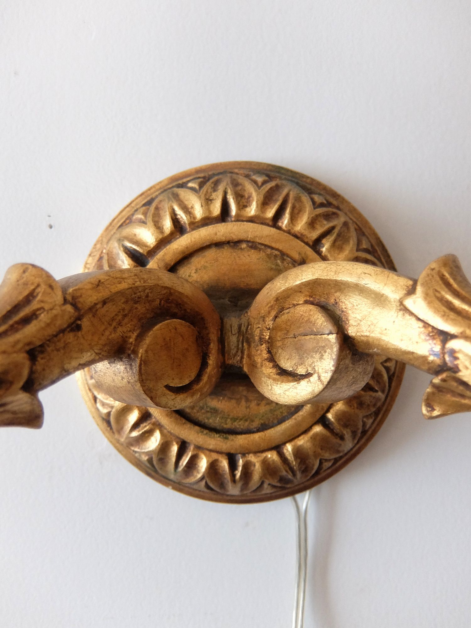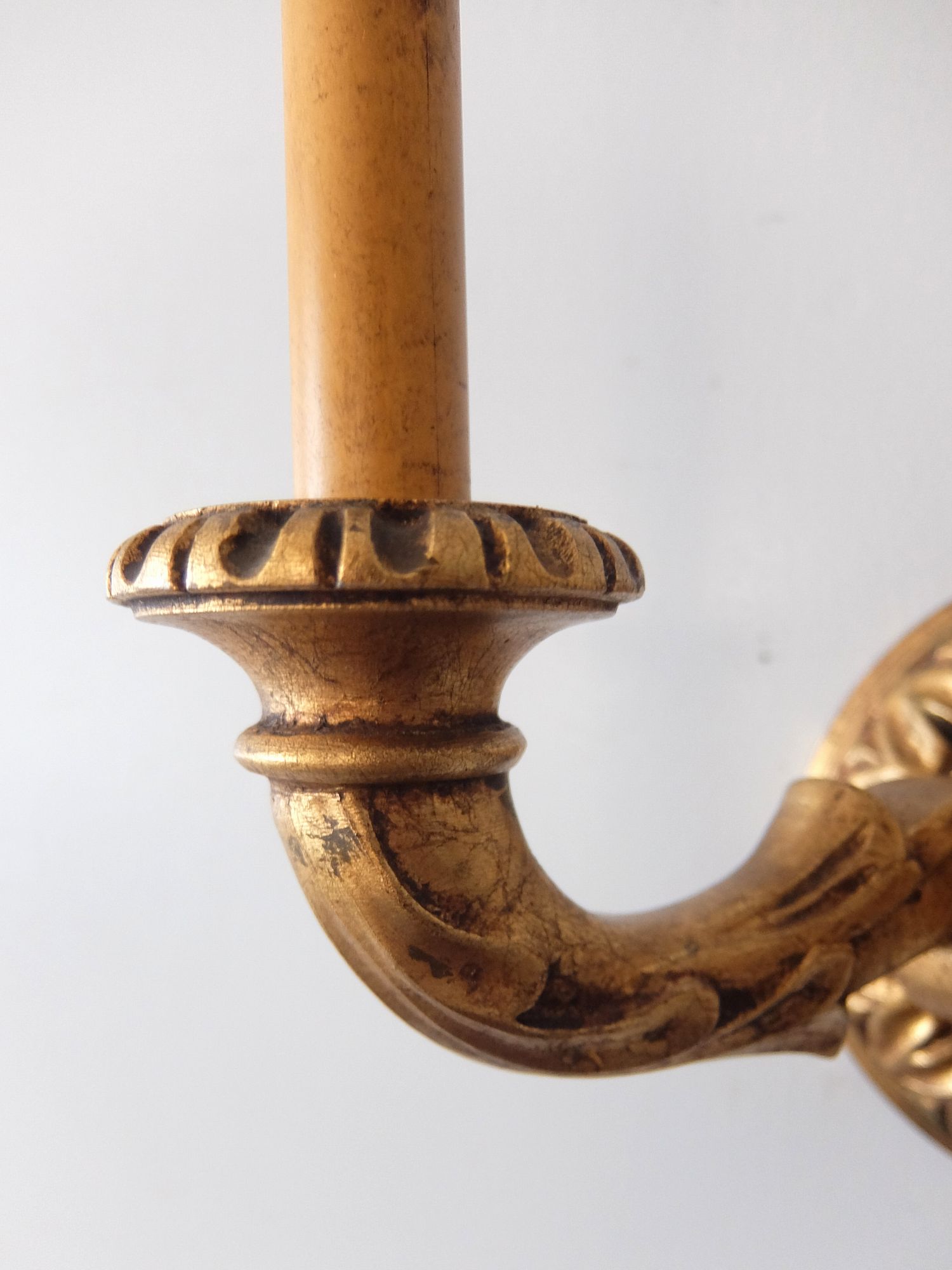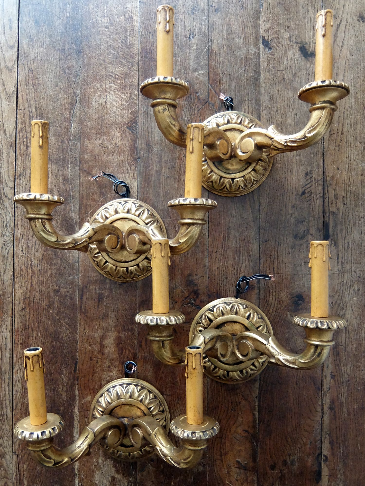 朽ちたゴールドの塗装が美しい木製の2灯ブラケットランプ