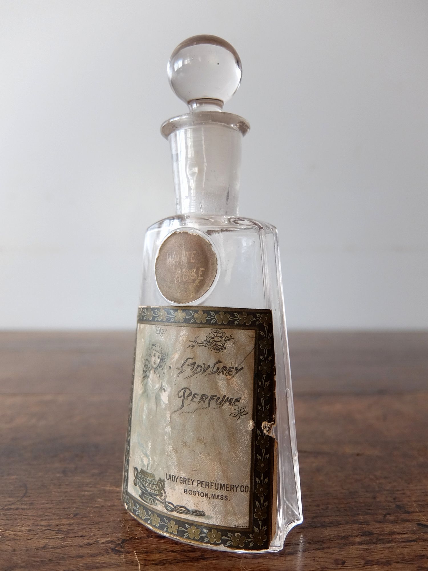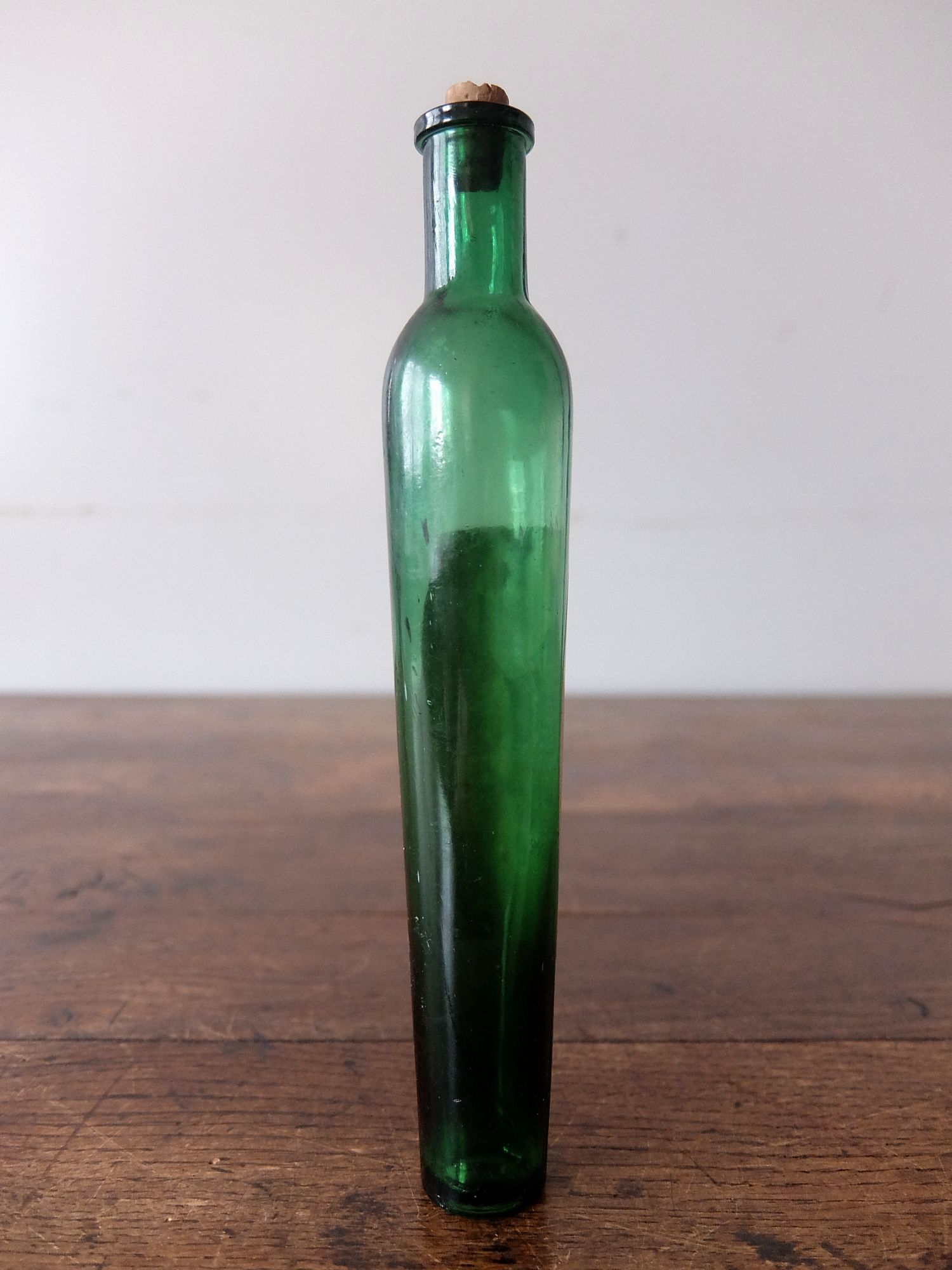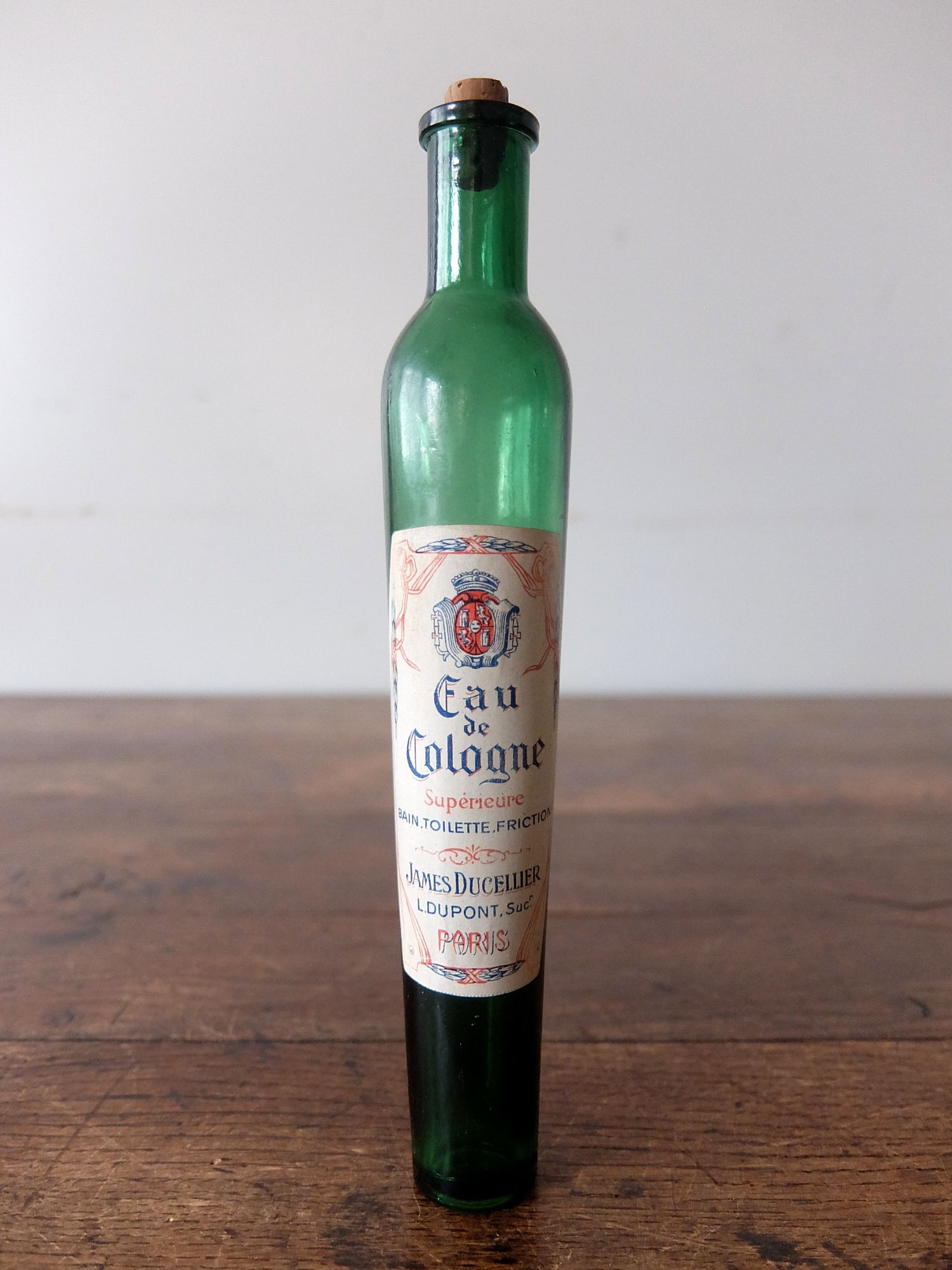 雰囲気のあるラベルが魅力的な細長い香水瓶