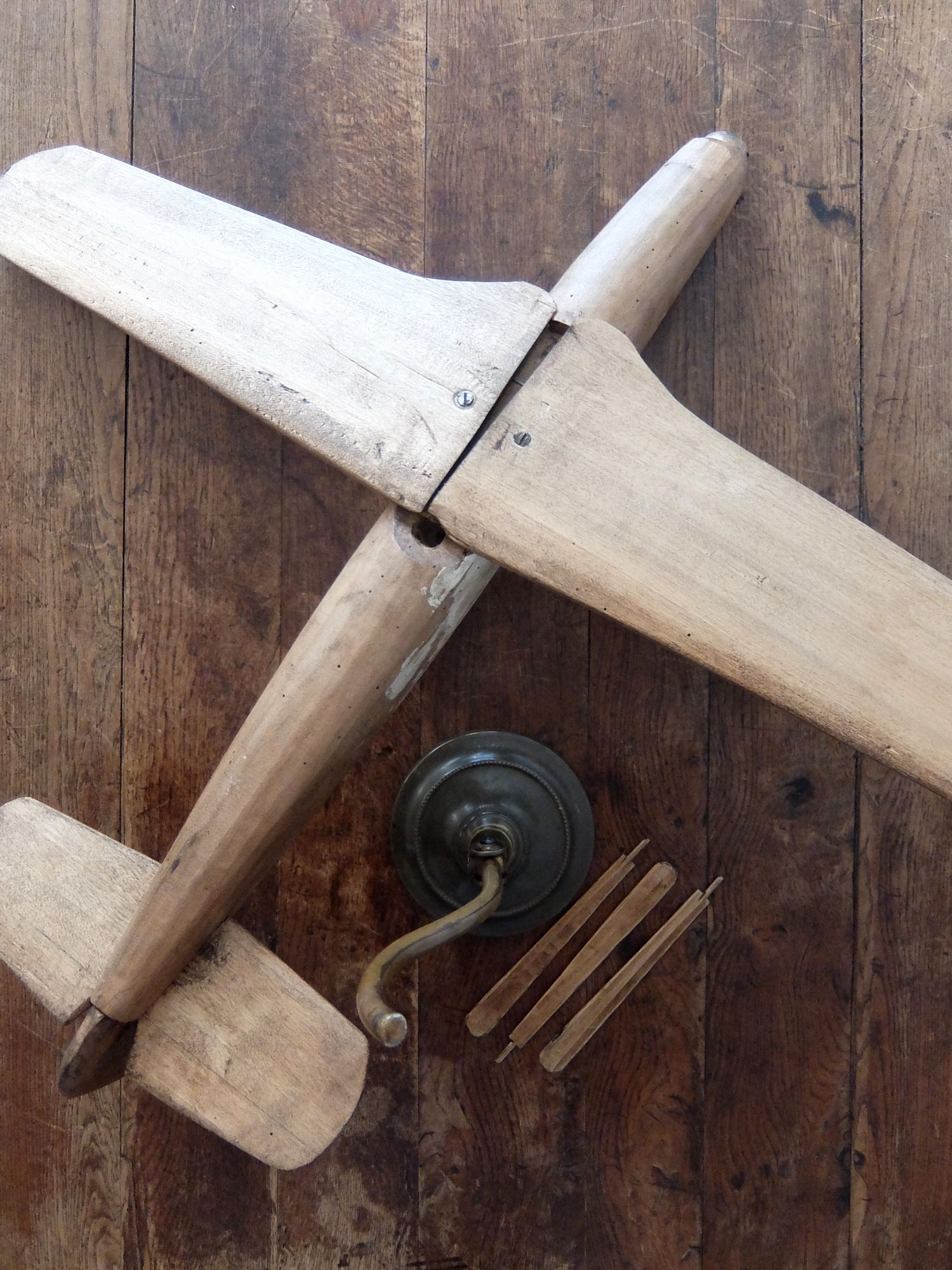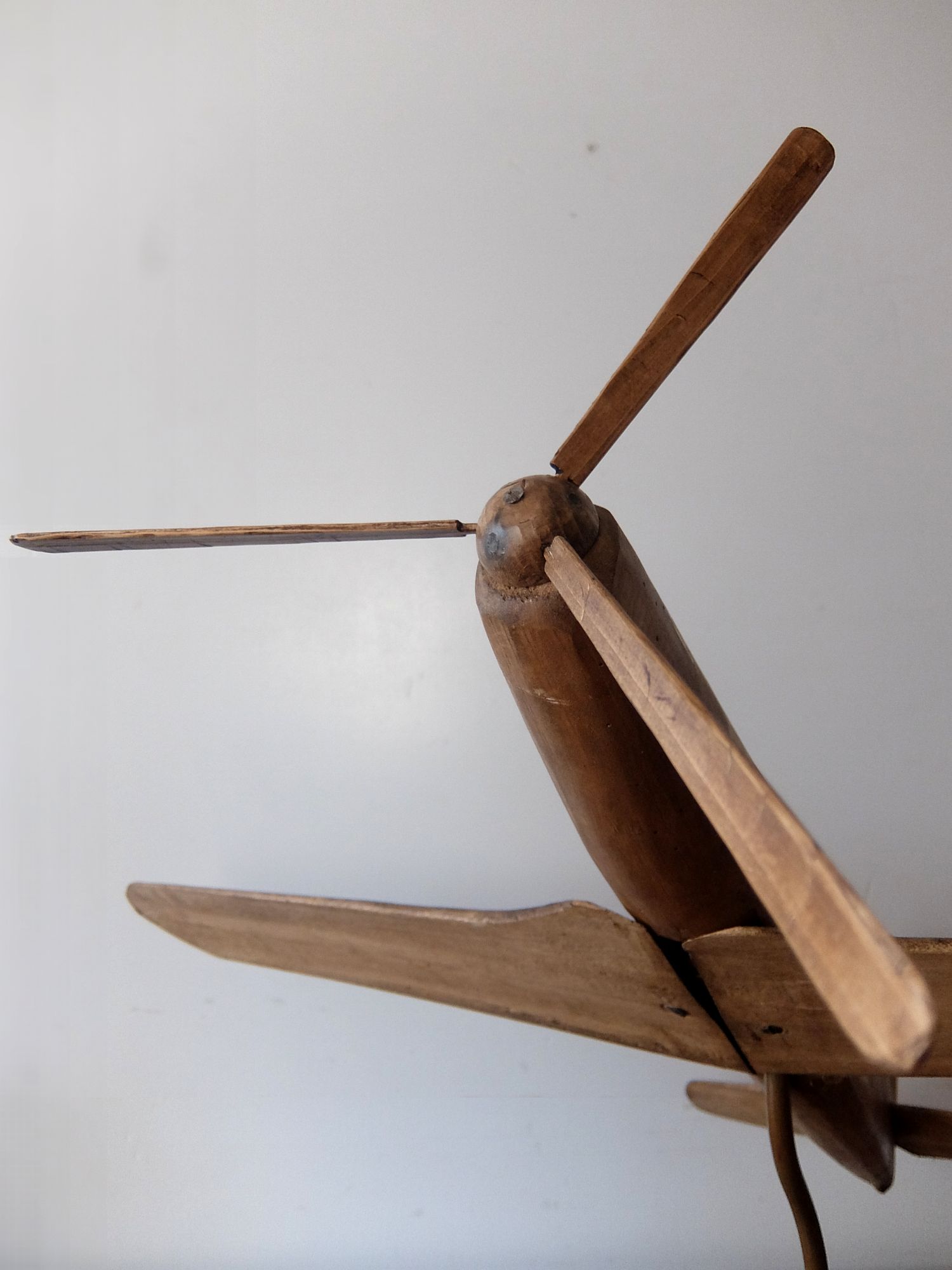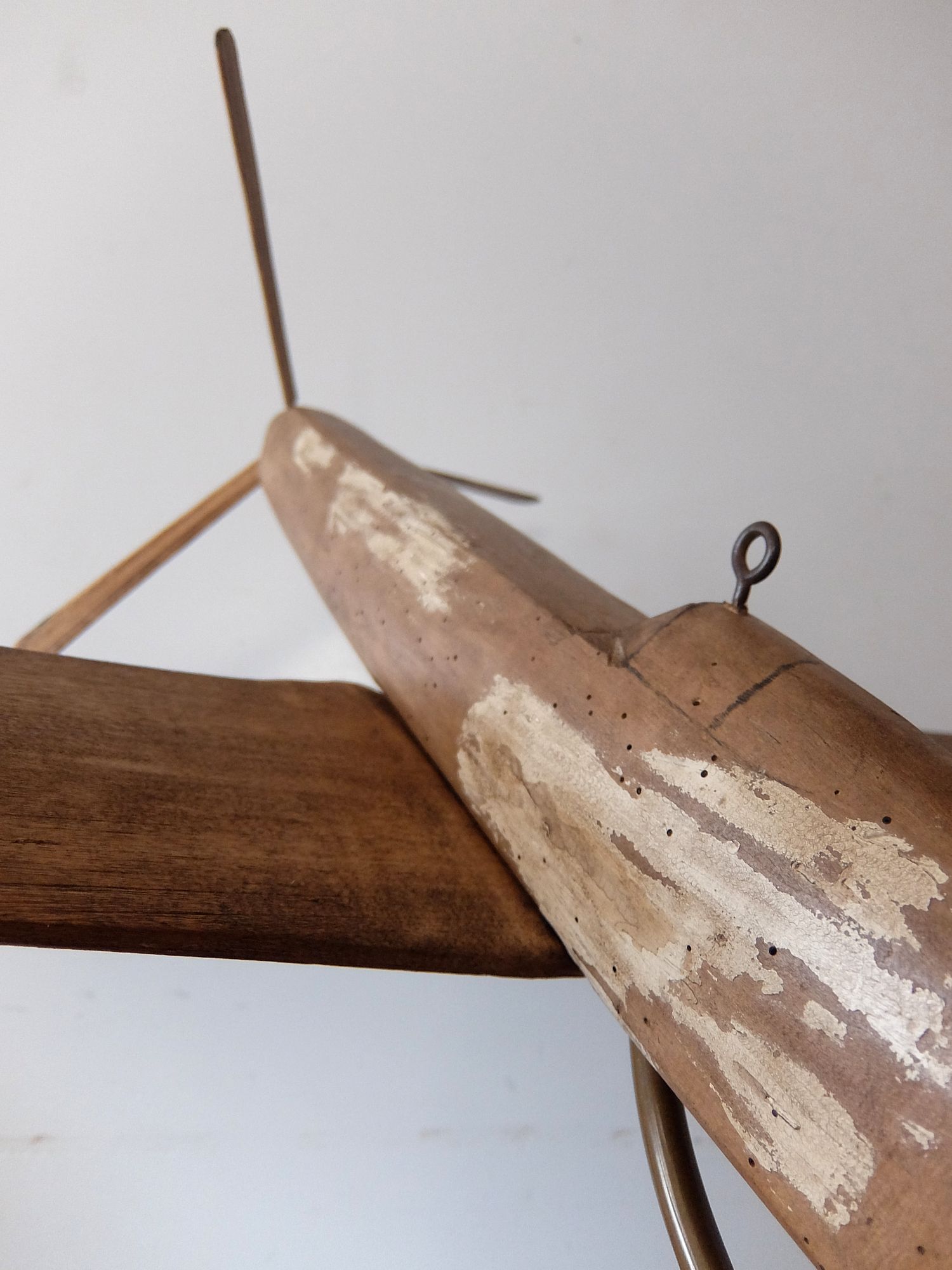 朽ちた風合いが美しいプロペラ機の木製模型