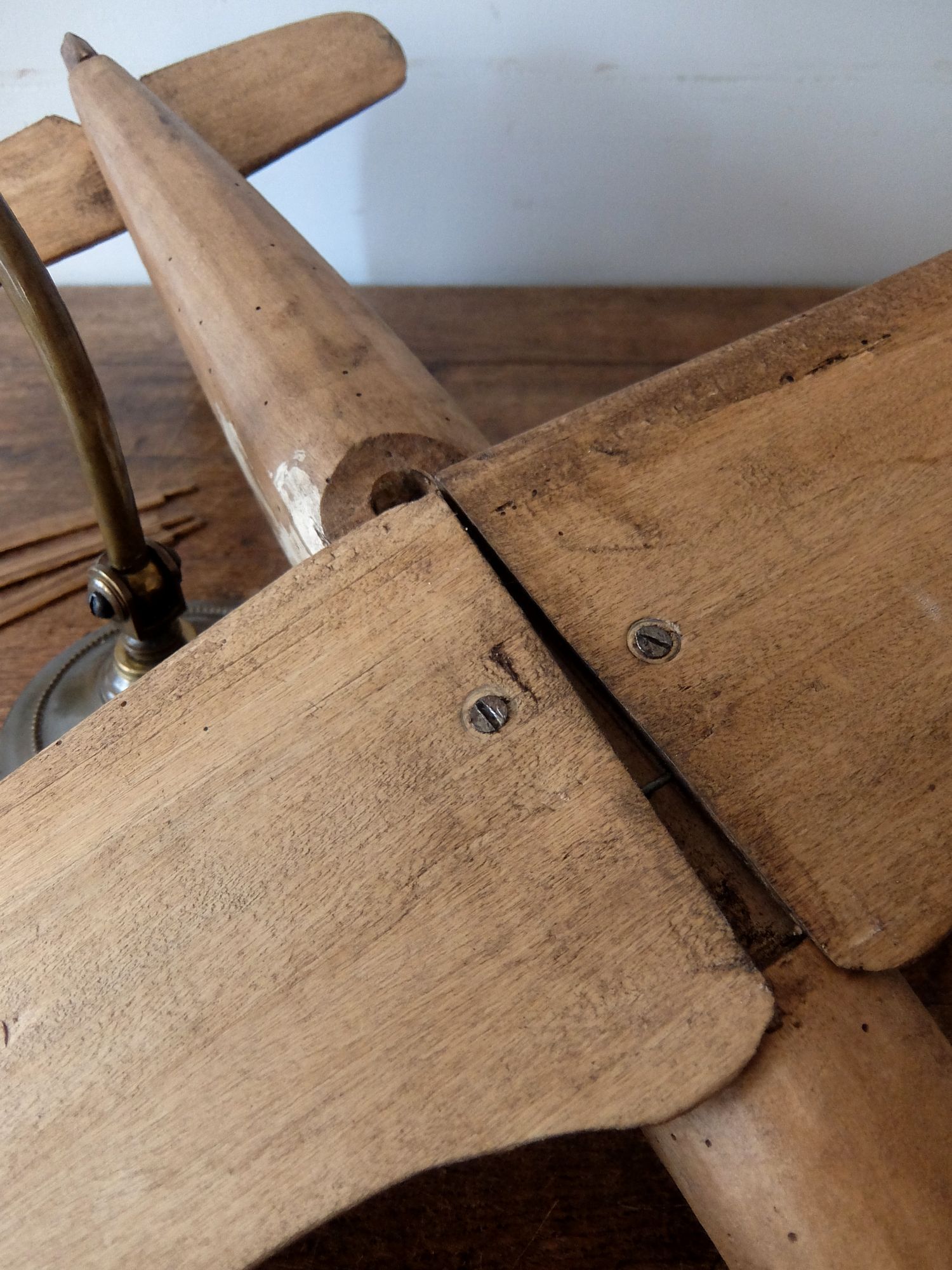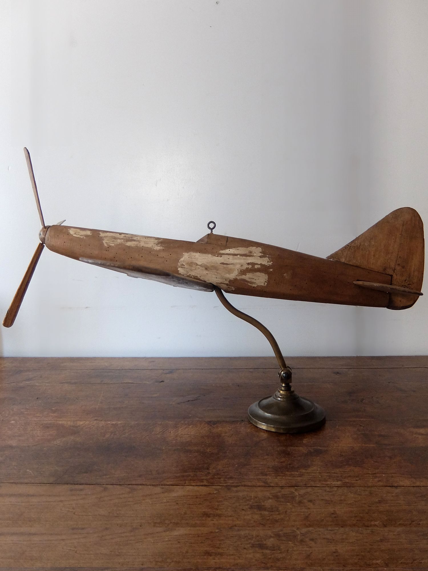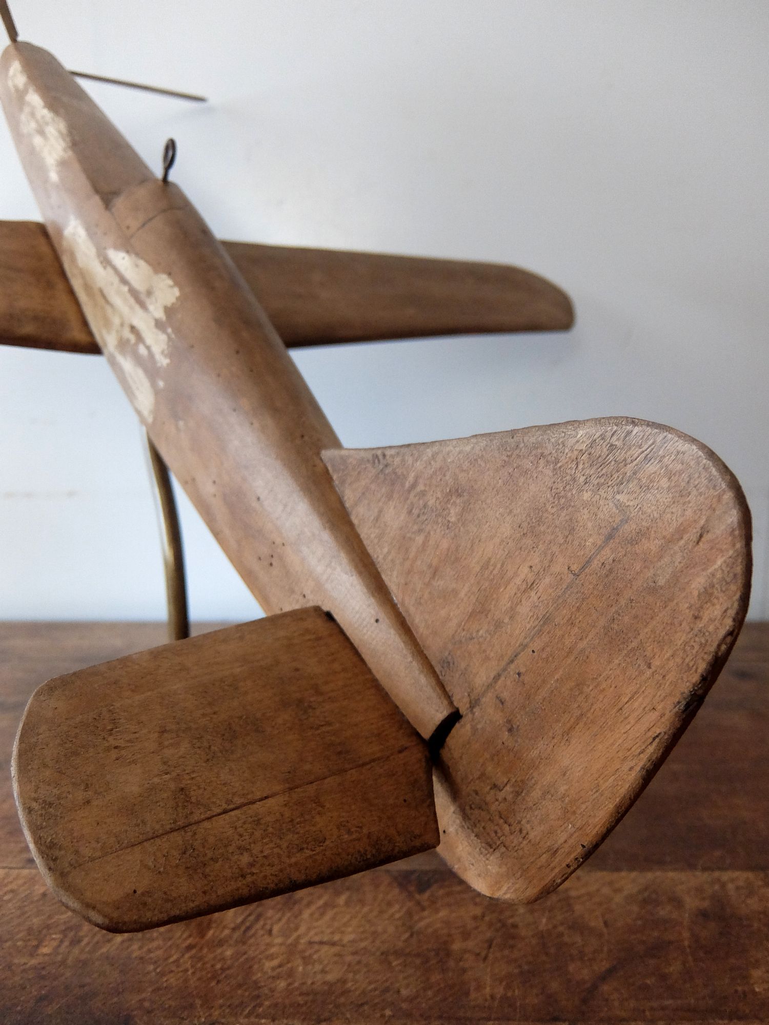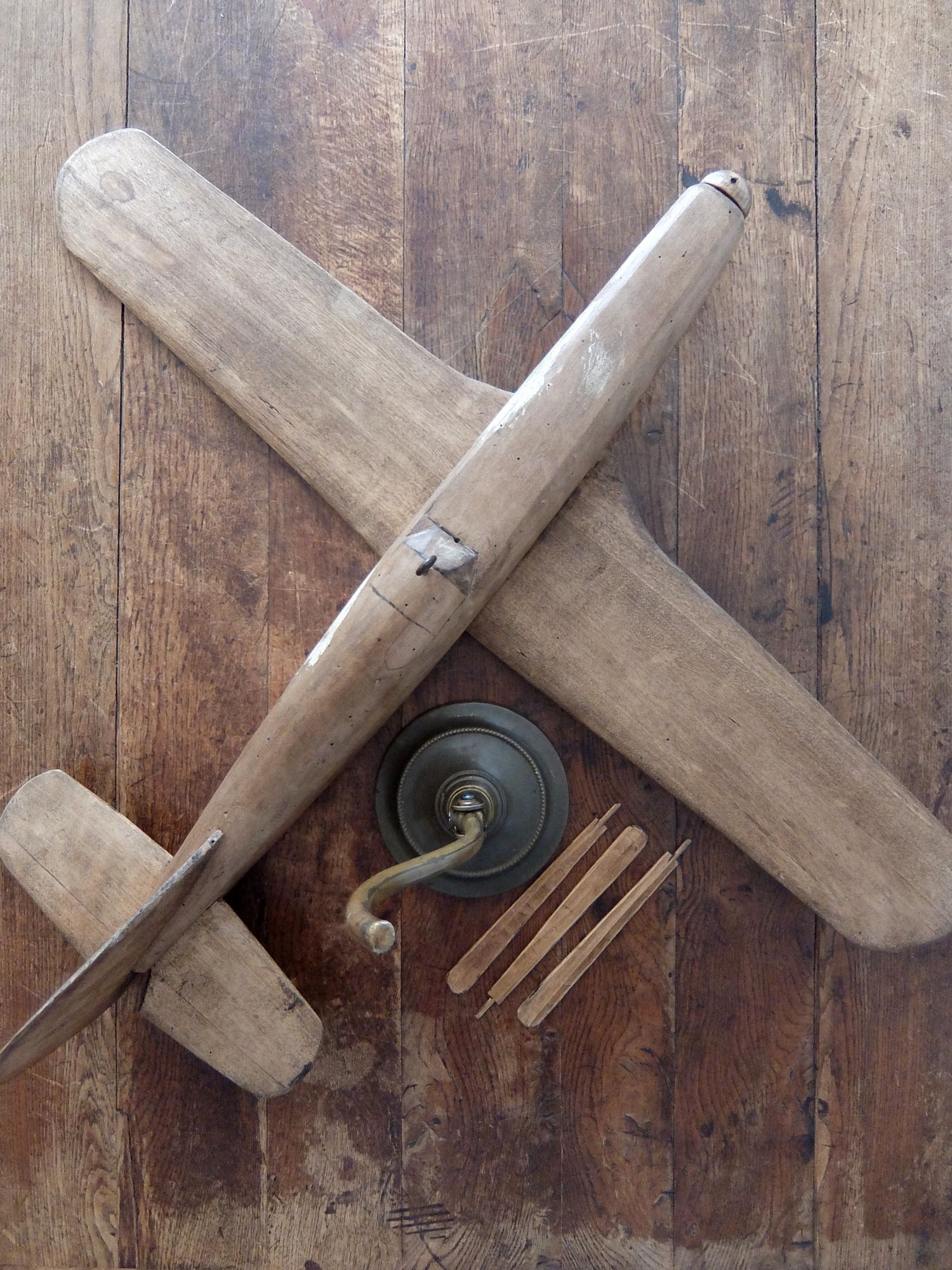 朽ちた風合いが美しいプロペラ機の木製模型