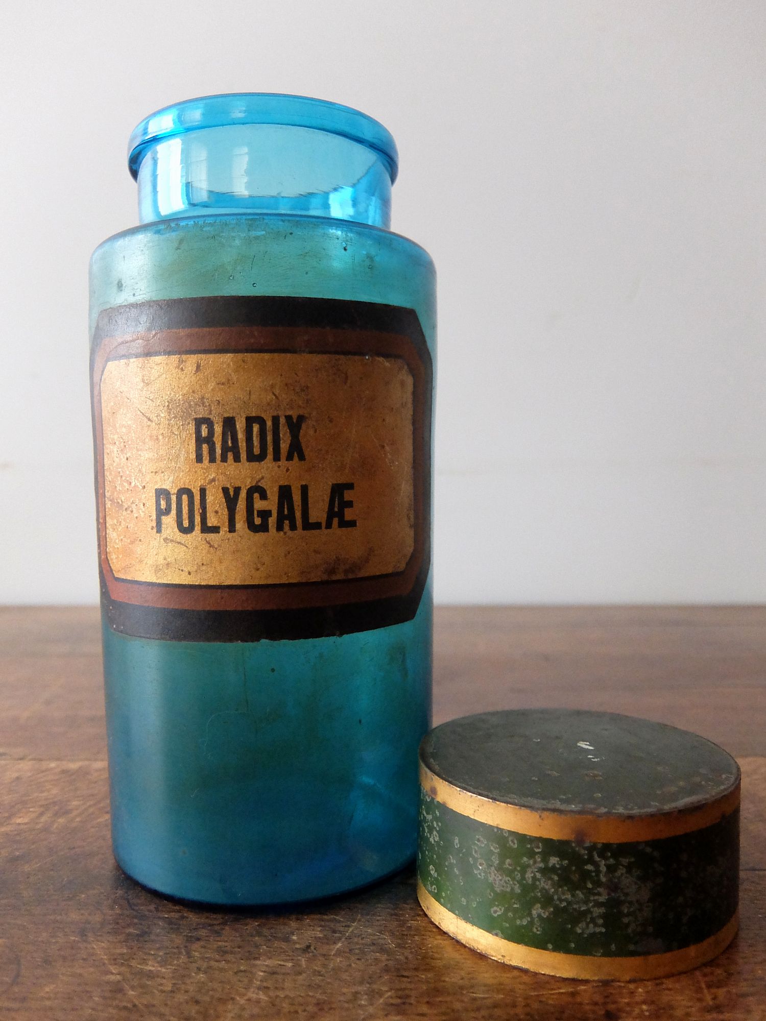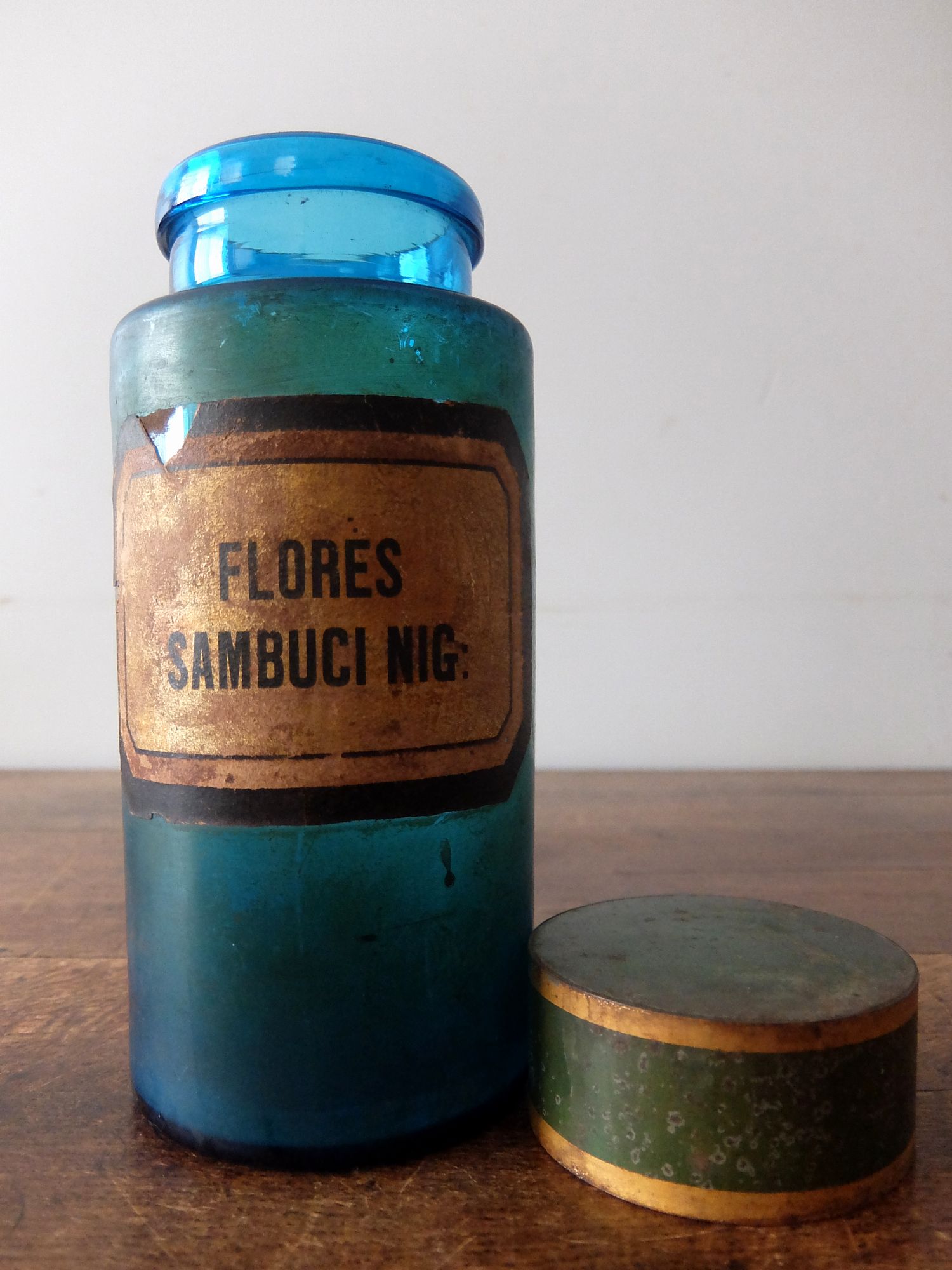朽ちたラベルが印象的な淡いブルーの薬瓶