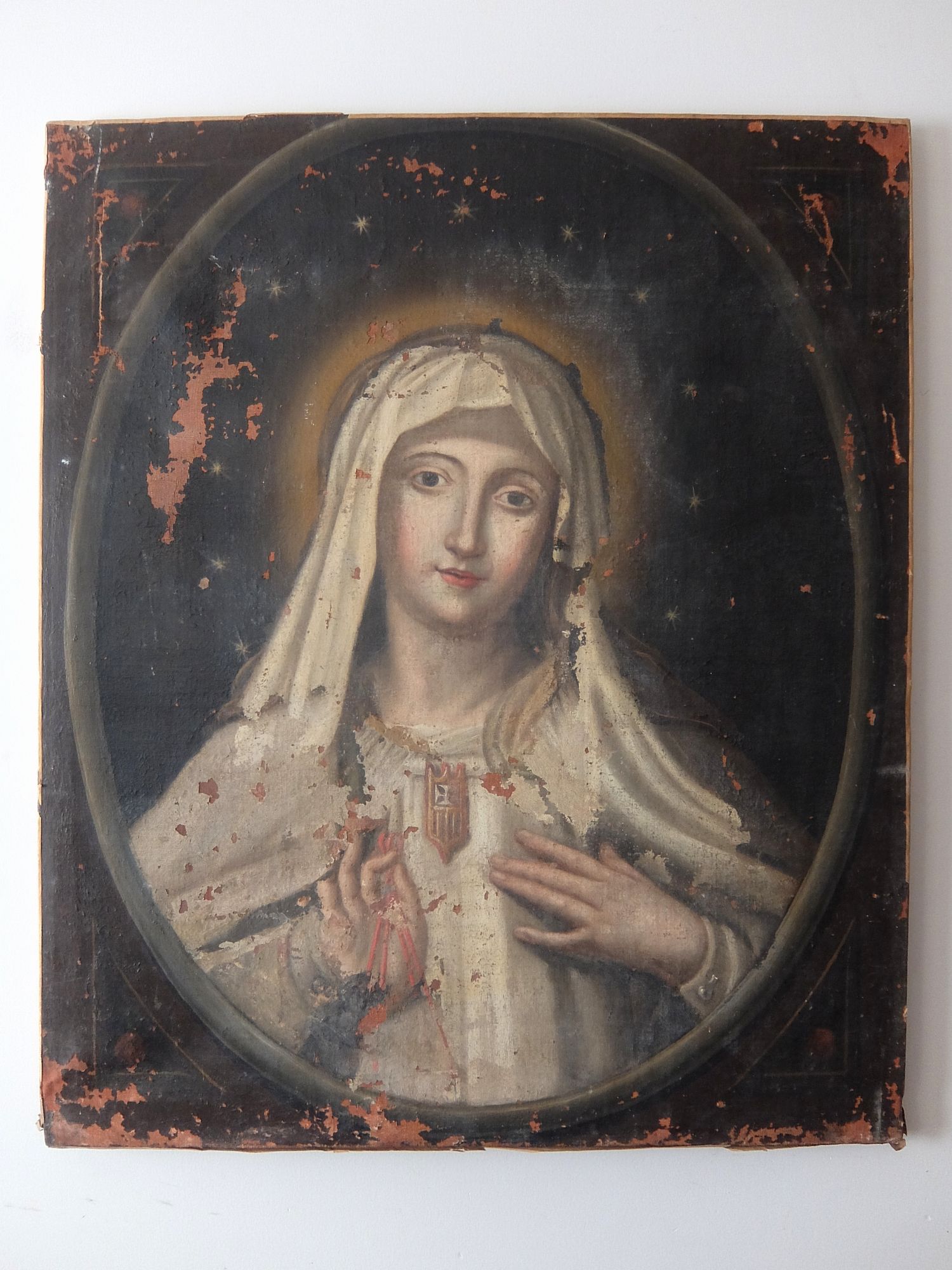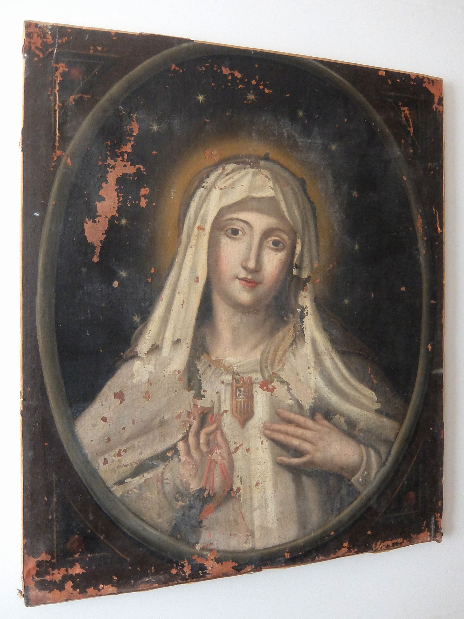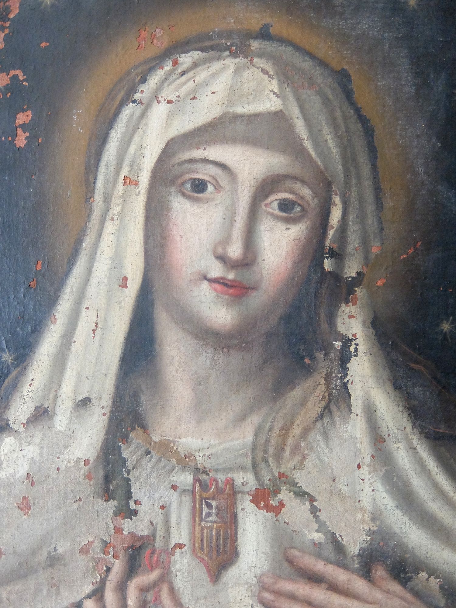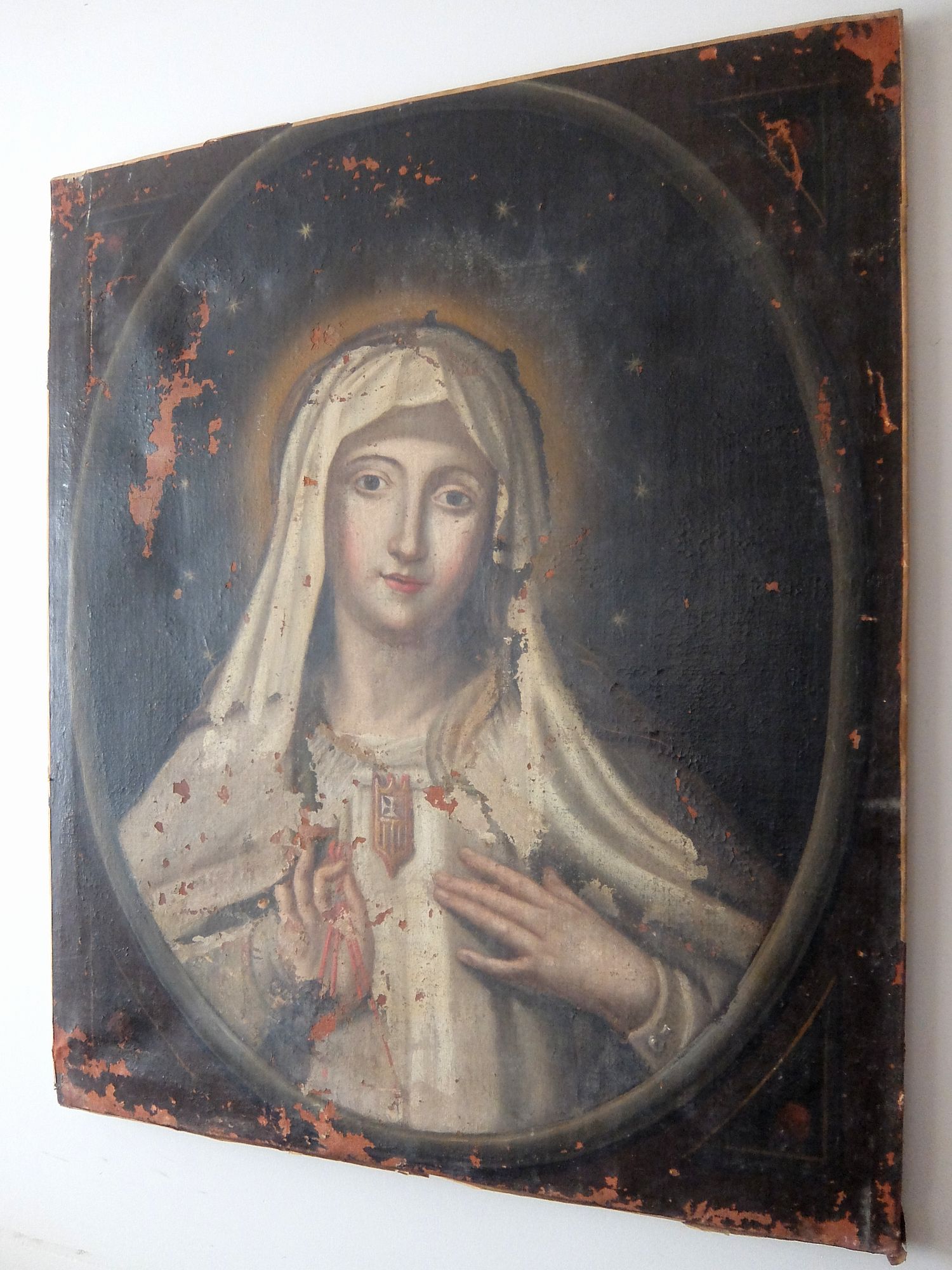 朽ちた雰囲気が美しい微笑みを浮かべた聖母マリアの油絵