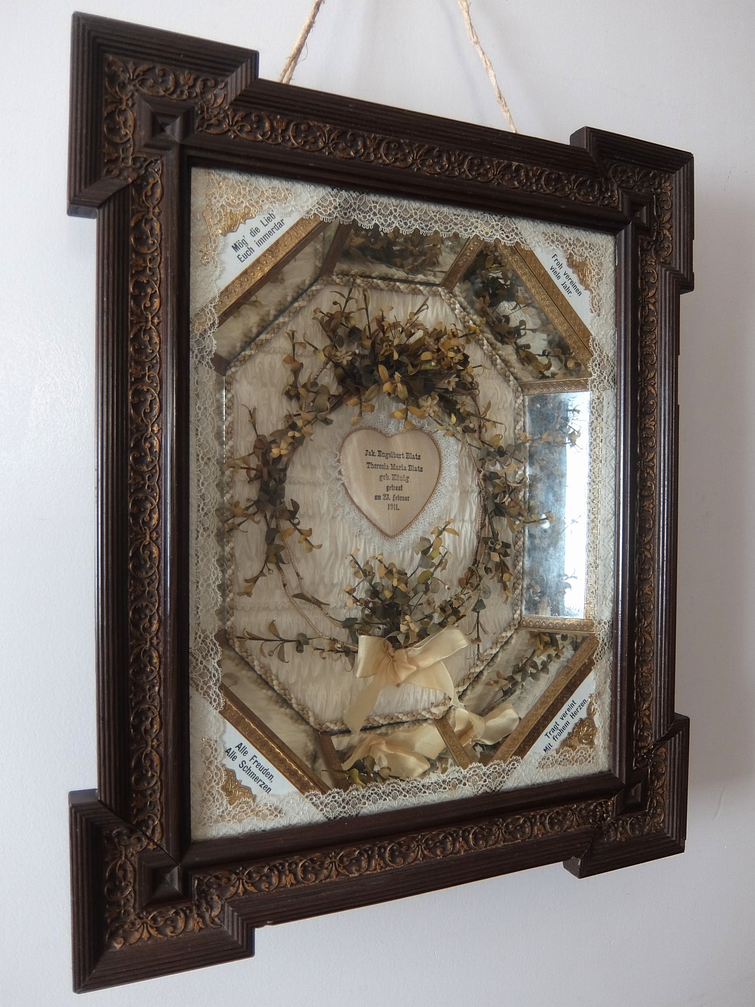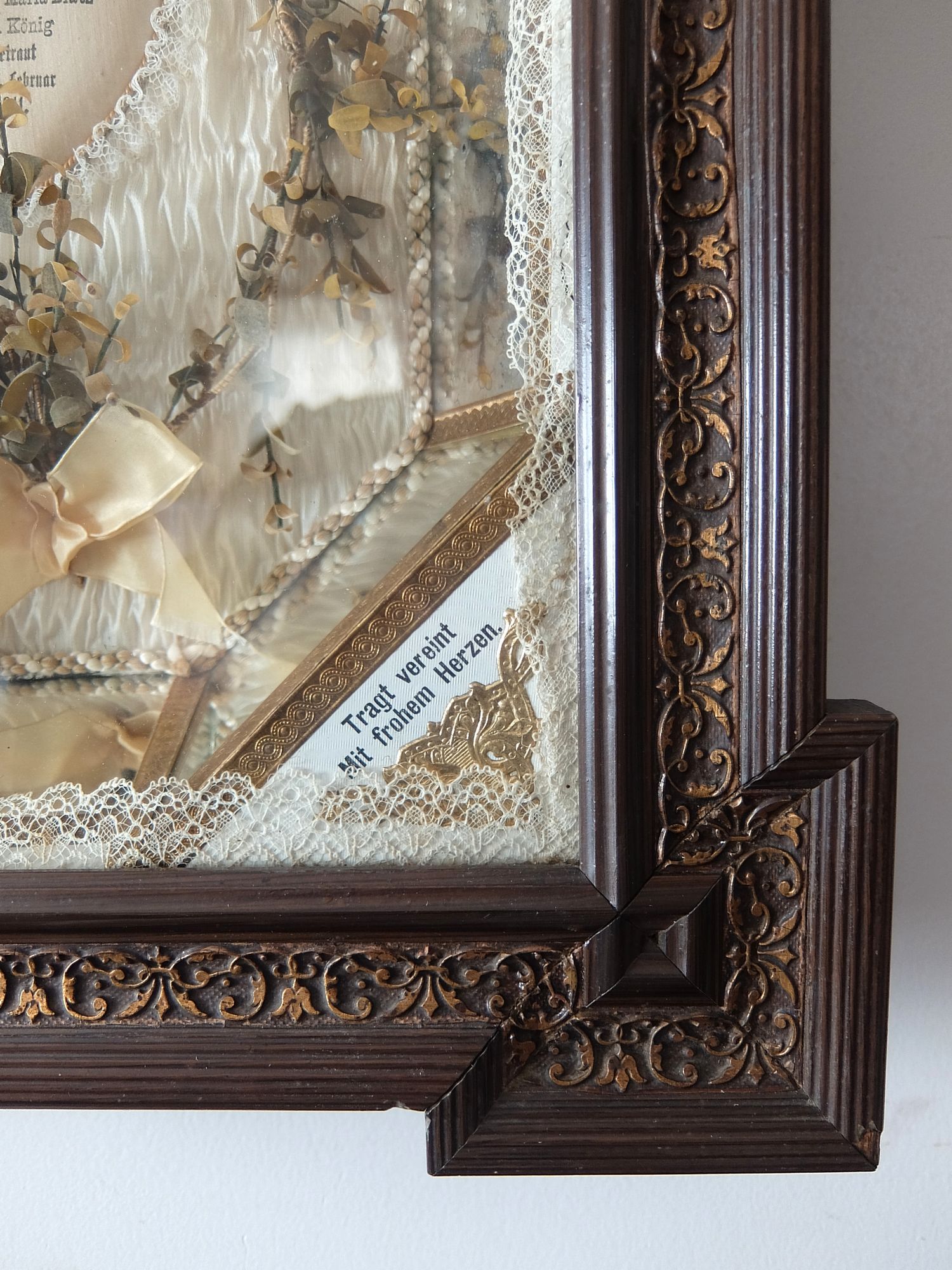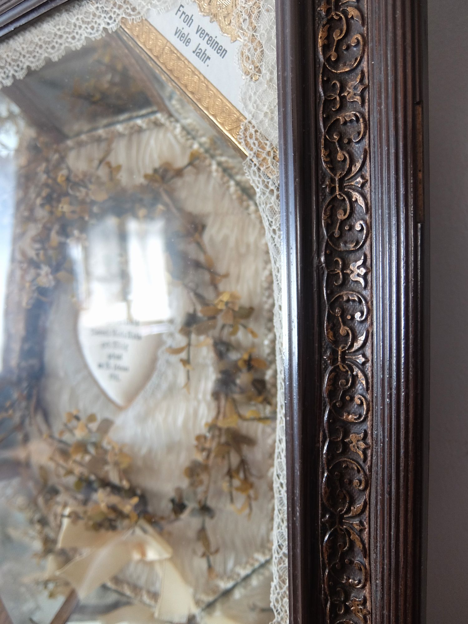 結婚式で着用されたワックスフラワーのヘッドリースの額装品