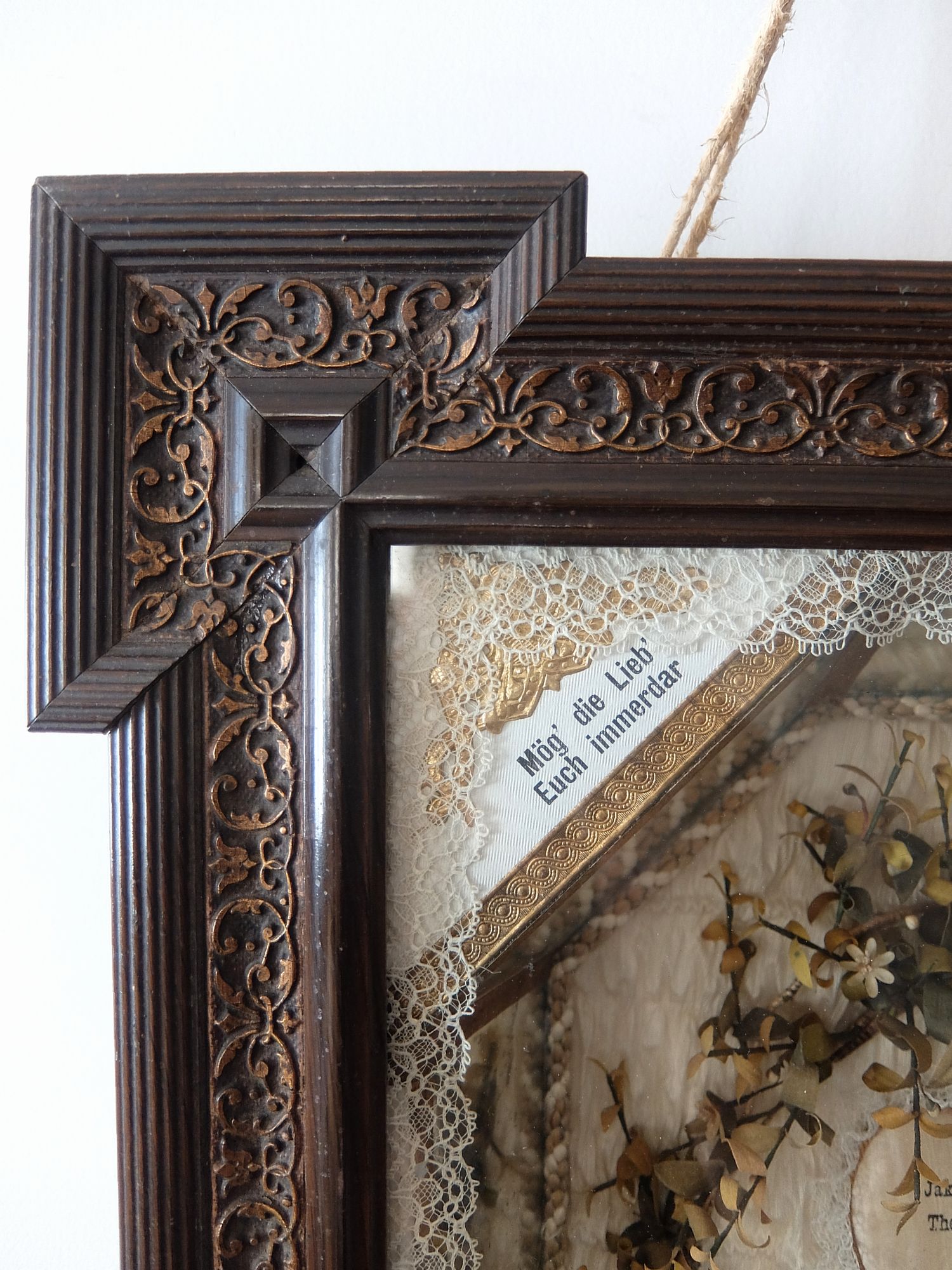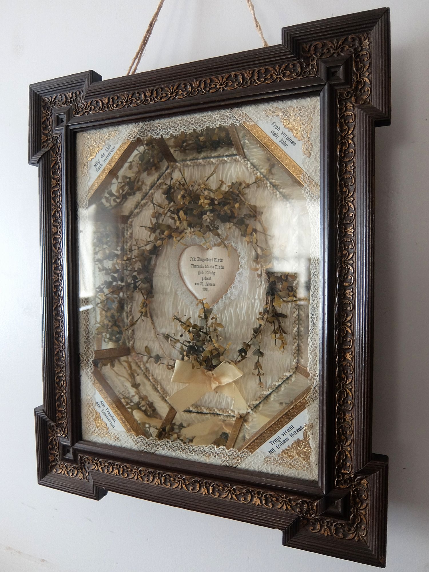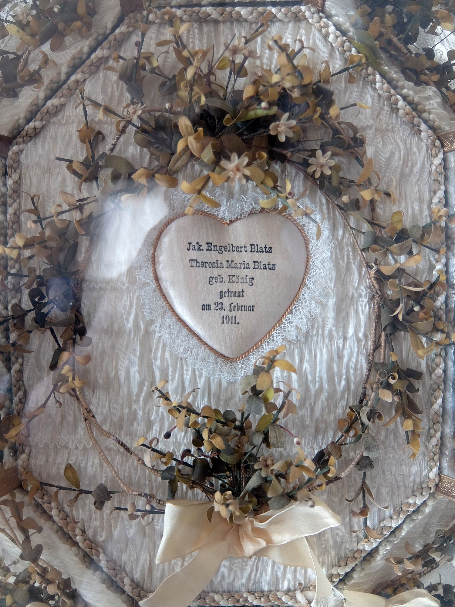 結婚式で着用されたワックスフラワーのヘッドリースの額装品