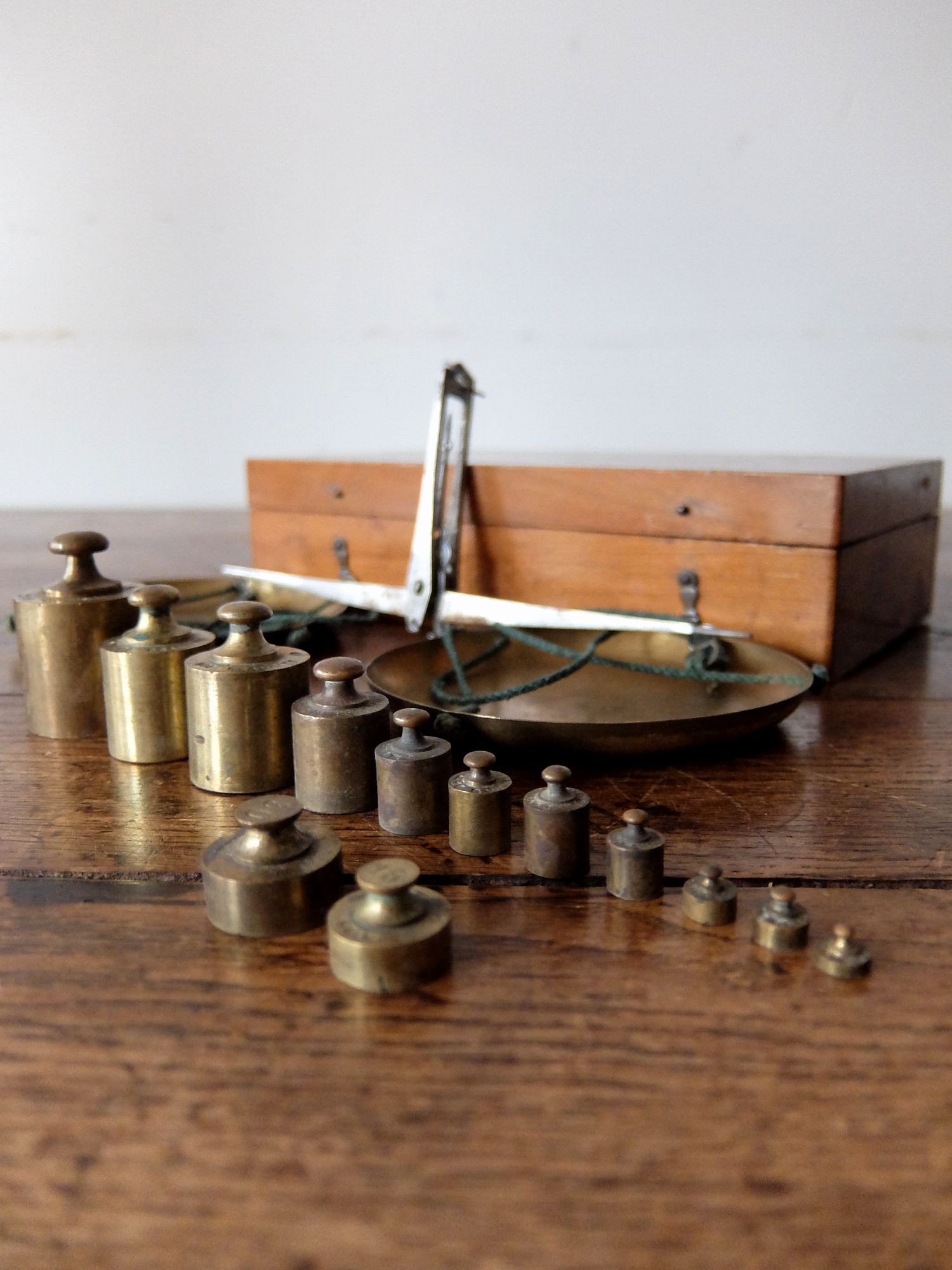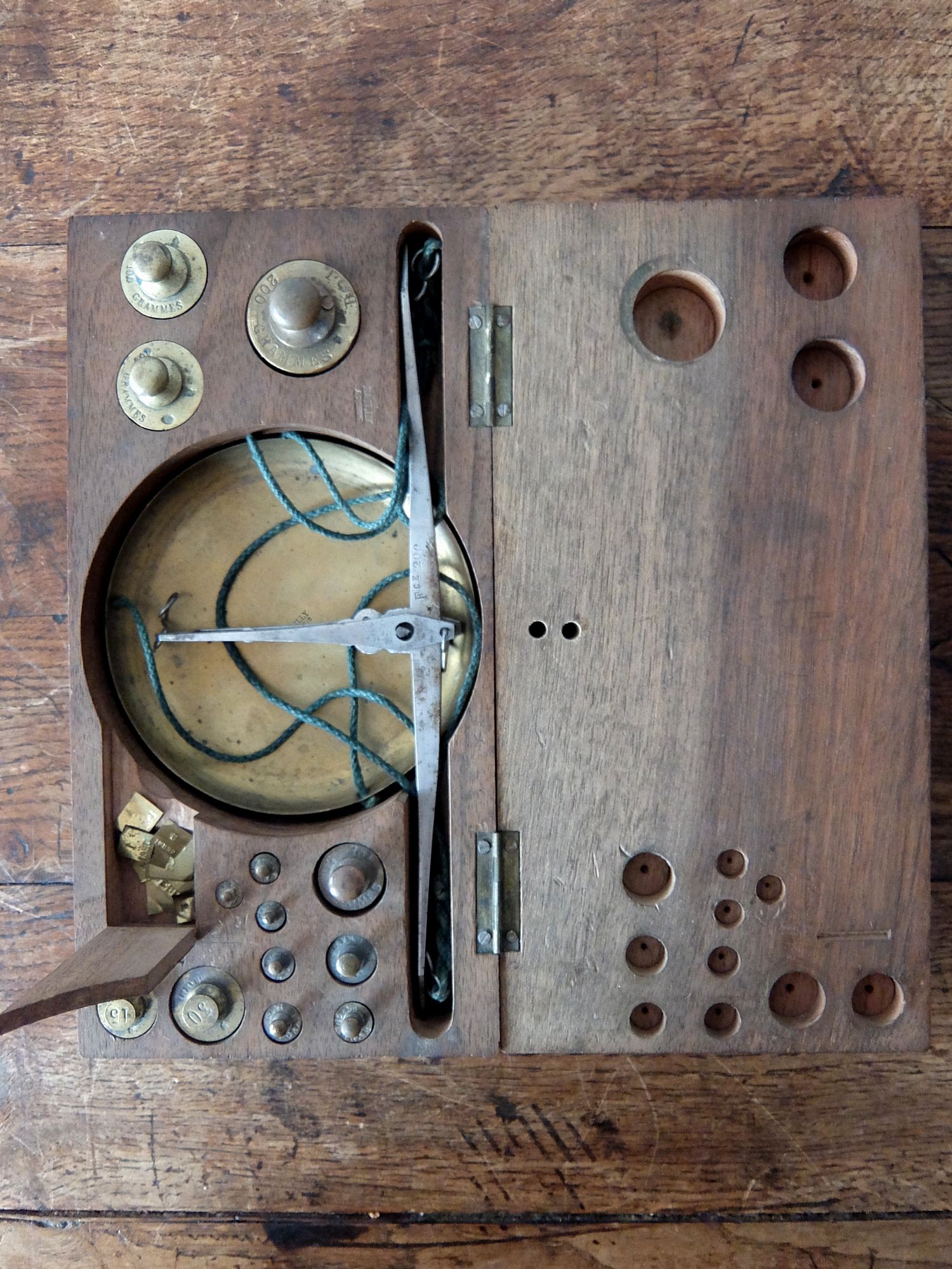 薬剤の調合で使用されていた携帯用の天秤と分銅(箱付き)