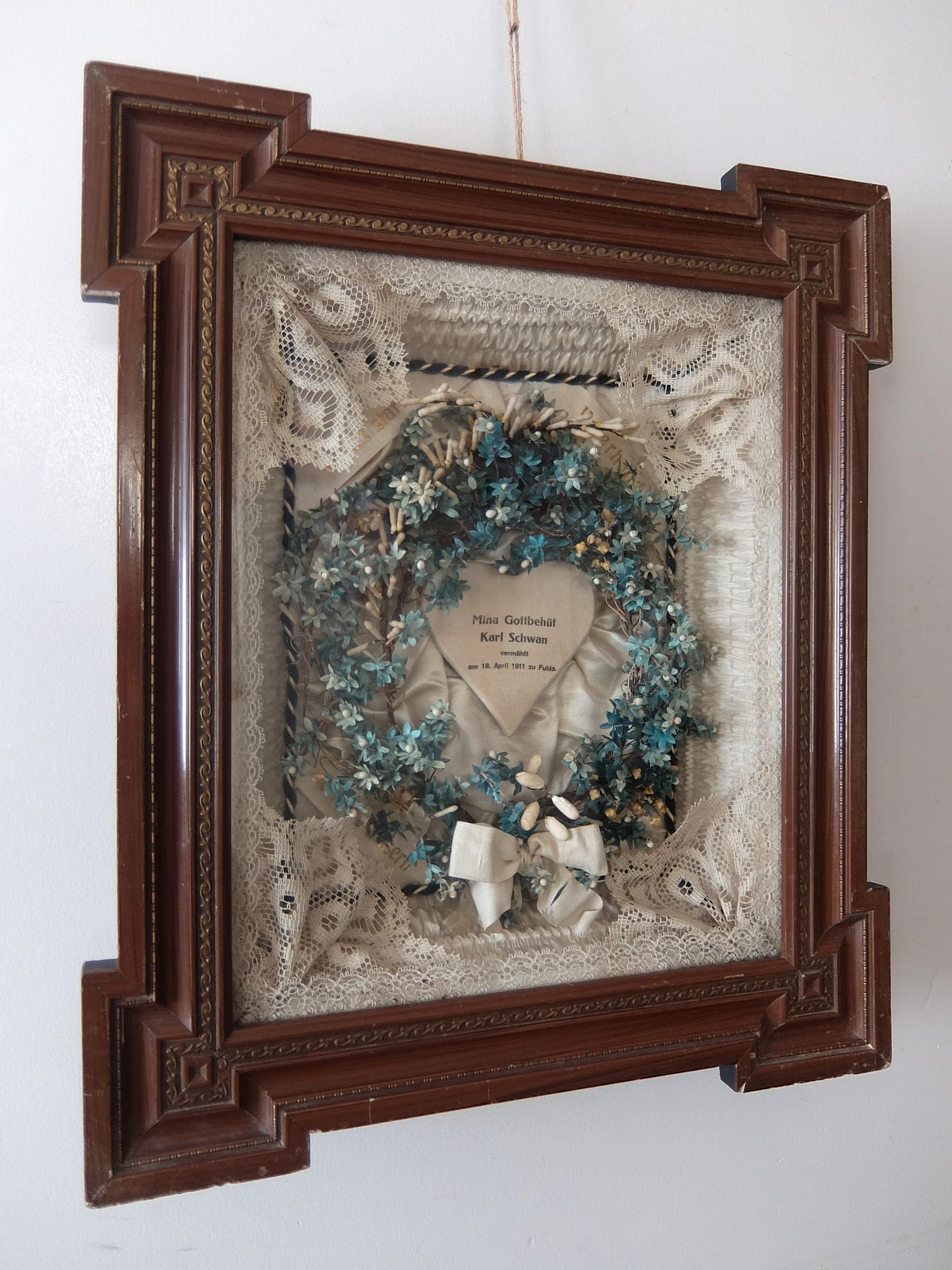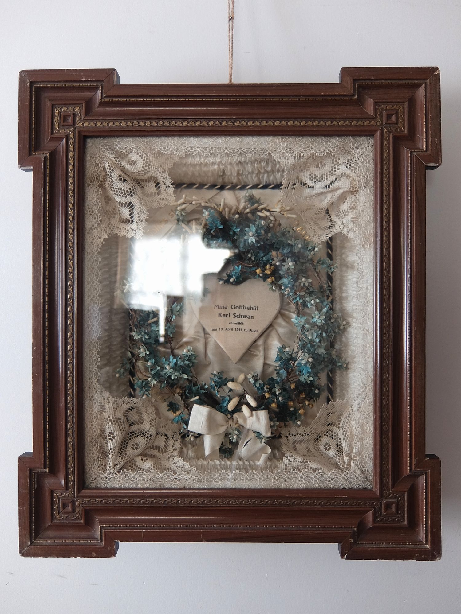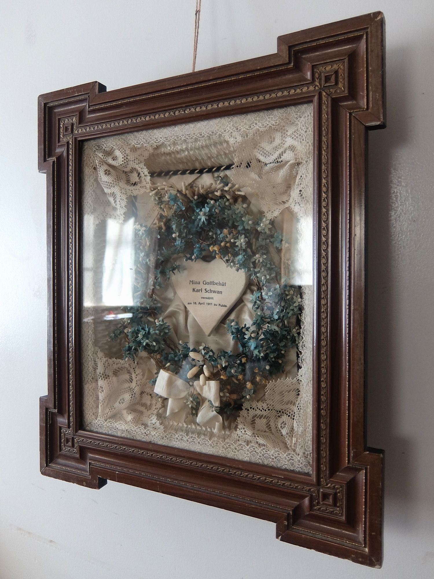 結婚式で着用されたワックスフラワーのヘッドリースの額装品