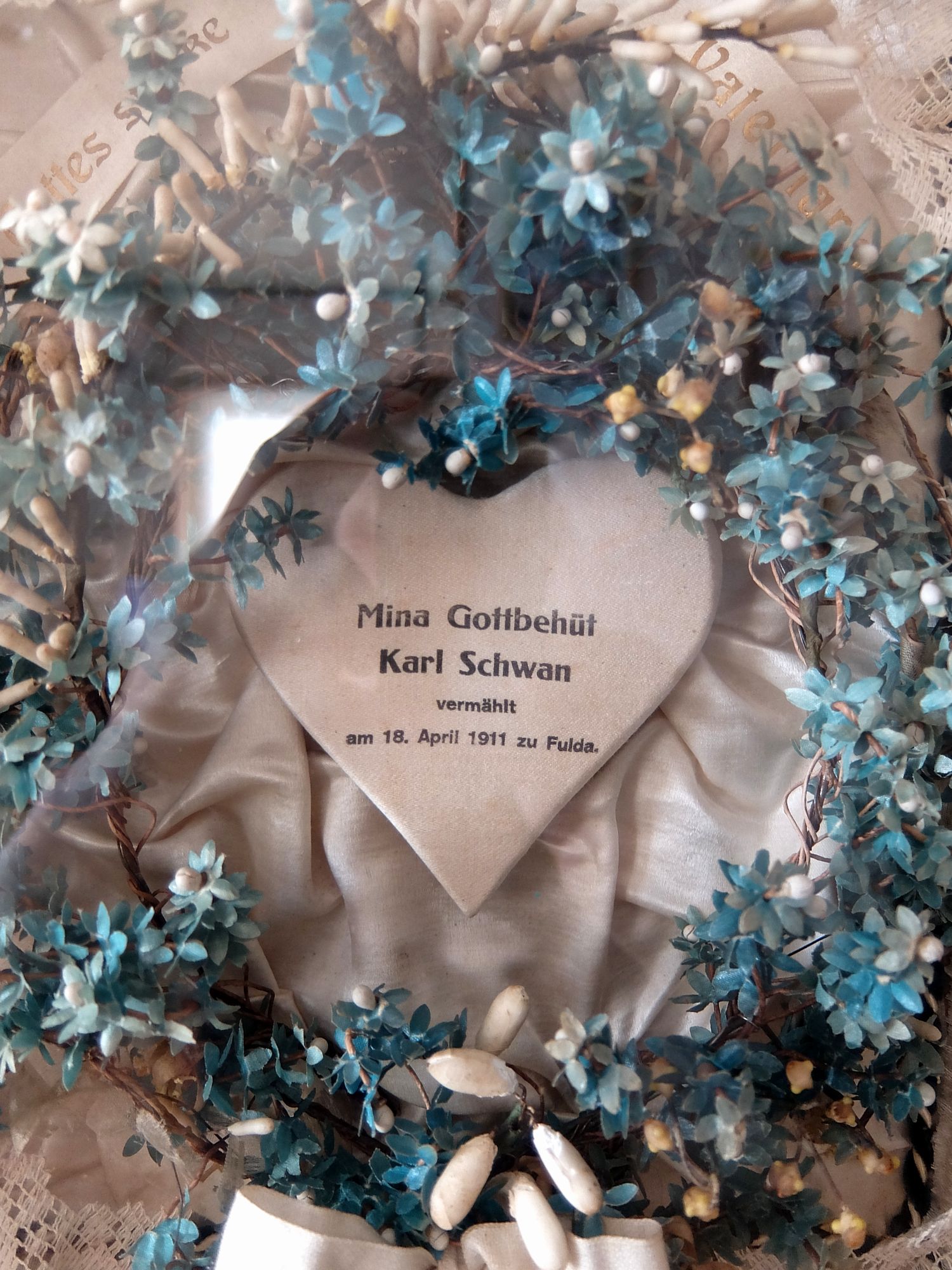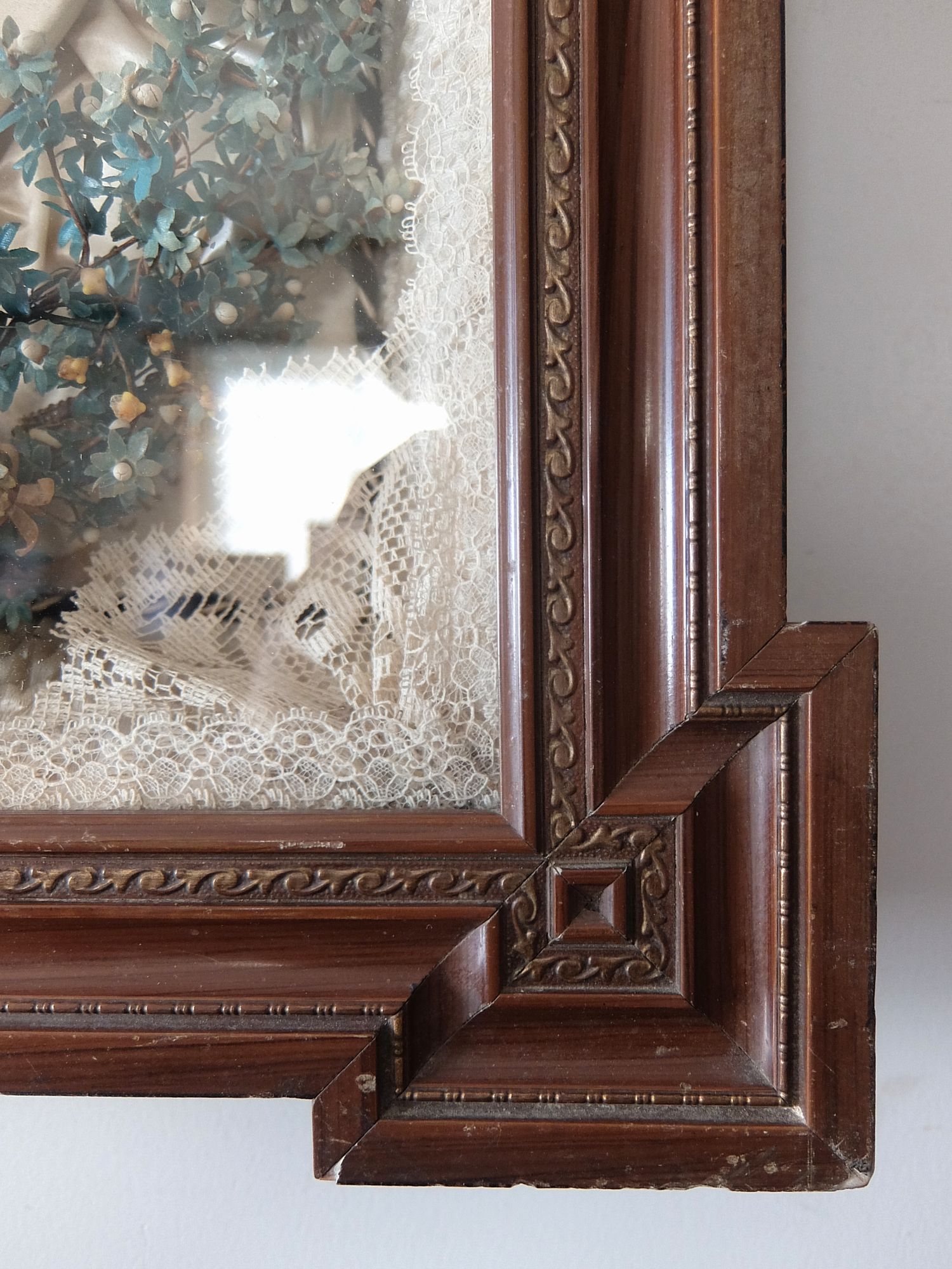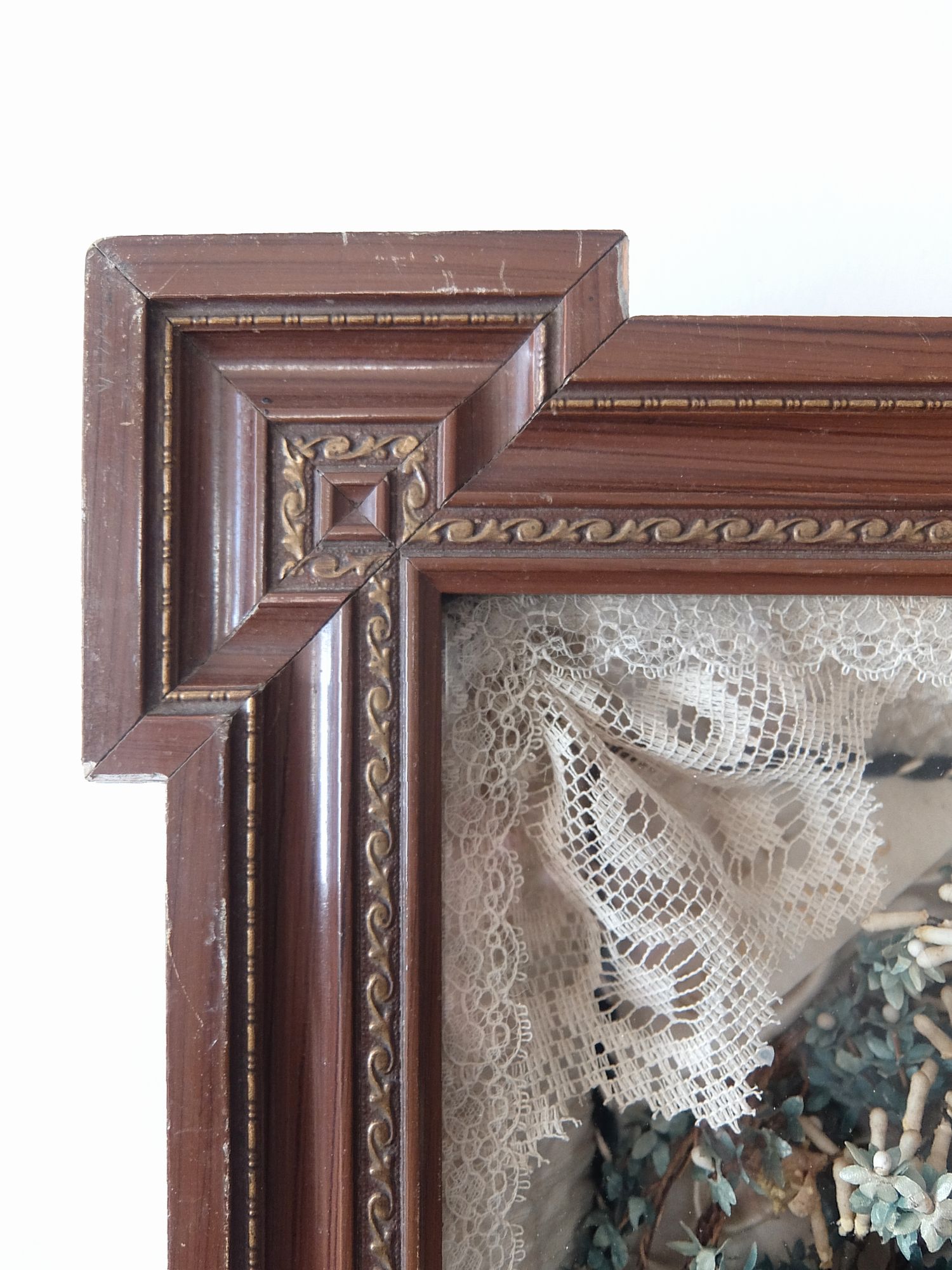 結婚式で着用されたワックスフラワーのヘッドリースの額装品
