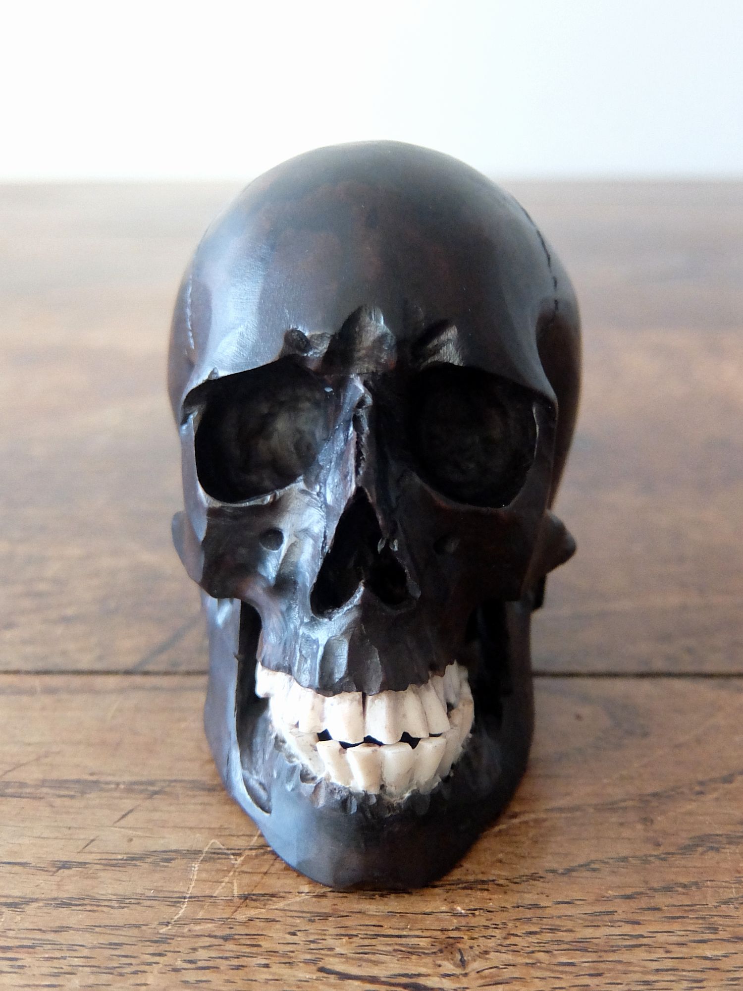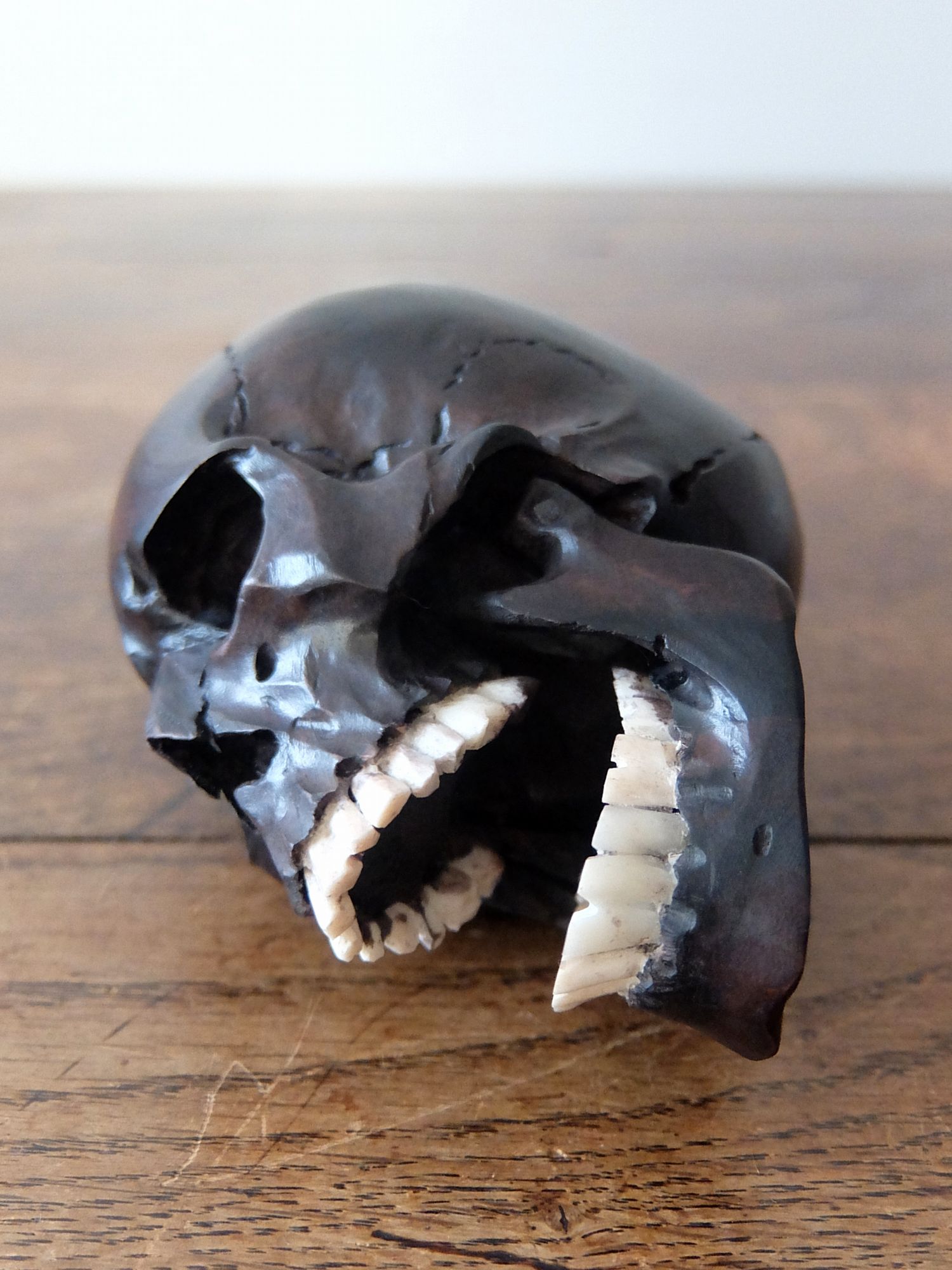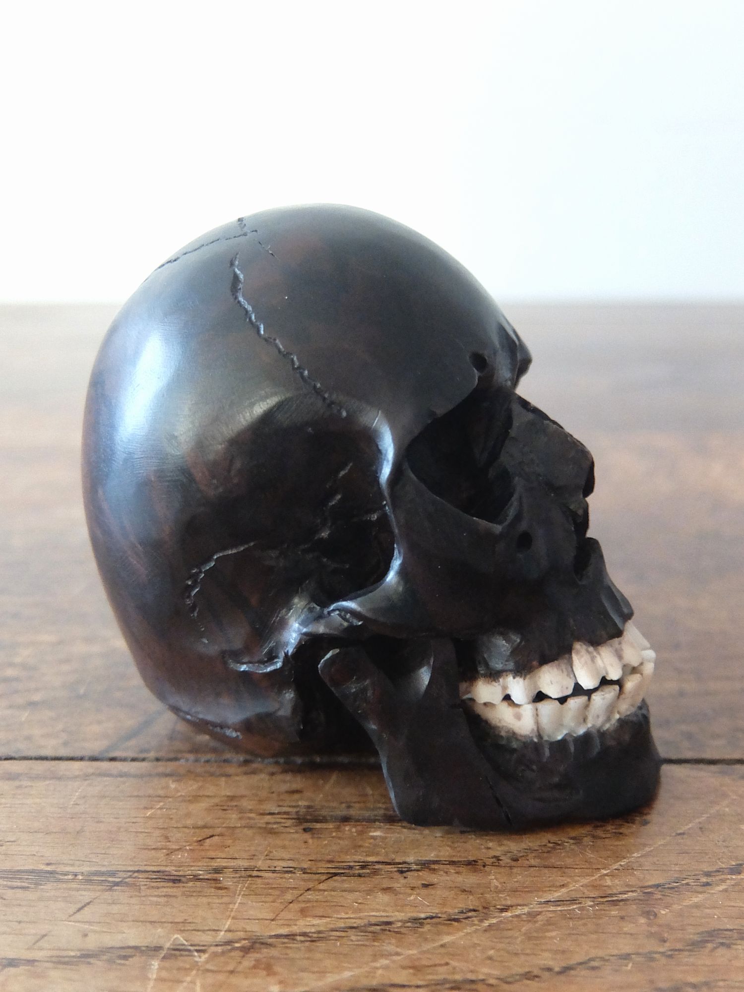顎関節が可動する黒檀を削り出して製作された頭蓋骨のオブジェ (歯部:動物の骨・角を使用)