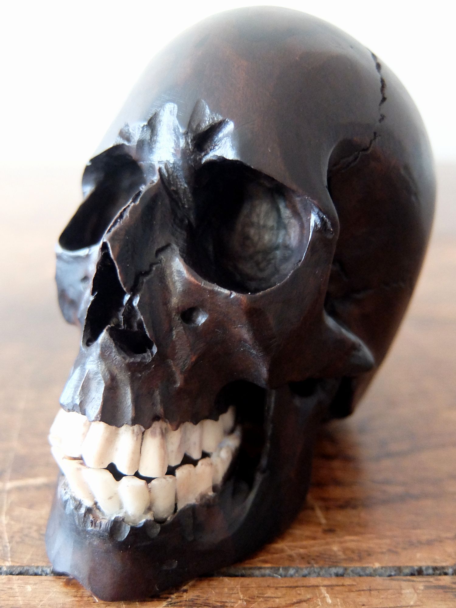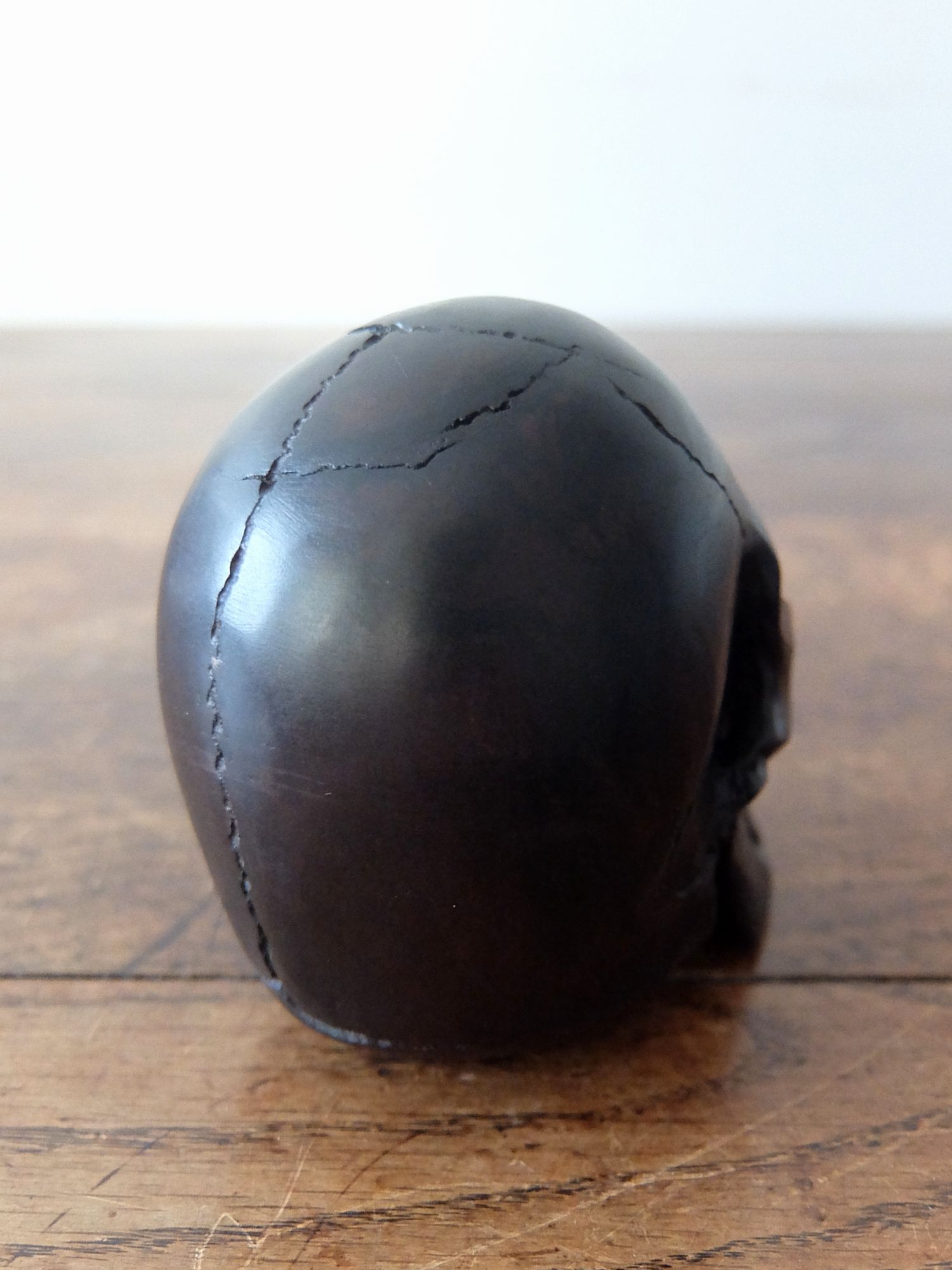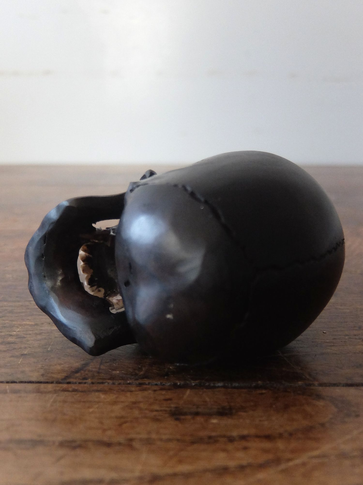 顎関節が可動する黒檀を削り出して製作された頭蓋骨のオブジェ (歯部:動物の骨・角を使用)