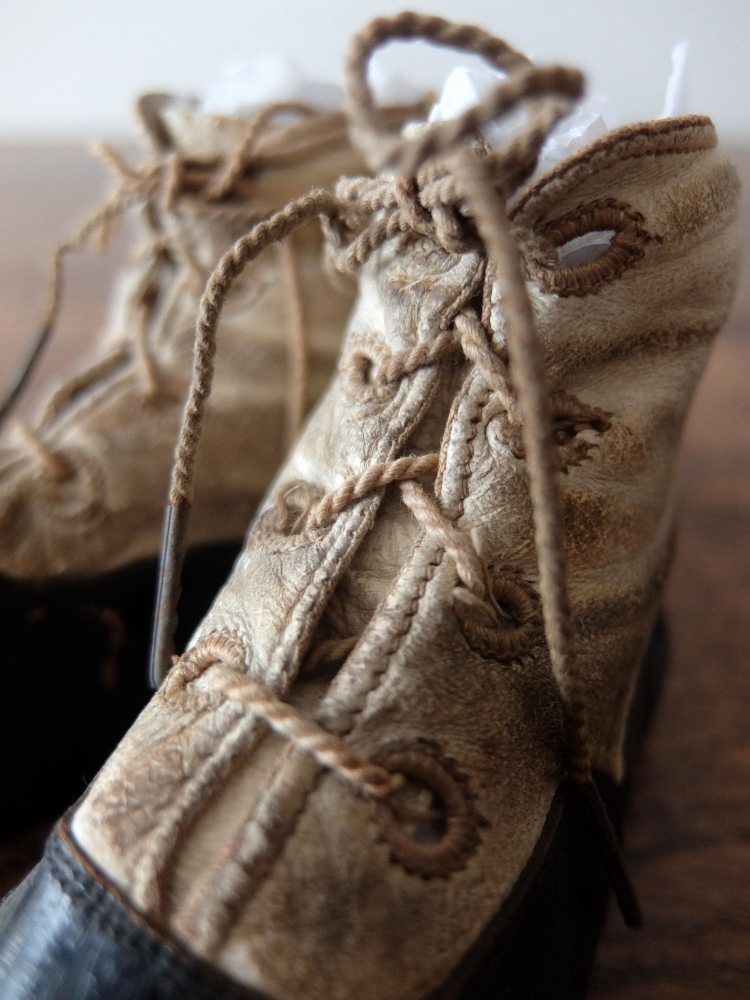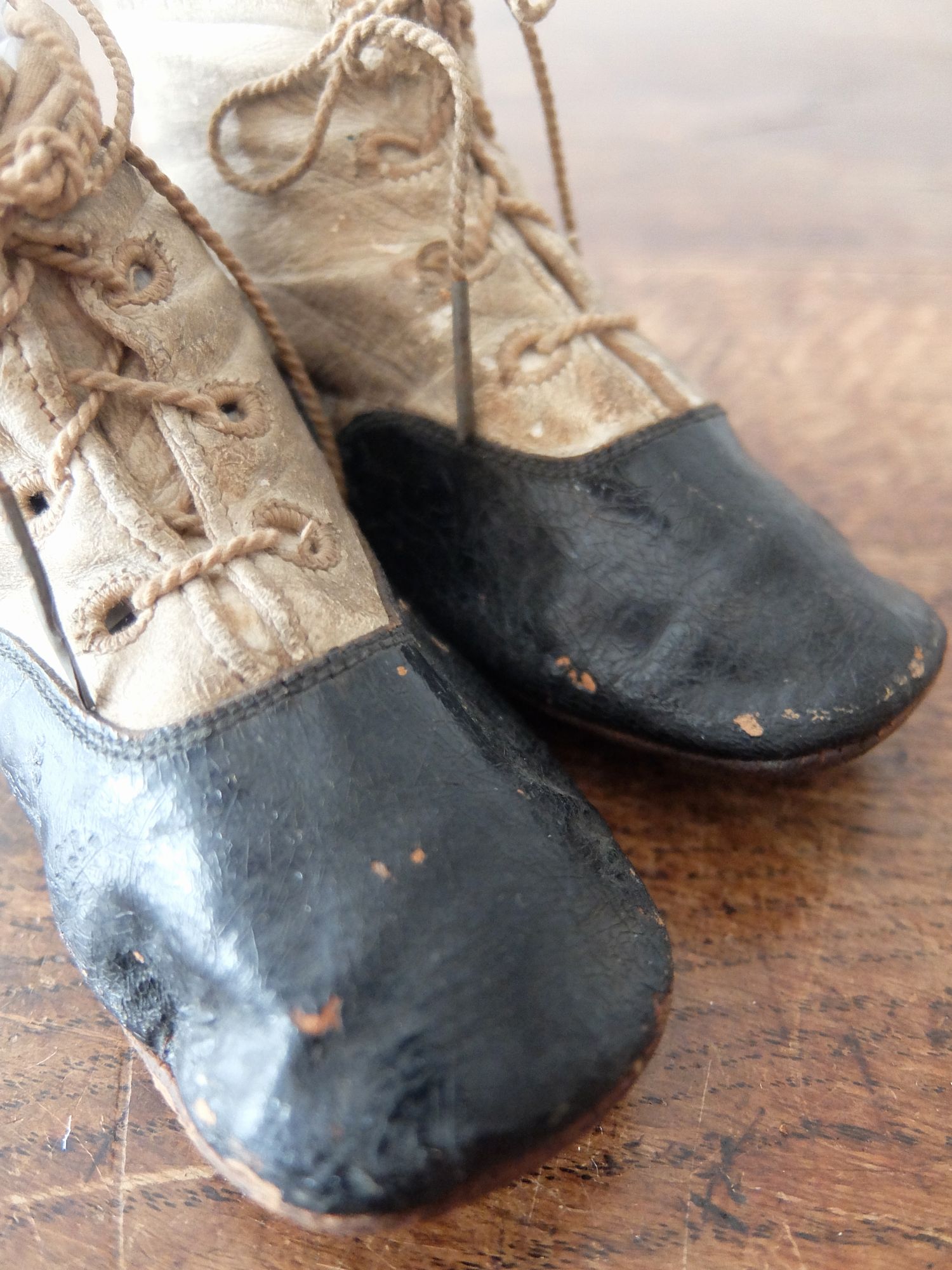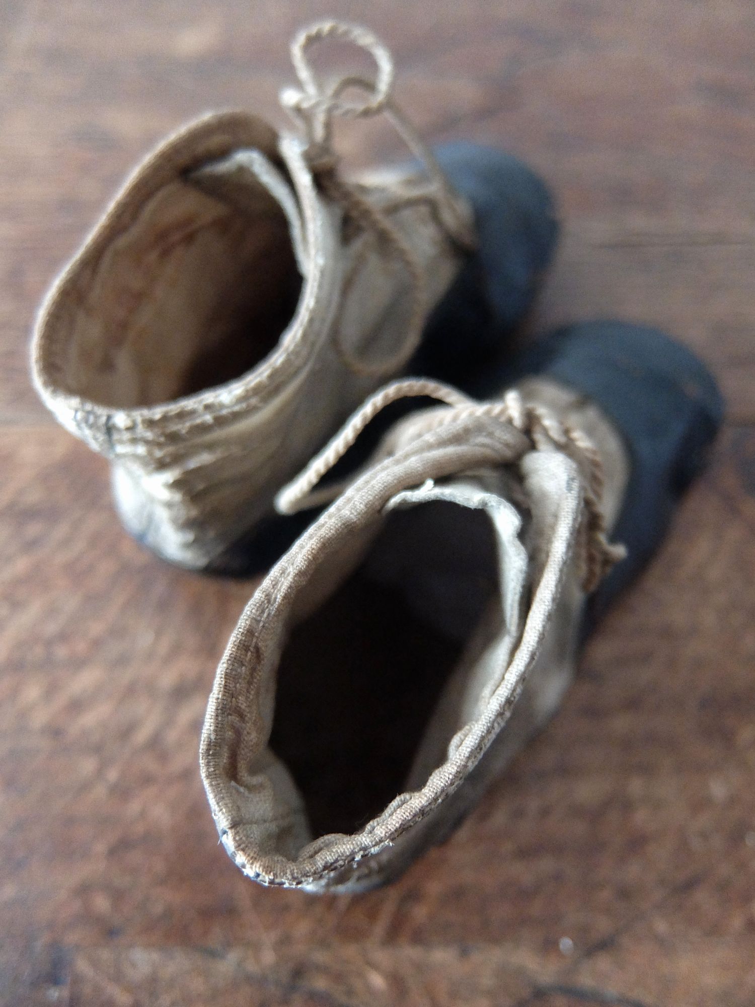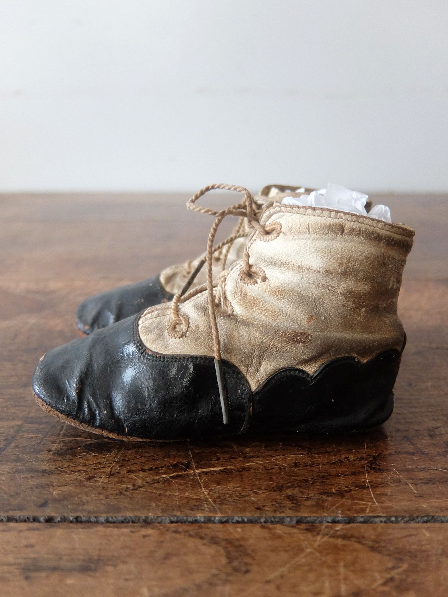 使い込まれた革の雰囲気が魅力的な子供用/人形用のベビーシューズ