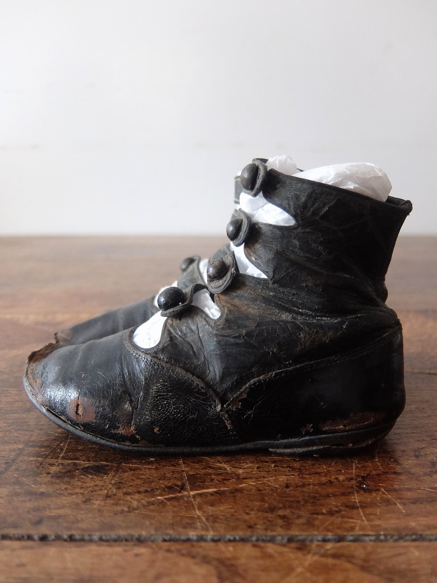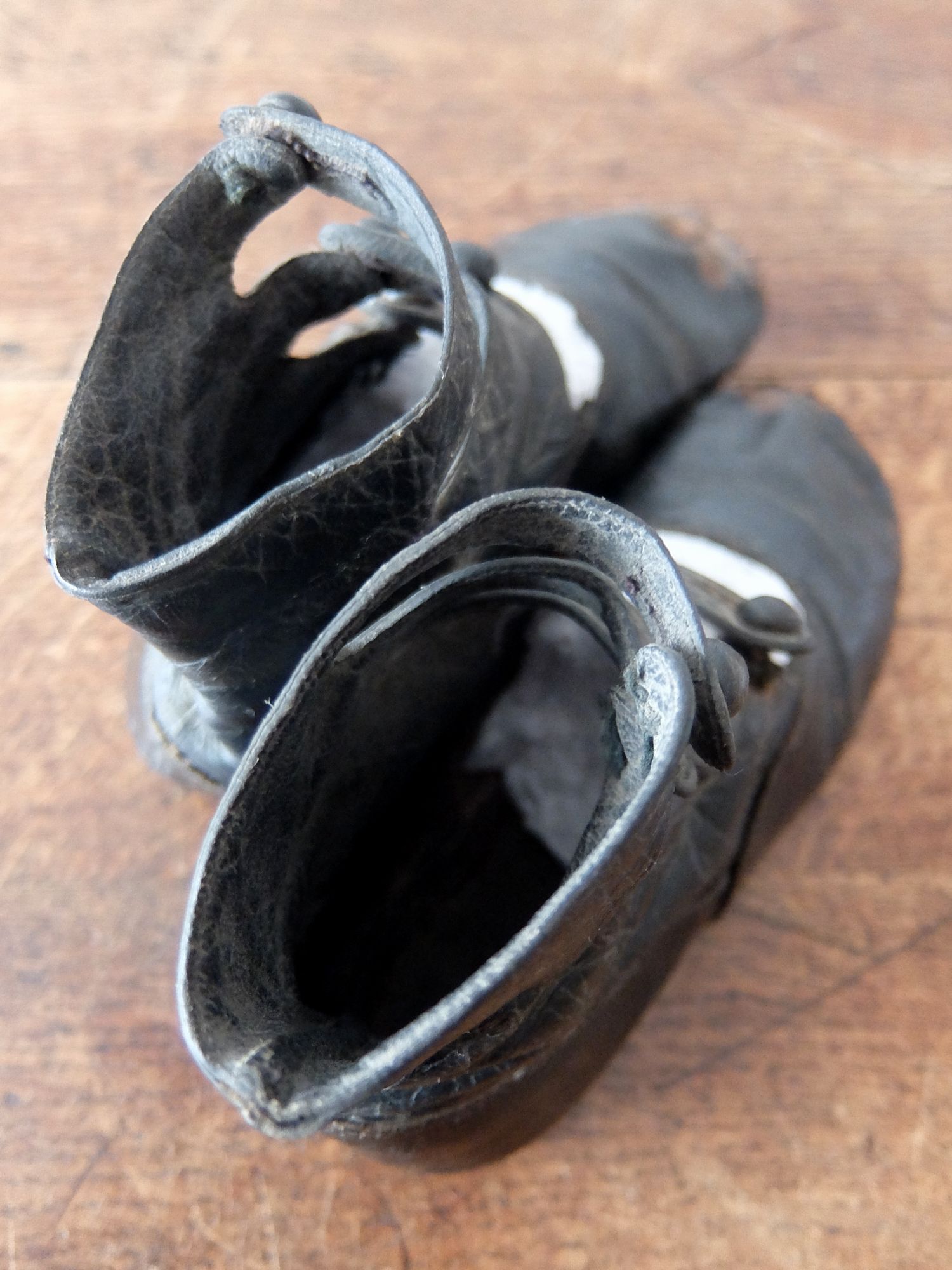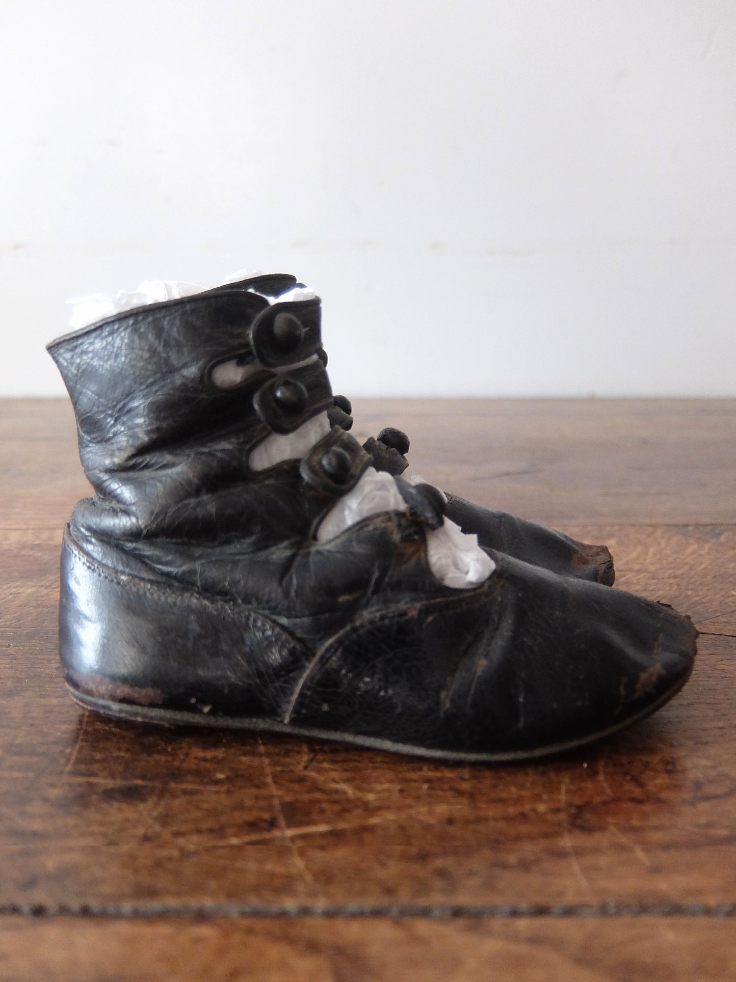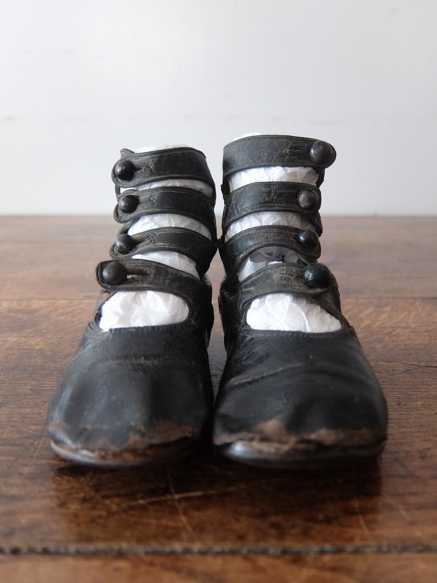 使い込まれた革の雰囲気が魅力的な子供用/人形用のヴィクトリアンベビーシューズ
