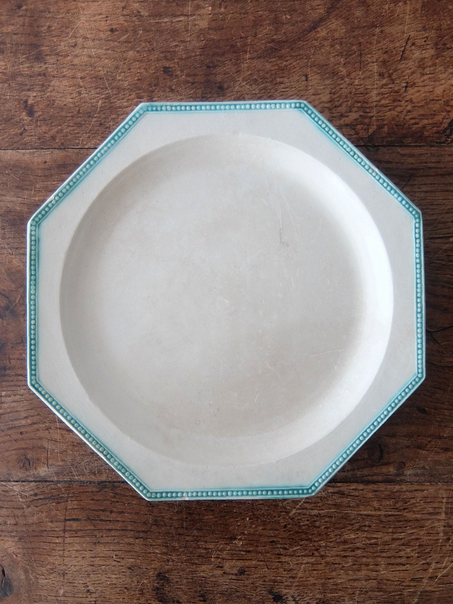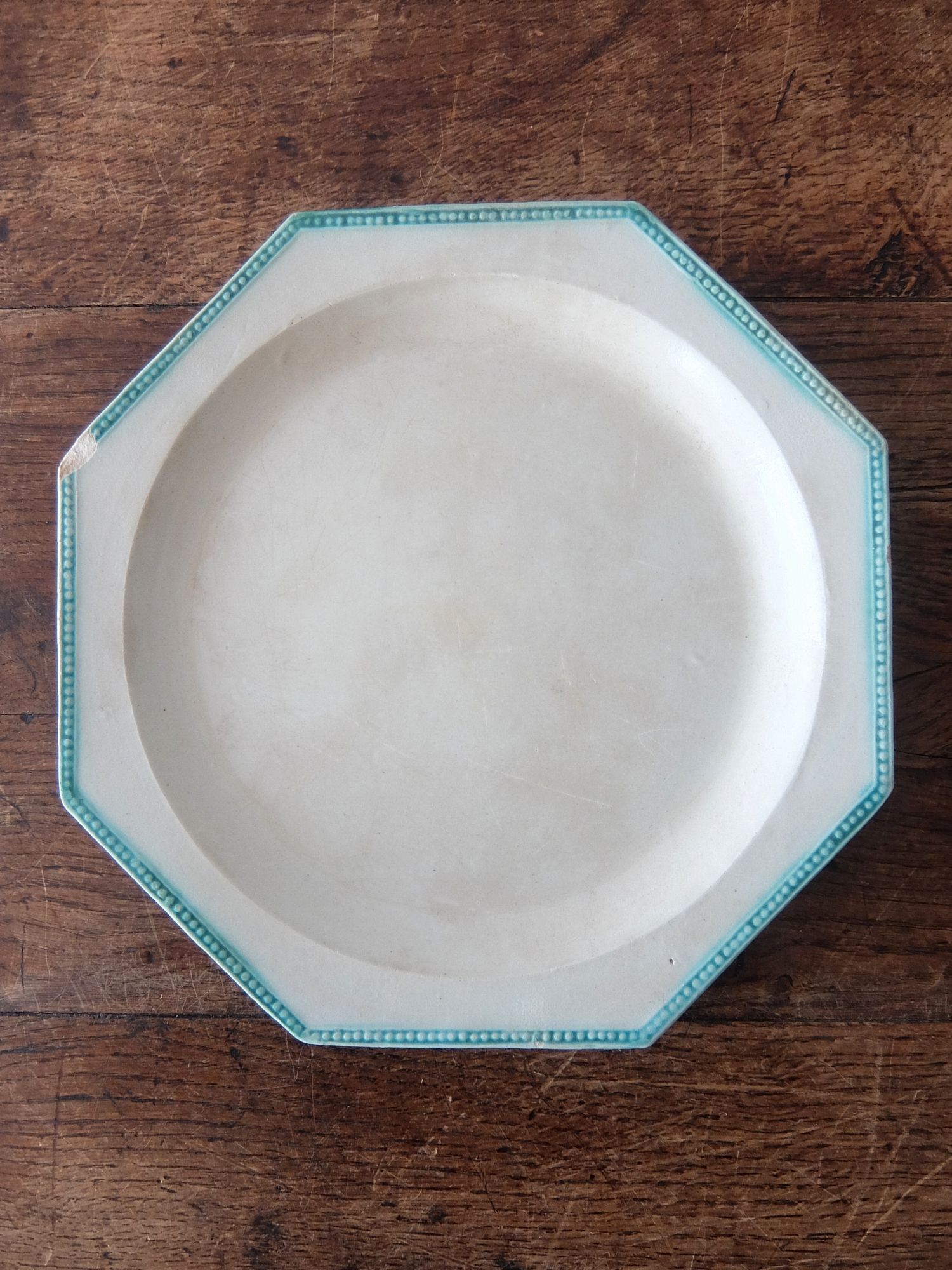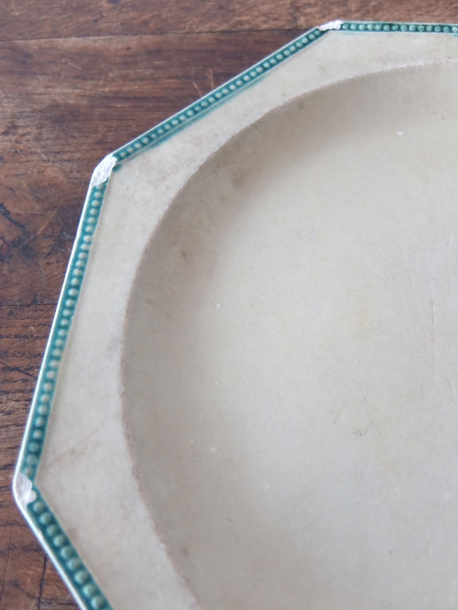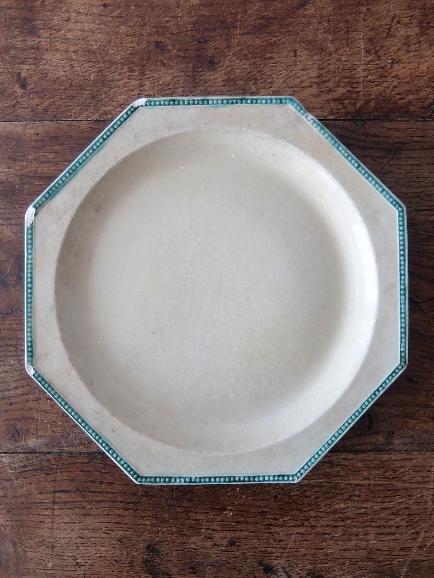 緑色に彩色されたリムと経年の雰囲気が美しいオクトゴナルの平皿(窯元はおそらく【Montereau】)