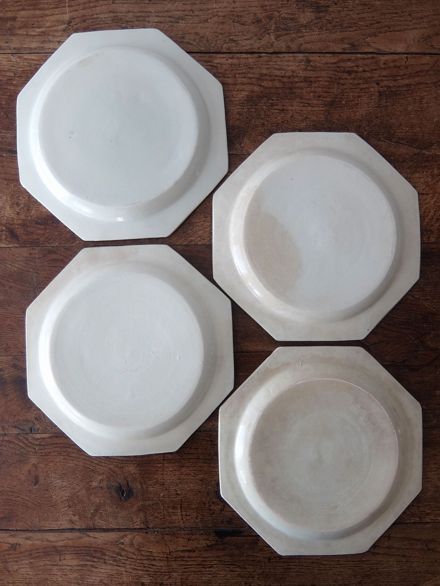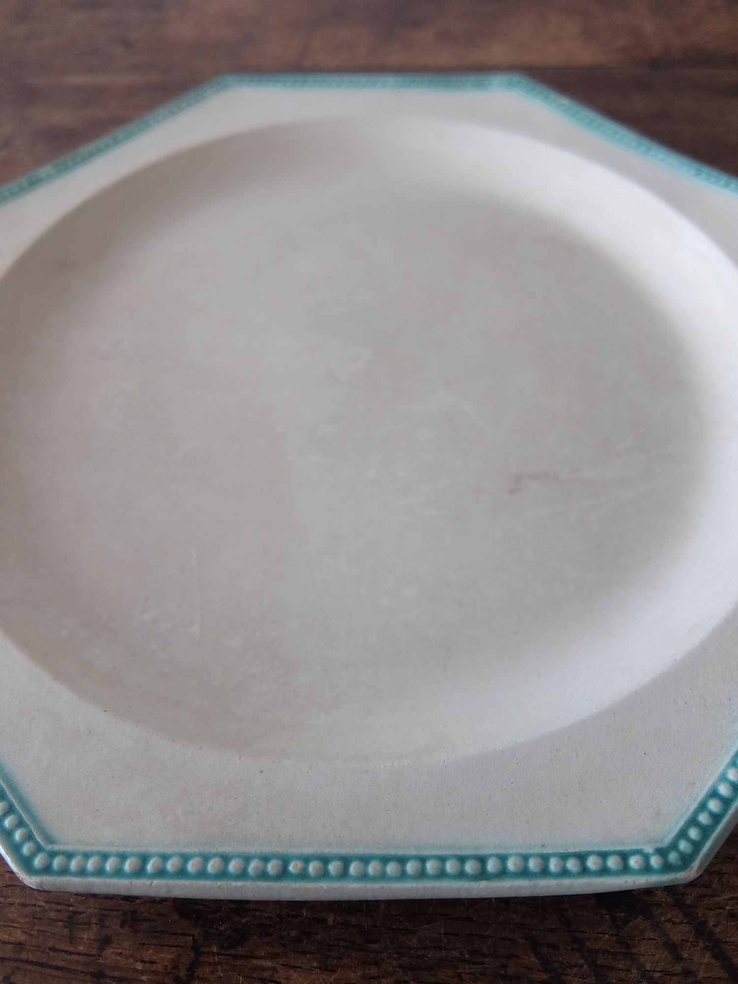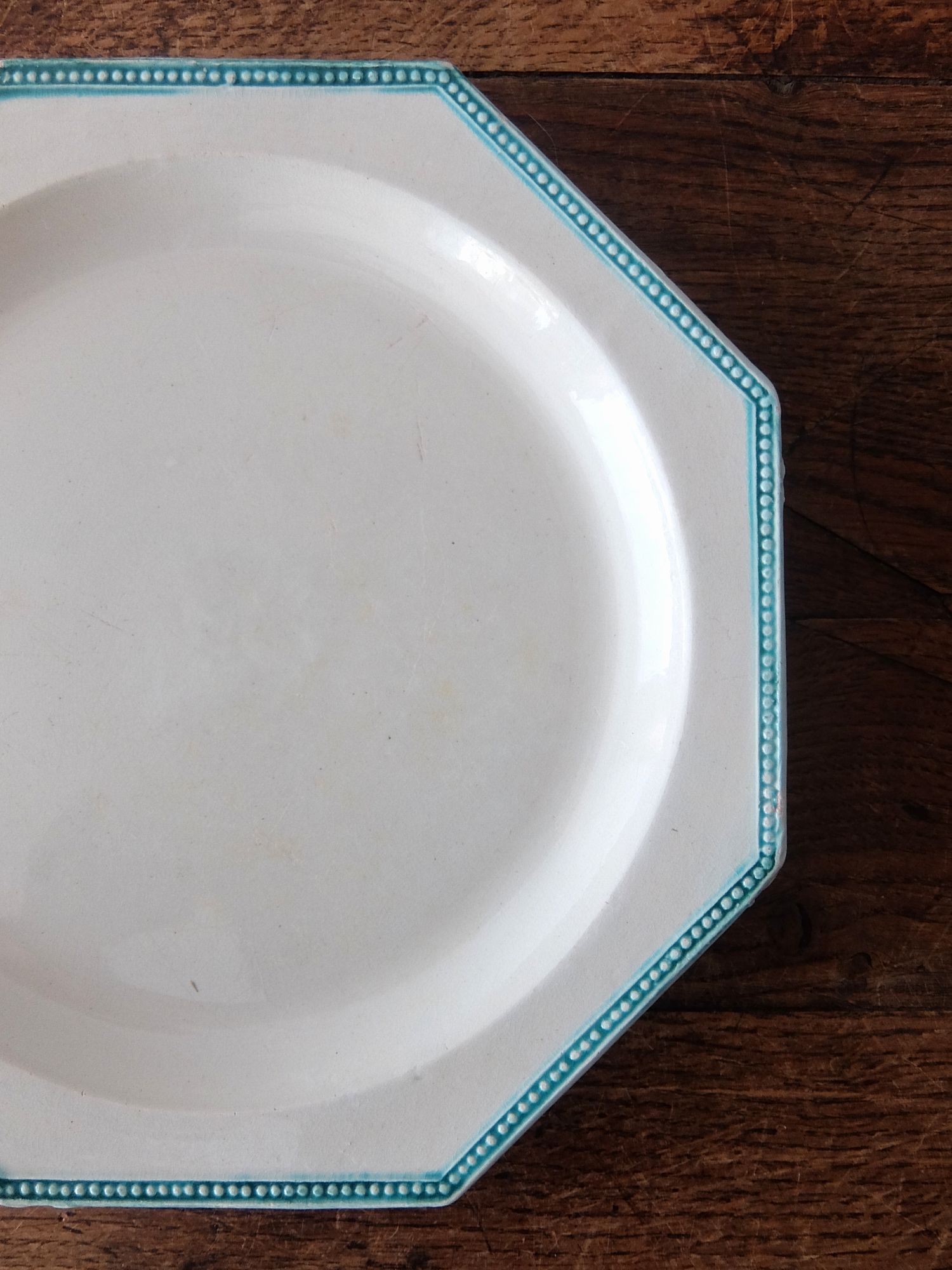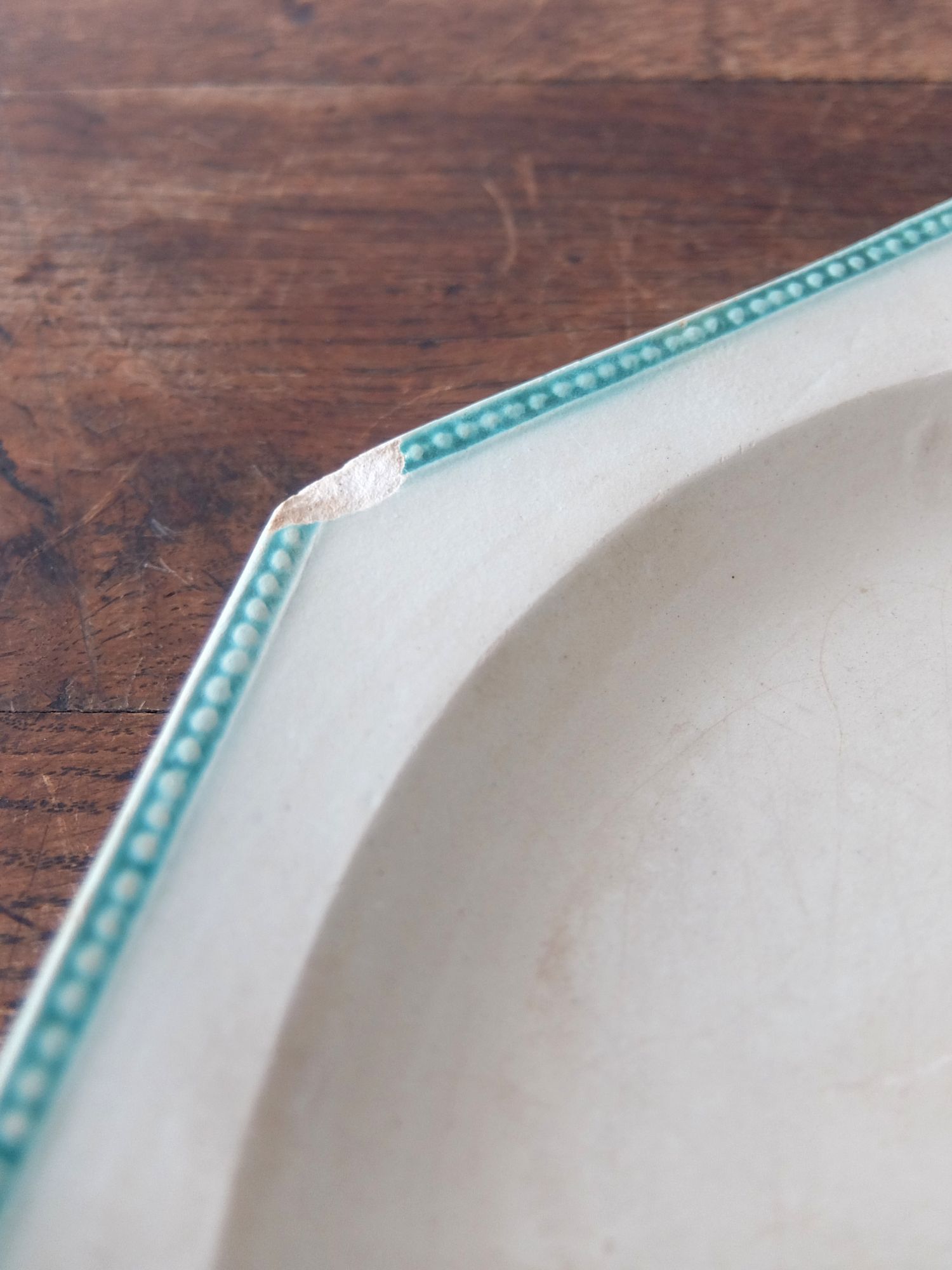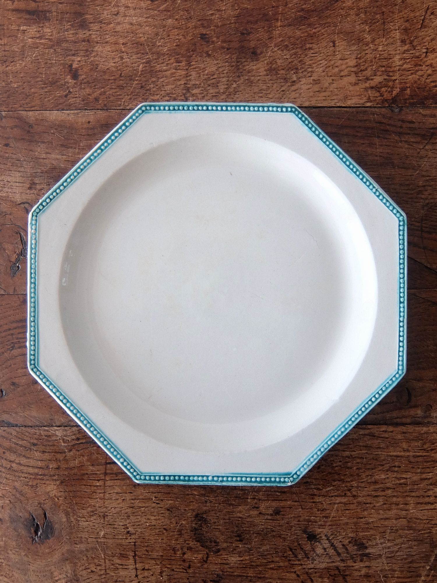 緑色に彩色されたリムと経年の雰囲気が美しいオクトゴナルの平皿(窯元はおそらく【Montereau】)