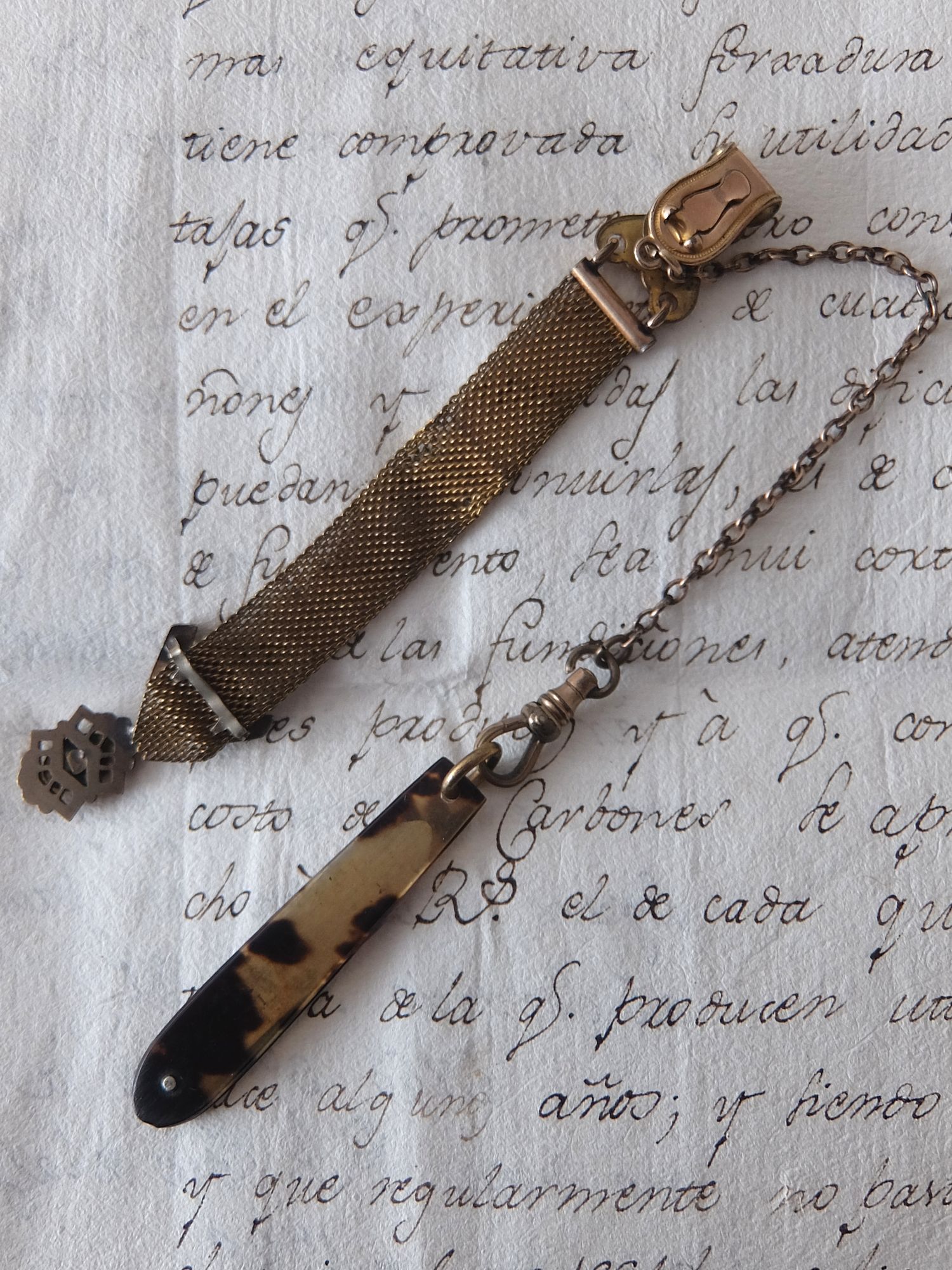 鼈甲の柄が美しい携帯用のペーパーナイフと金張りのフォブシール(印章)