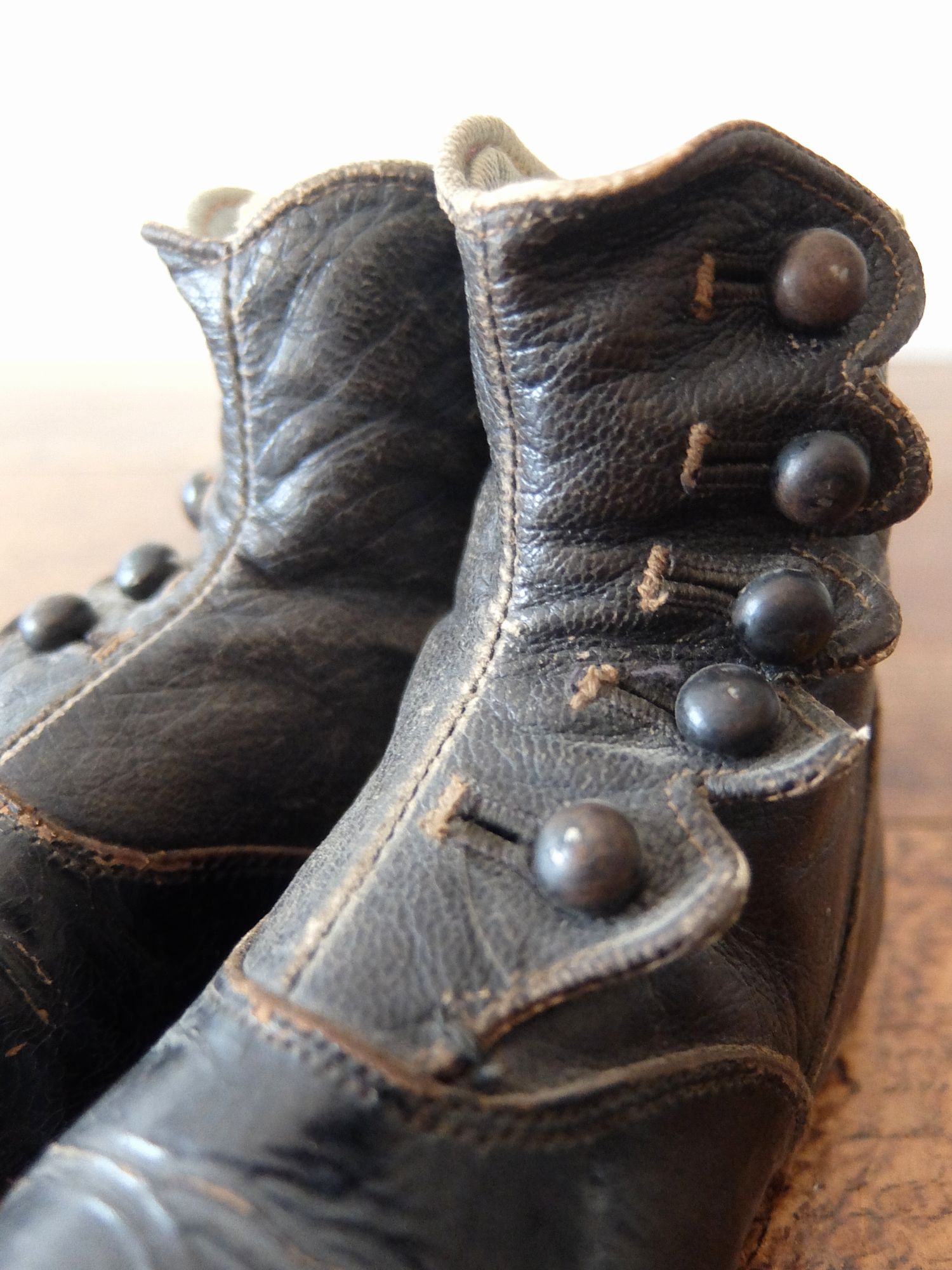 使い込まれた革の雰囲気が魅力的な子供用/人形用のヴィクトリアンベビーシューズ