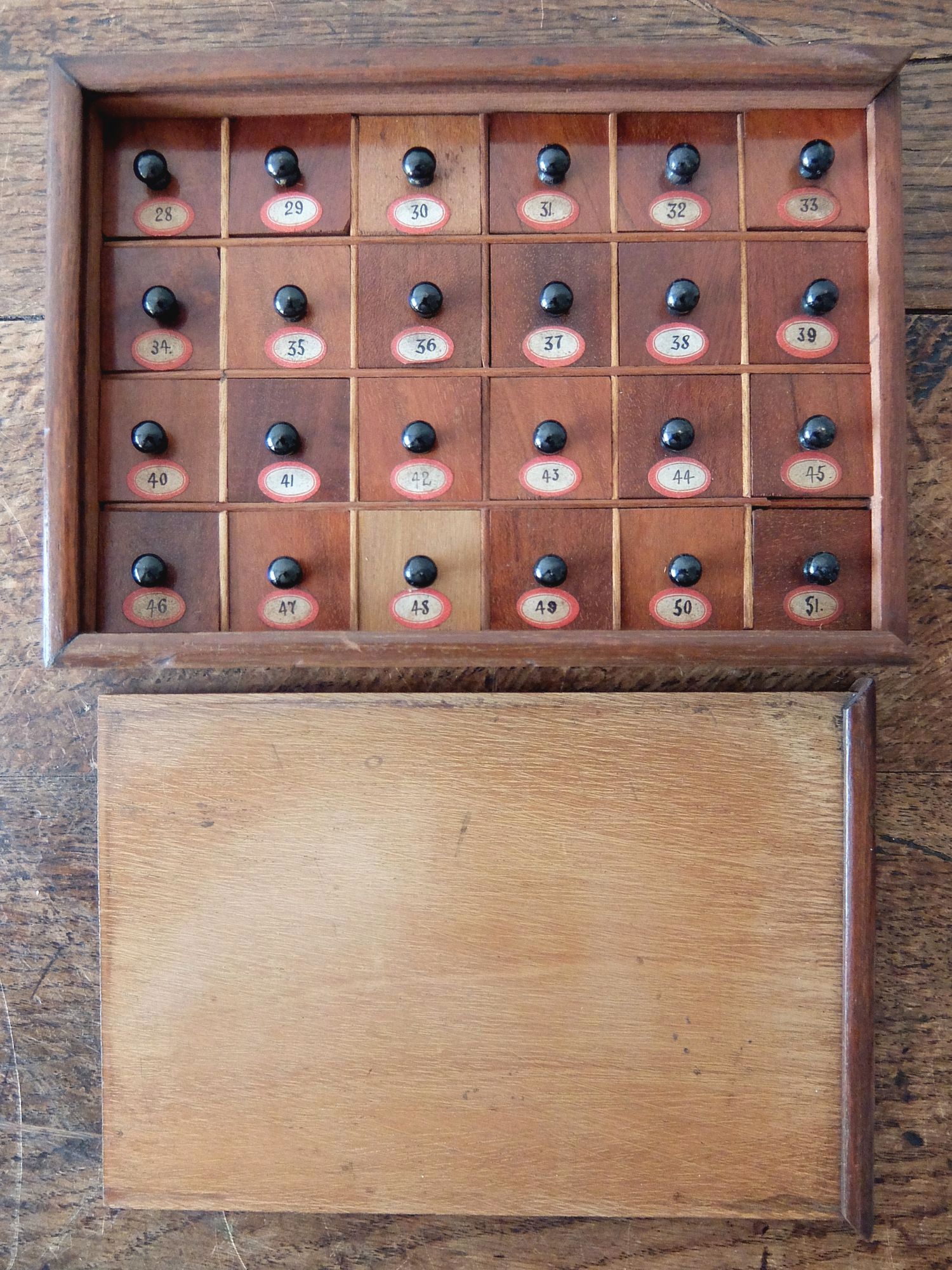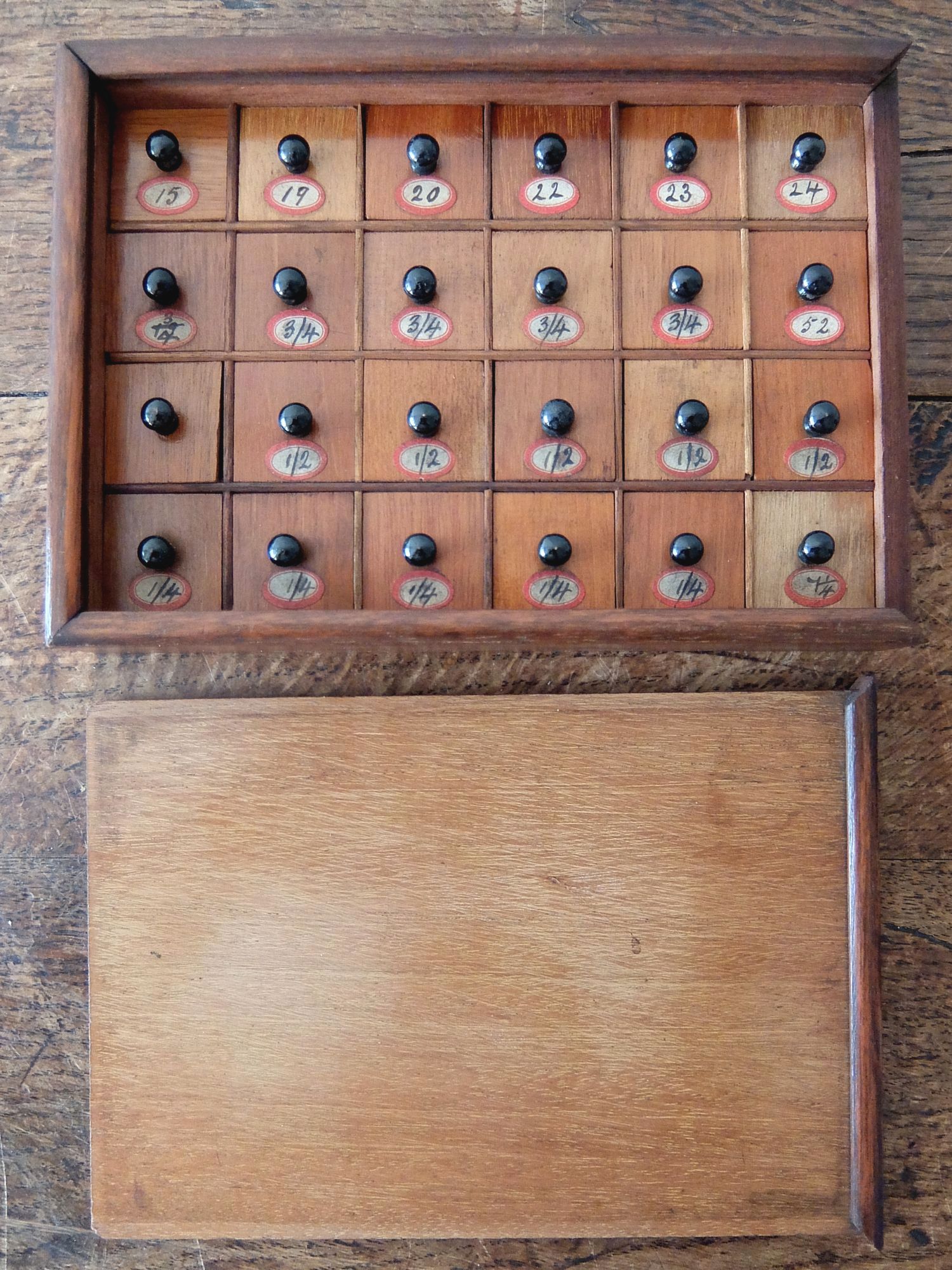 細かな時計の修理パーツが収納されていた蓋つきの木箱