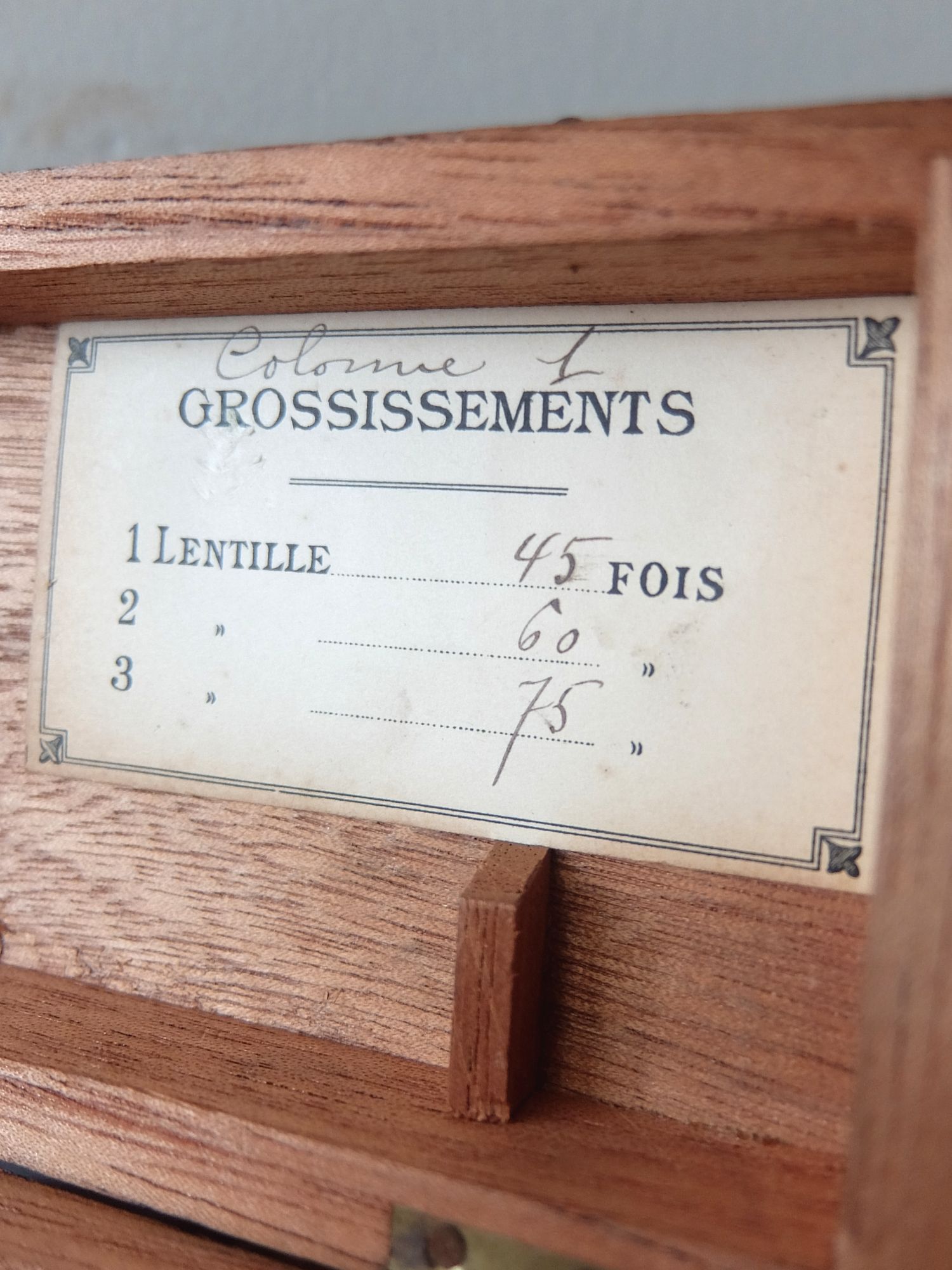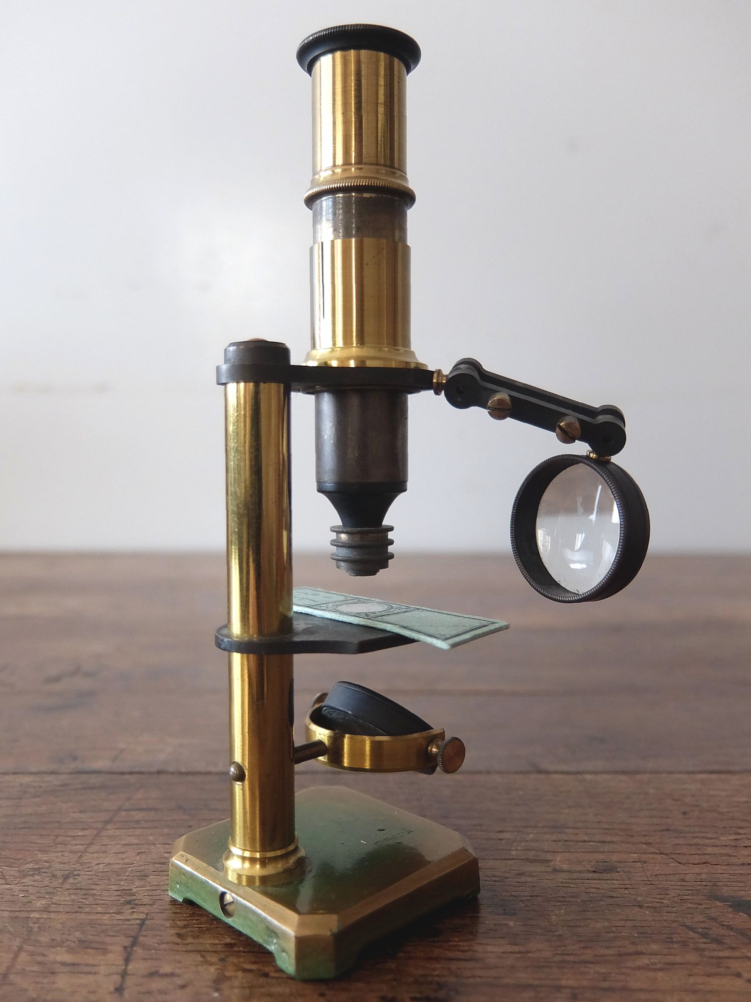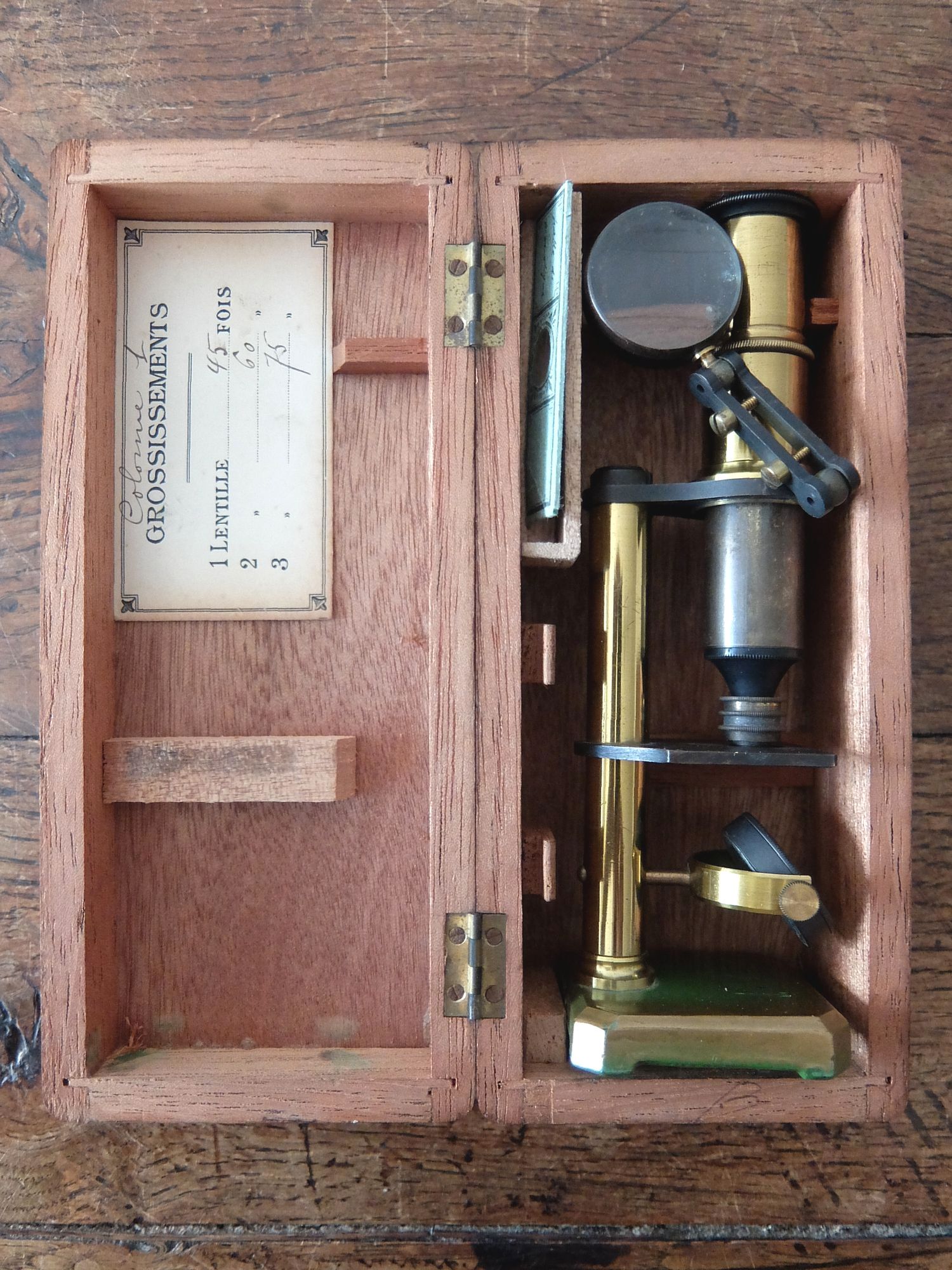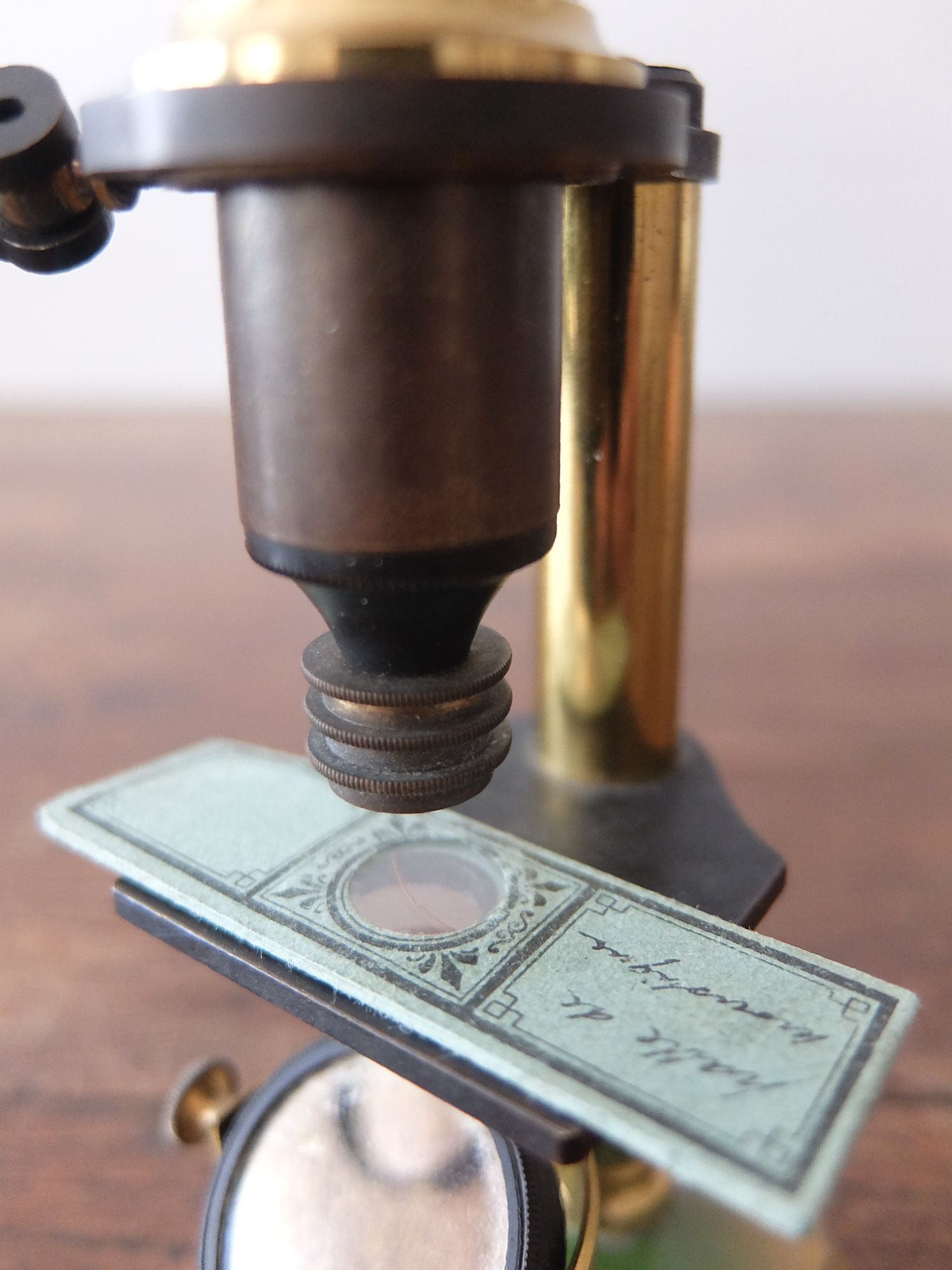木製のケースに収められた携帯用の真鍮製顕微鏡(プレパラート付)
