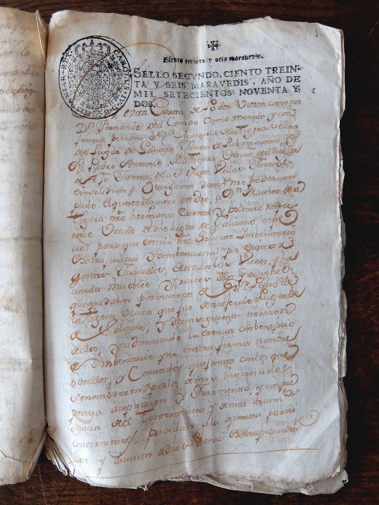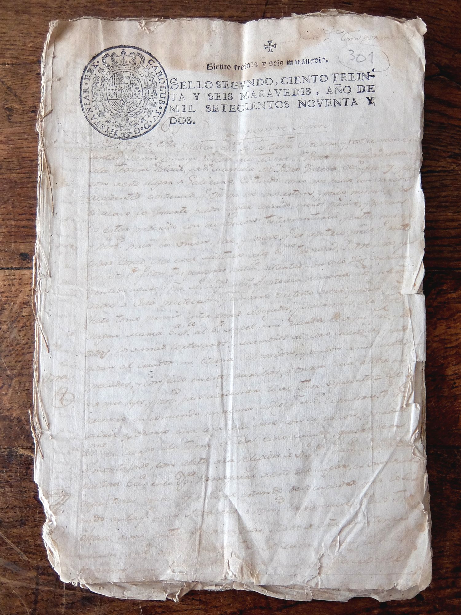 スペイン・ブルボン朝カルロスⅣ世治世時(1788~1808年)に記された手書きの書物(古紙25枚)