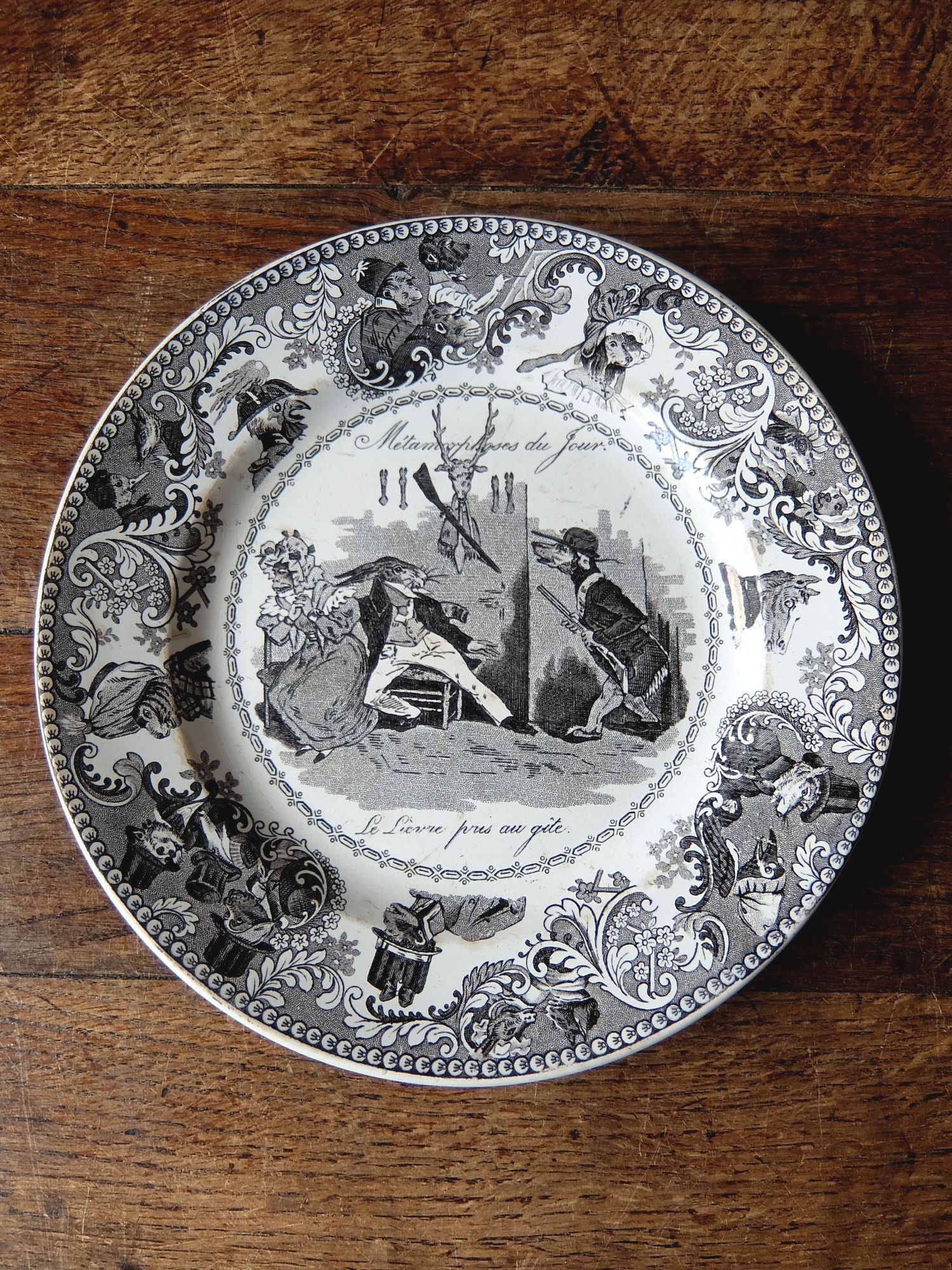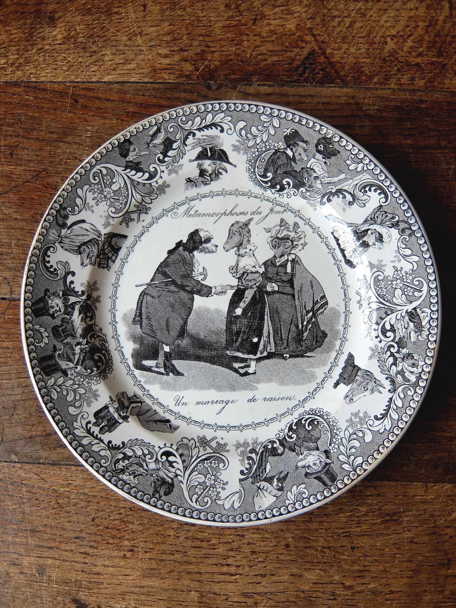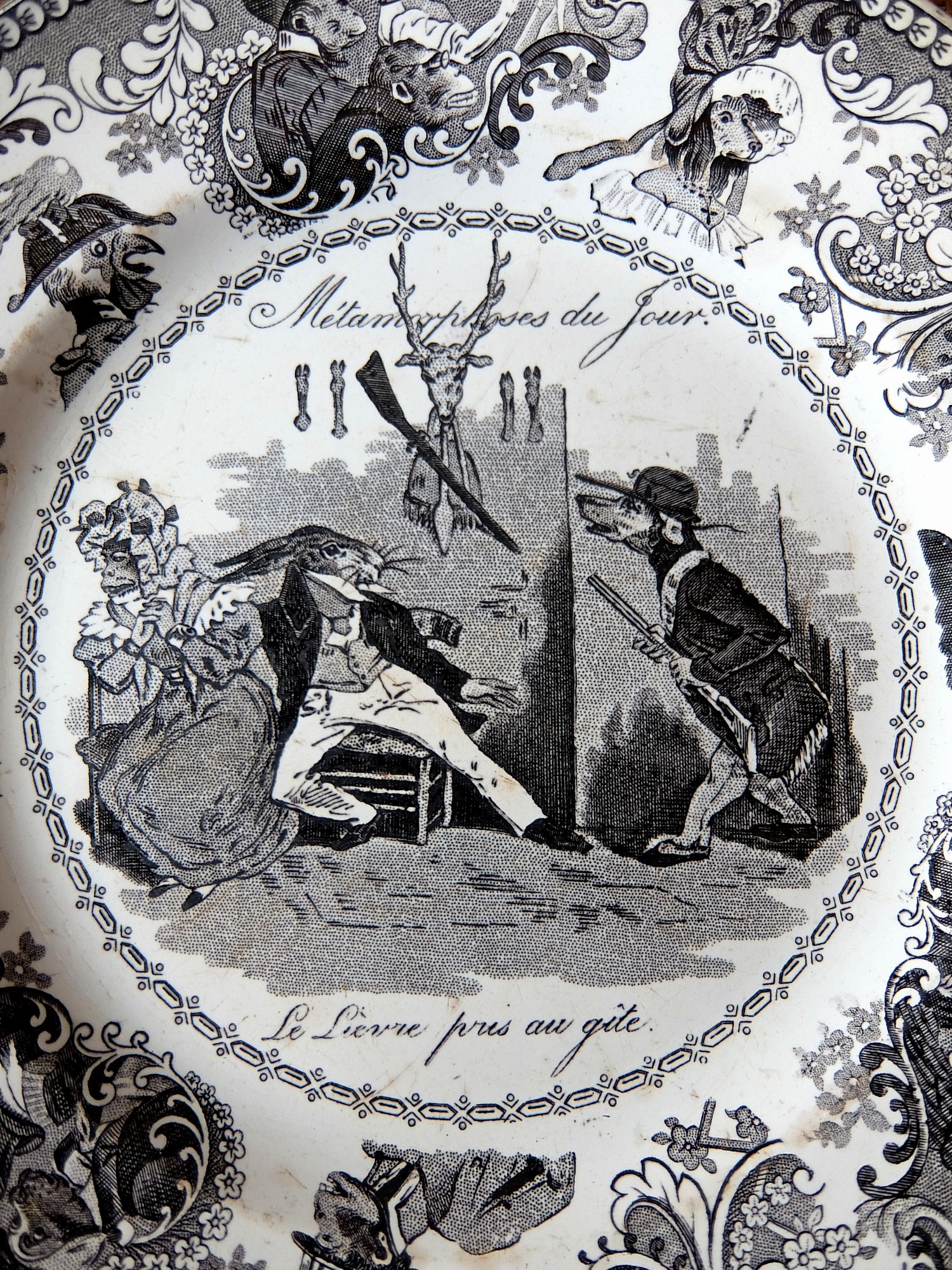 19世紀初期に作られたクレイユのGrisaille・デザート皿【J.J.グランヴィル(1803~1847)の風刺画集「Les Mtamorphoses du jour」より】
