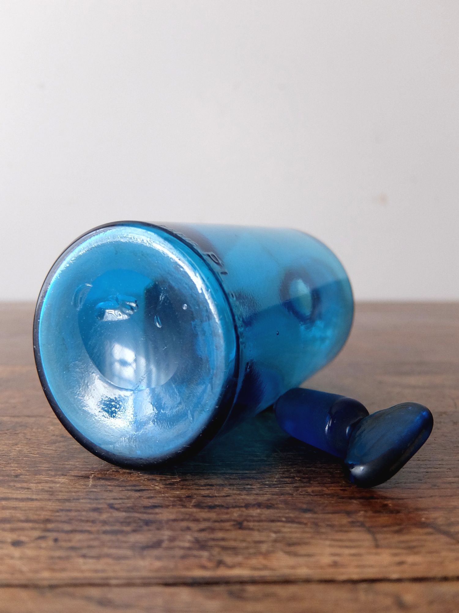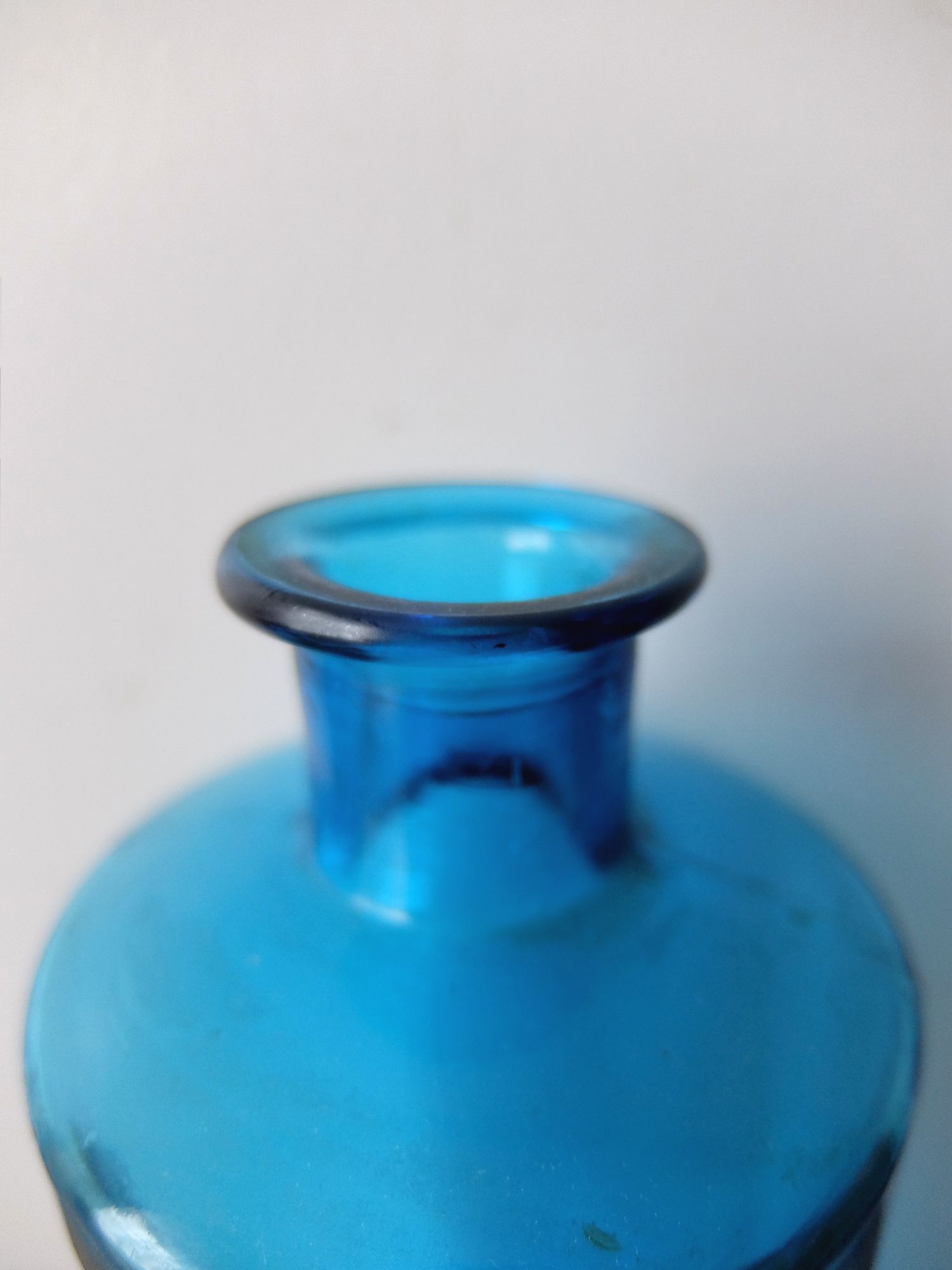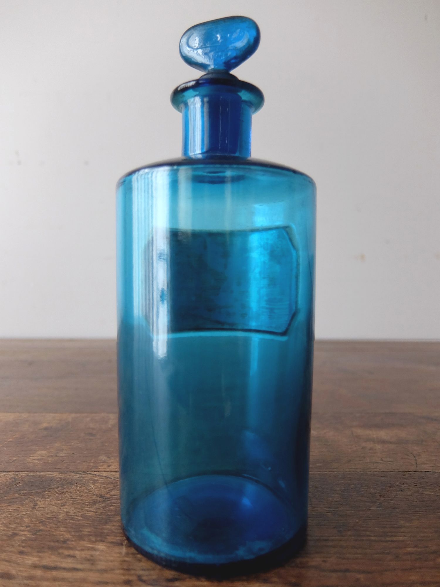 ガラスのプレートが付いた淡いブルーの薬瓶