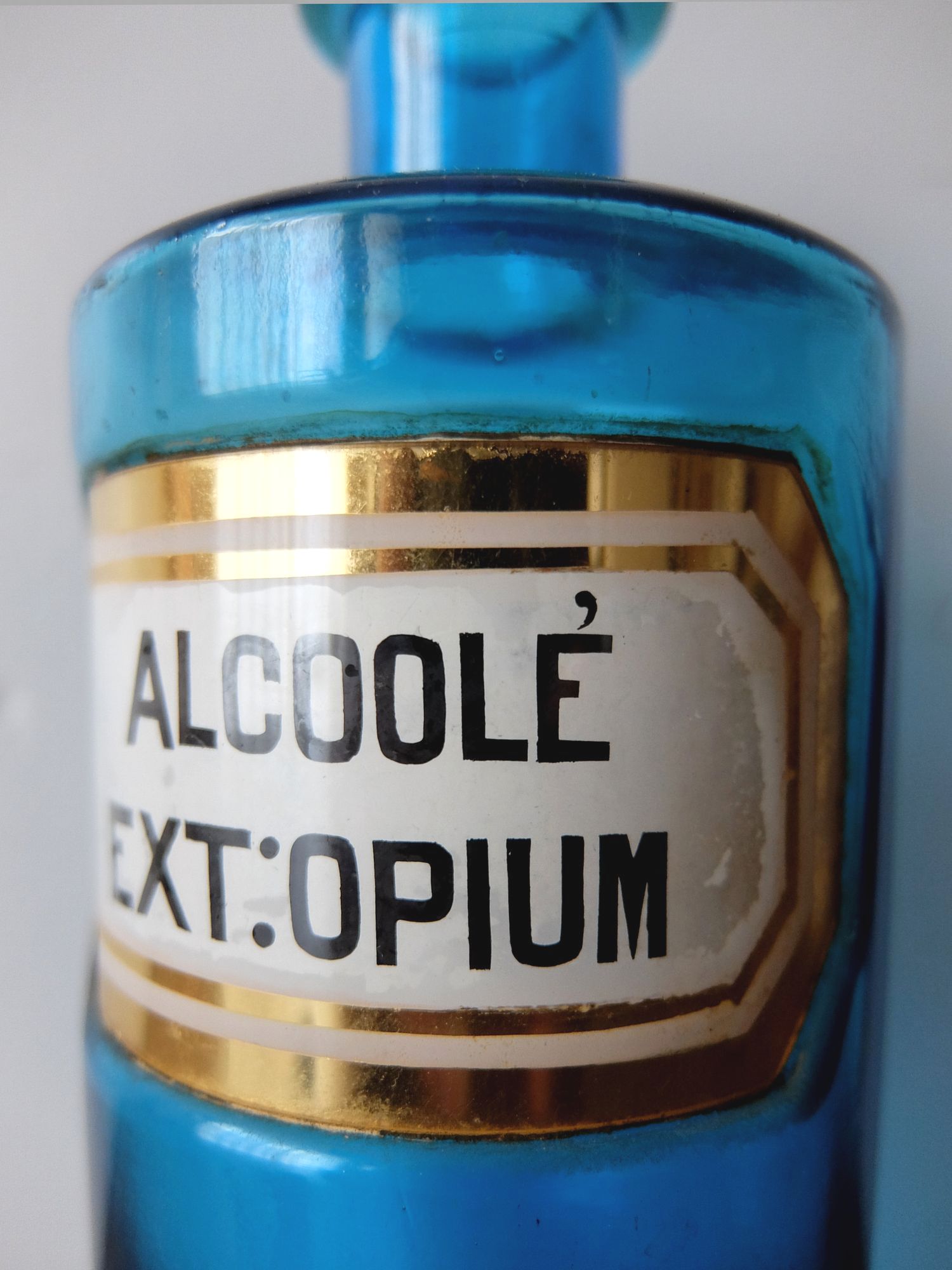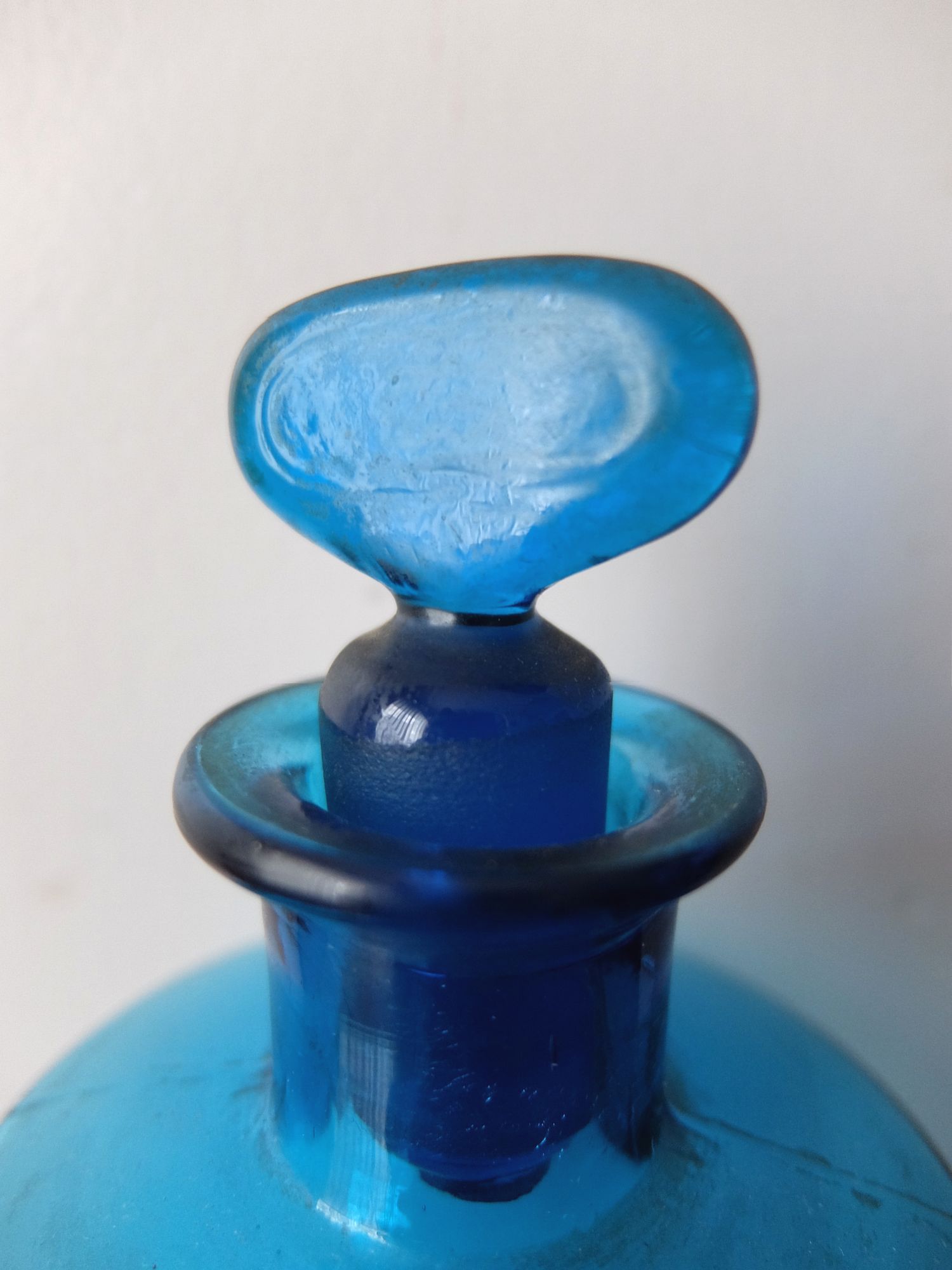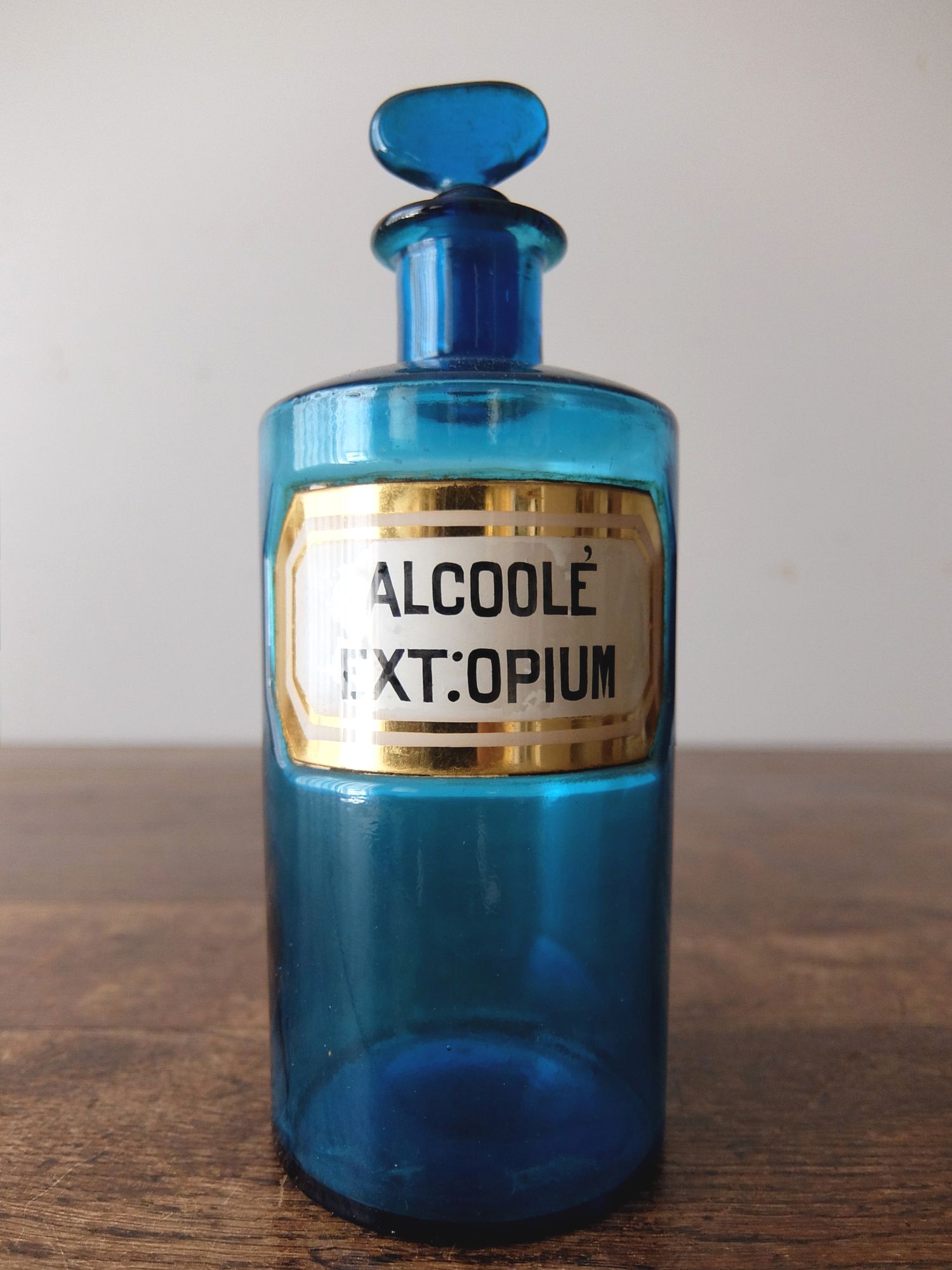 ガラスのプレートが付いた淡いブルーの薬瓶
