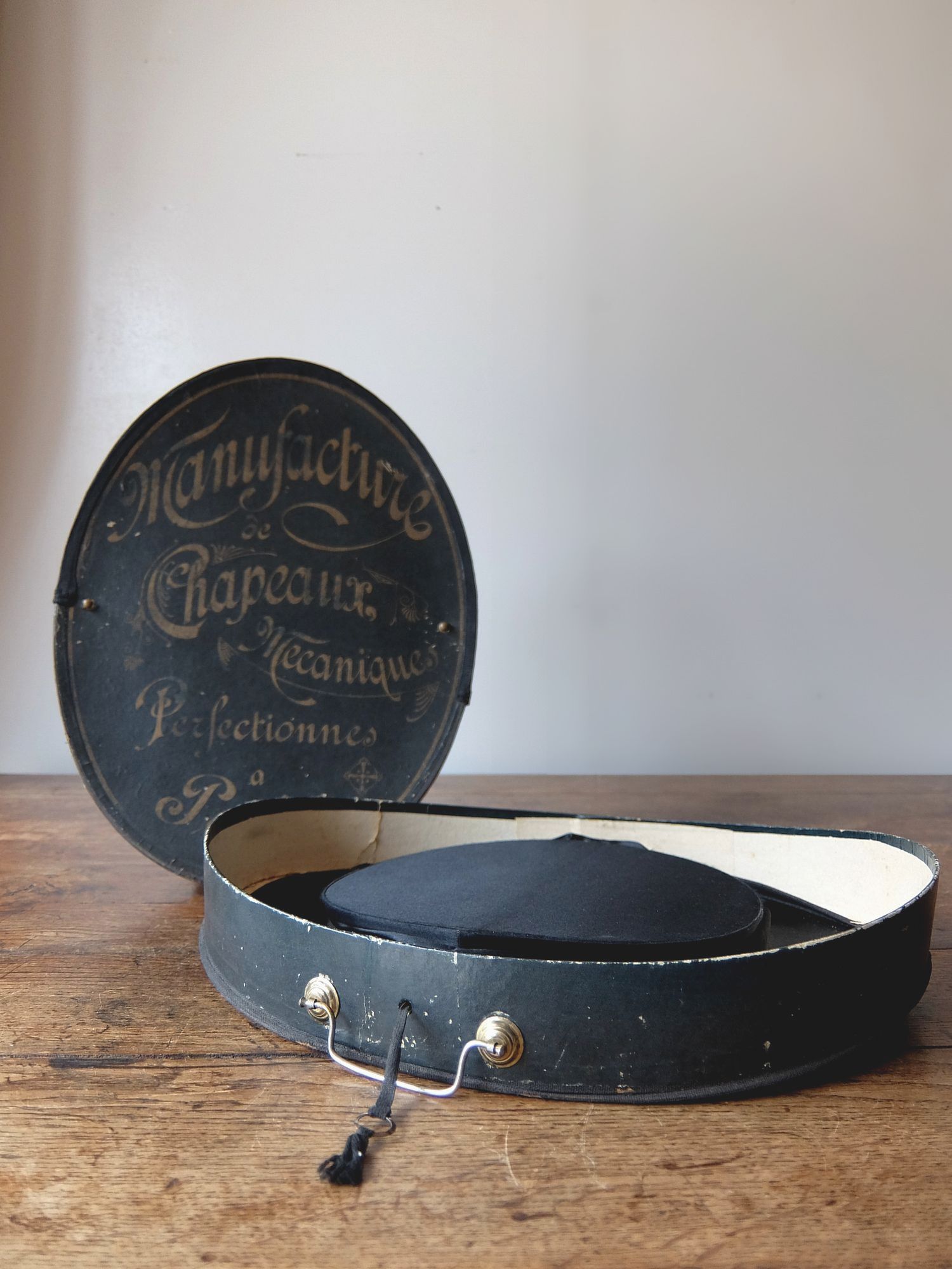 雰囲気のある紙箱が素敵な【Chapeaux Claque Mecaniques】社製(パリ)の折りたたみ式のシルクハット
