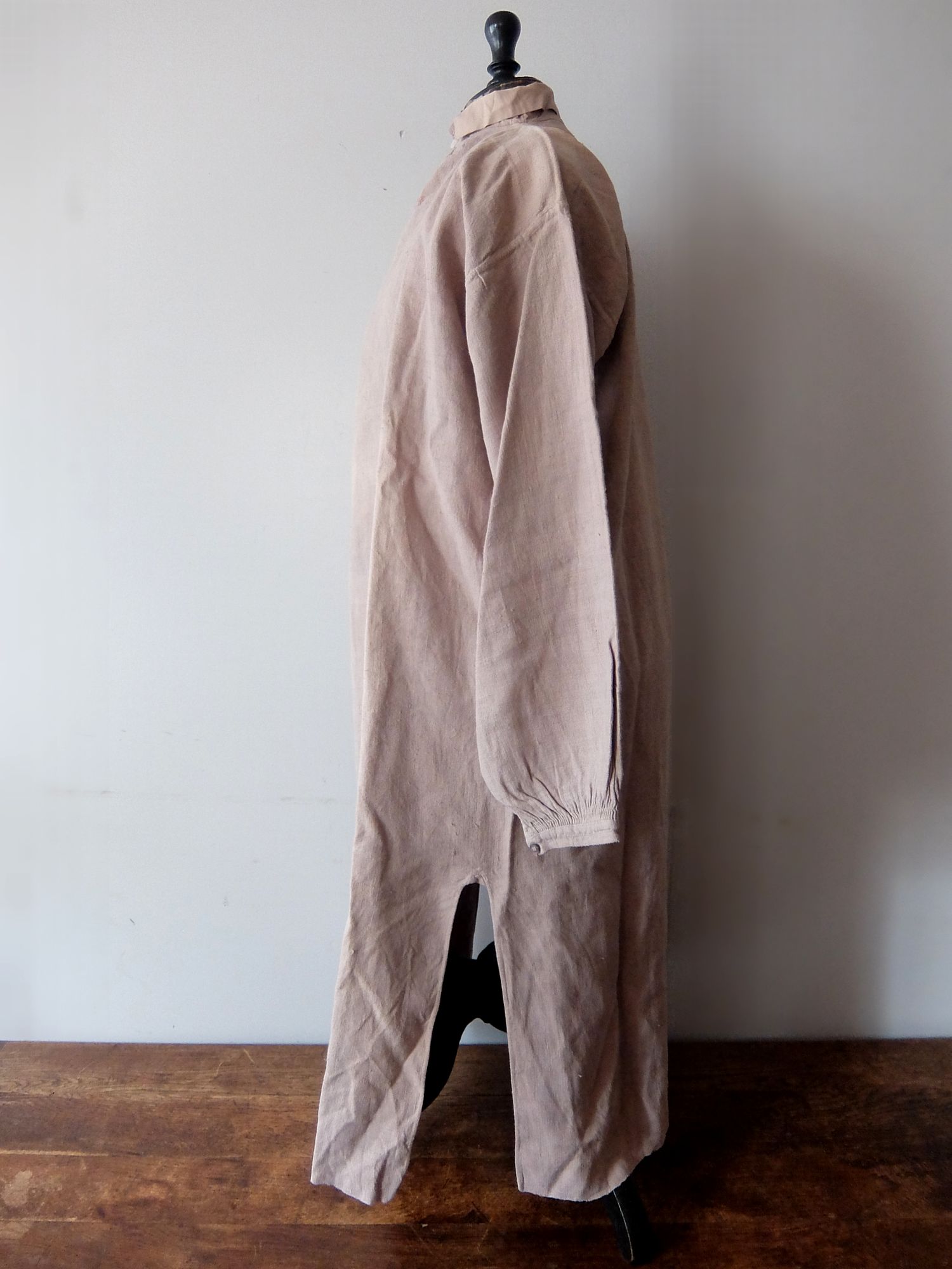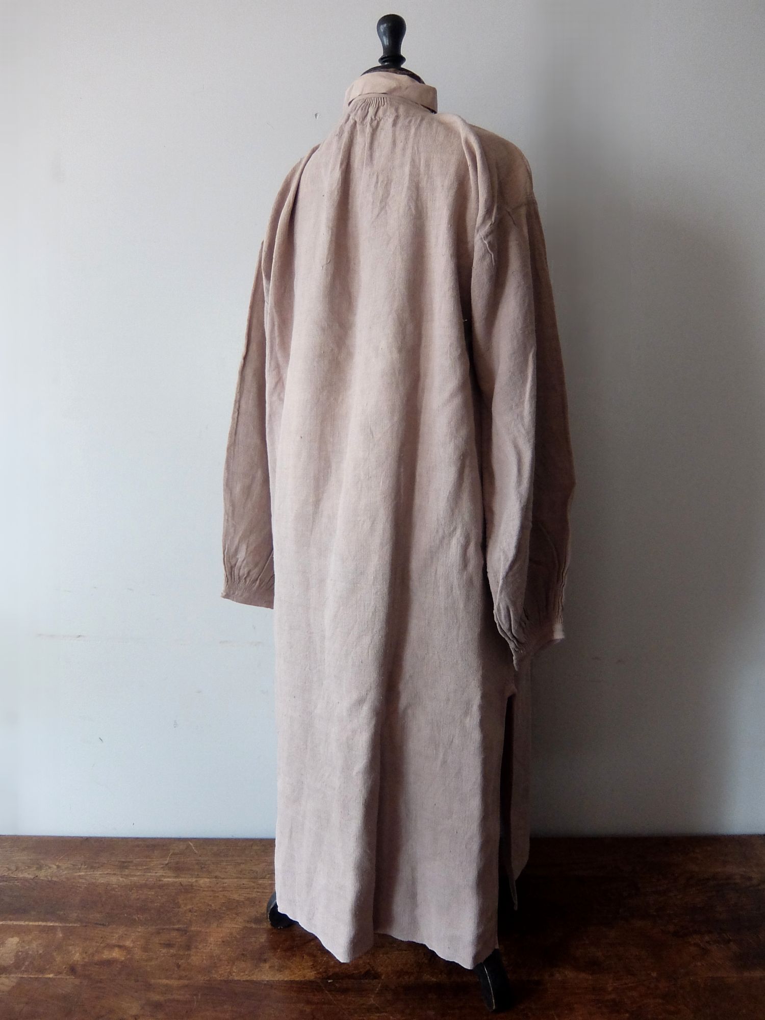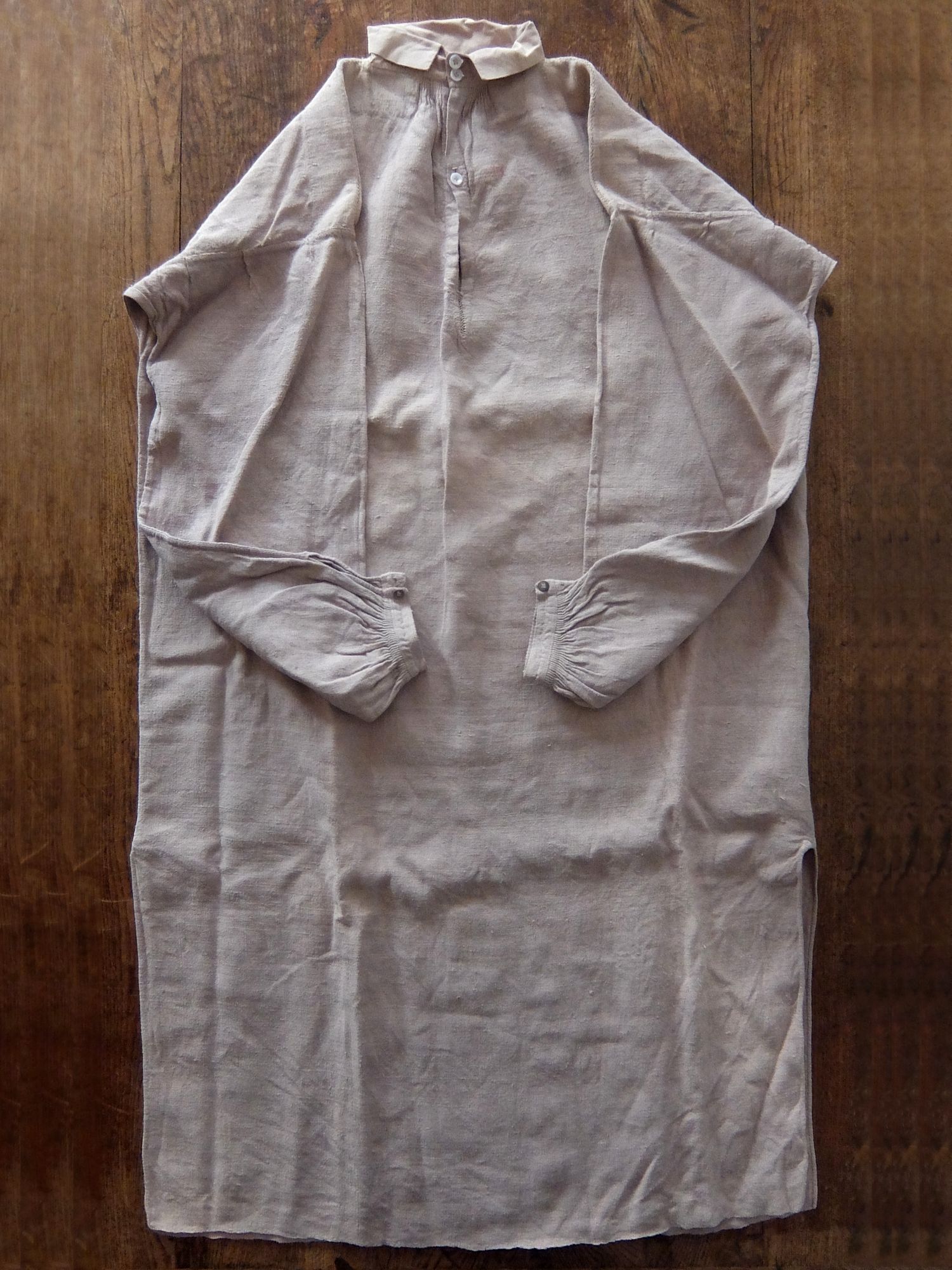 襟の後ろと袖のハンドギャザーの縫製が美しいフレンチリネンのスモッグシャツ/ナイティドレス