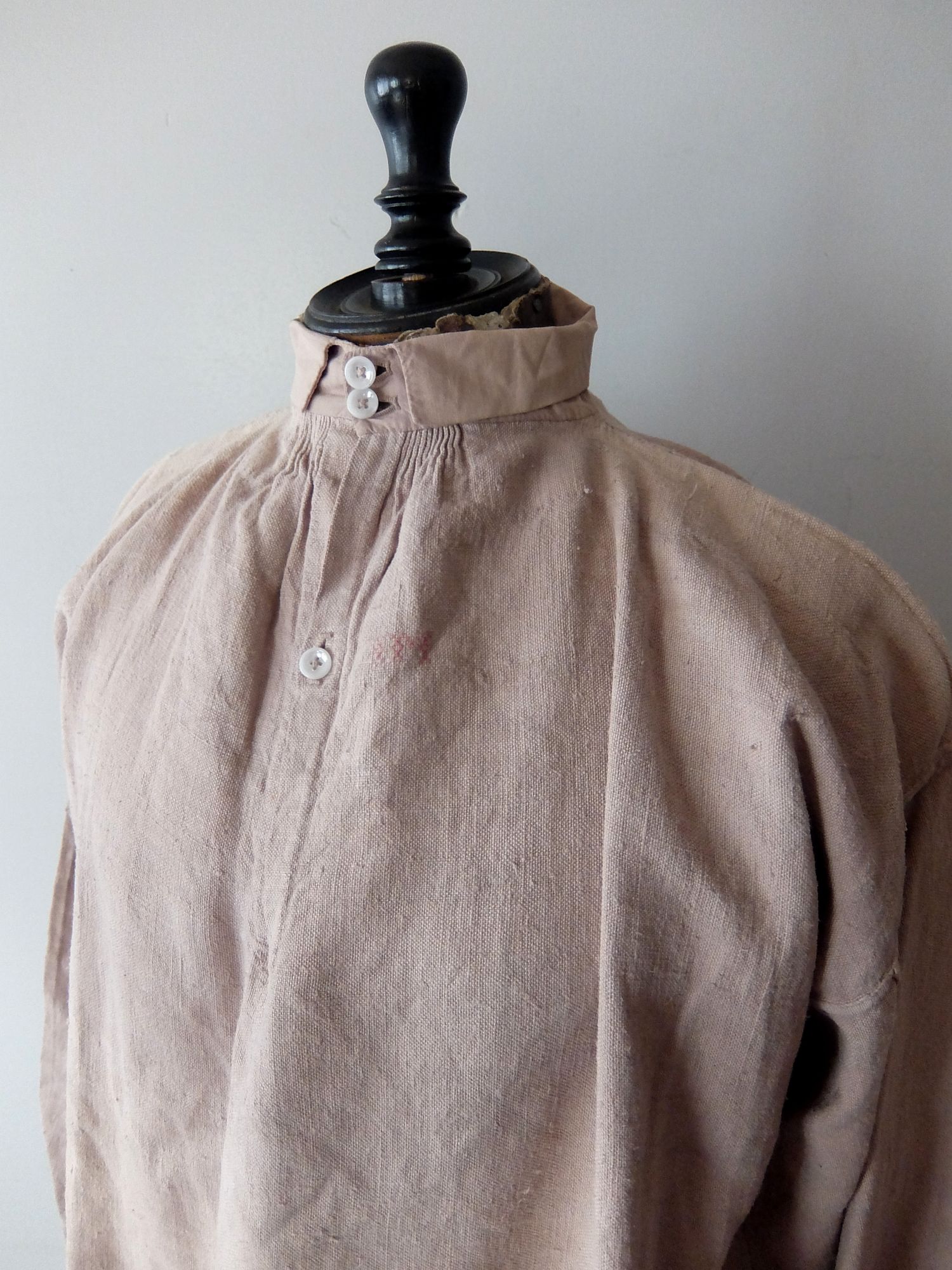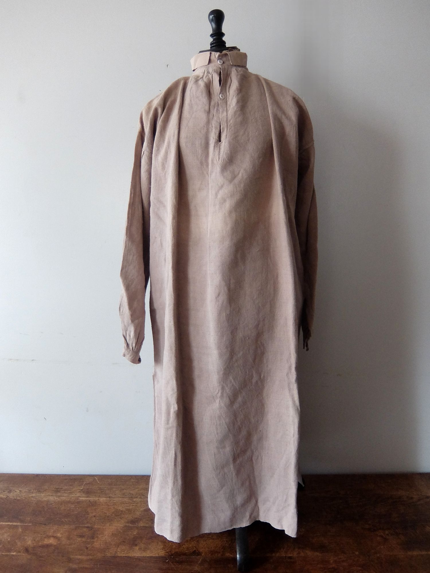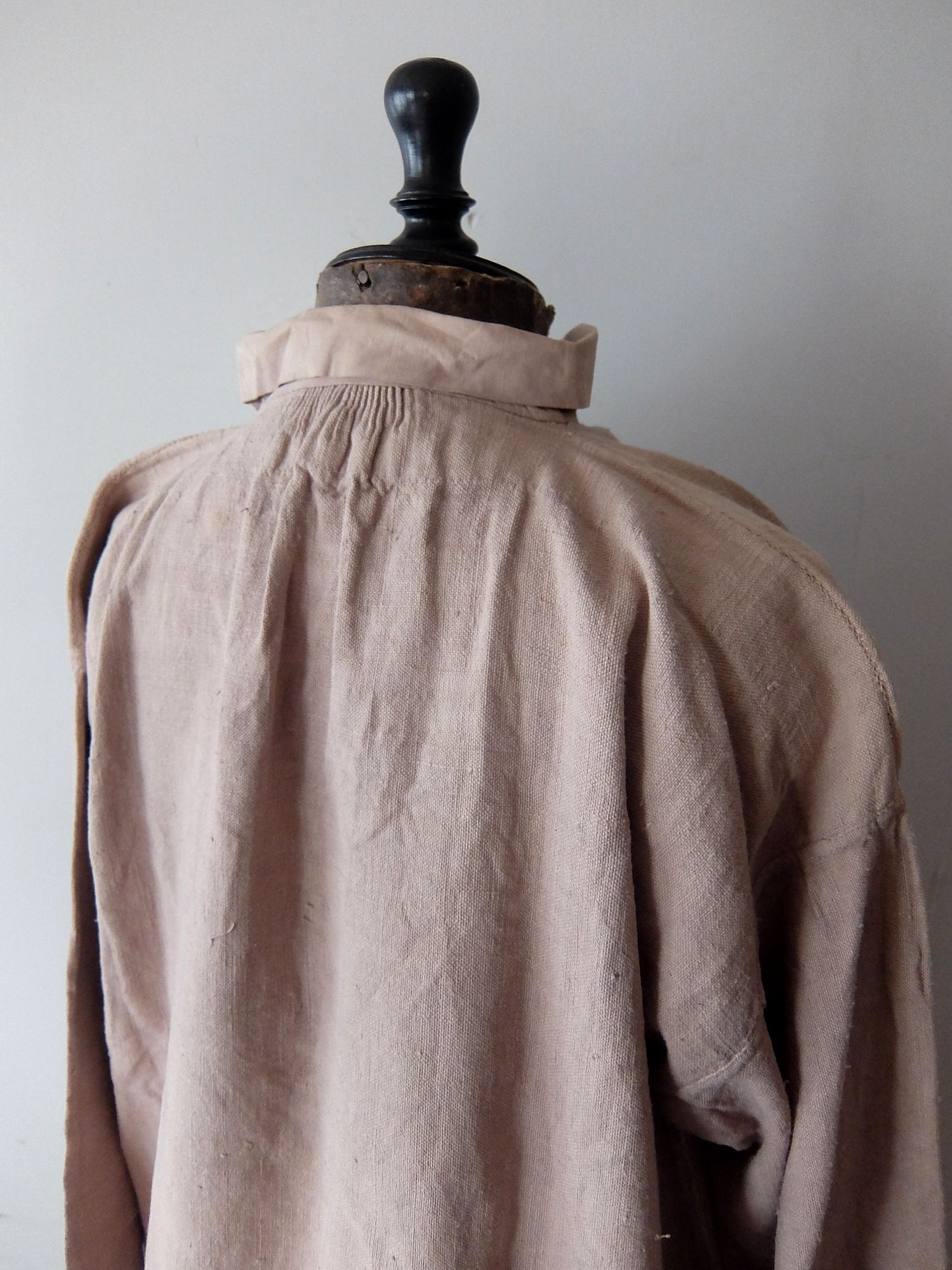 襟の後ろと袖のハンドギャザーの縫製が美しいフレンチリネンのスモッグシャツ/ナイティドレス