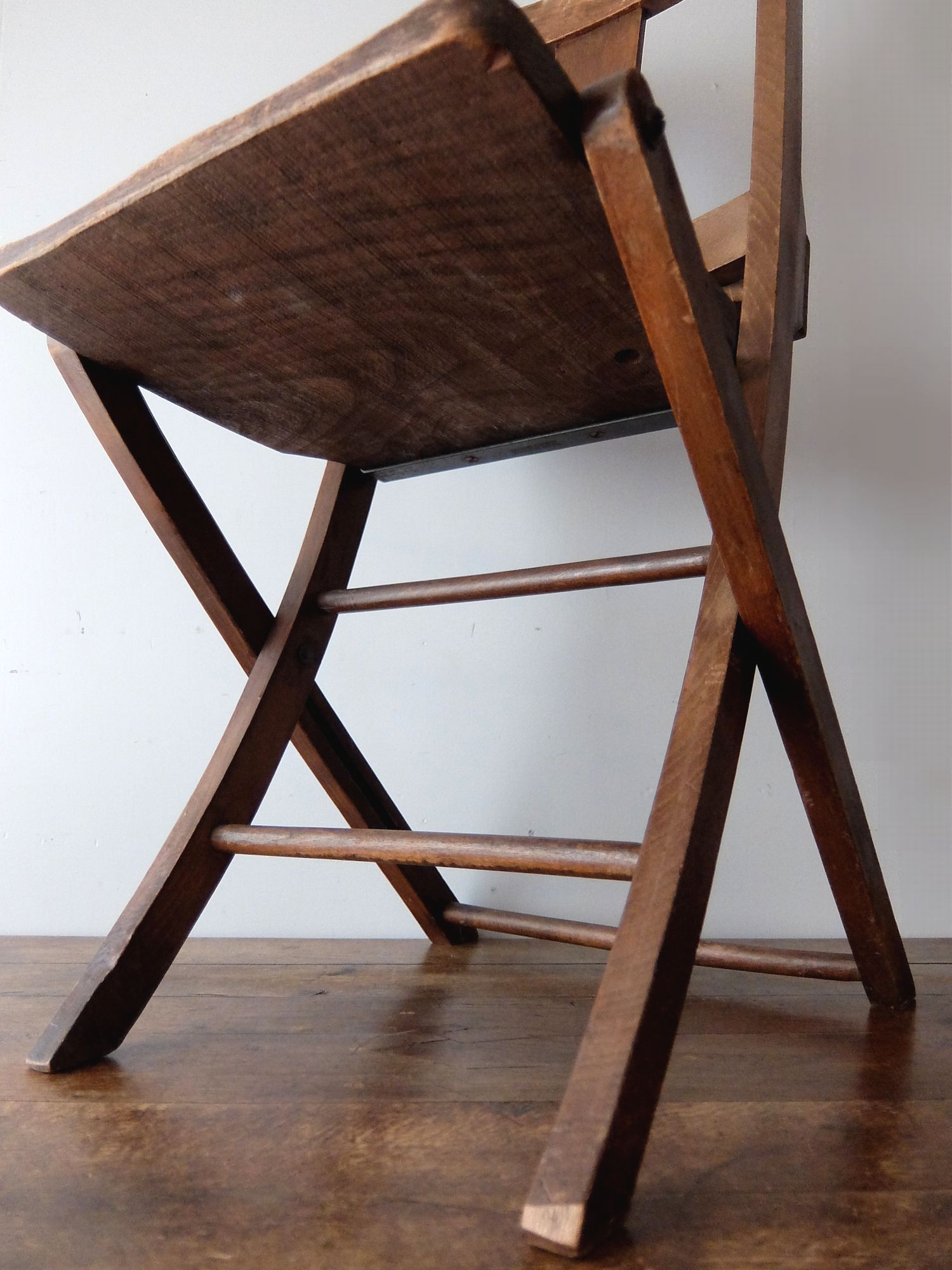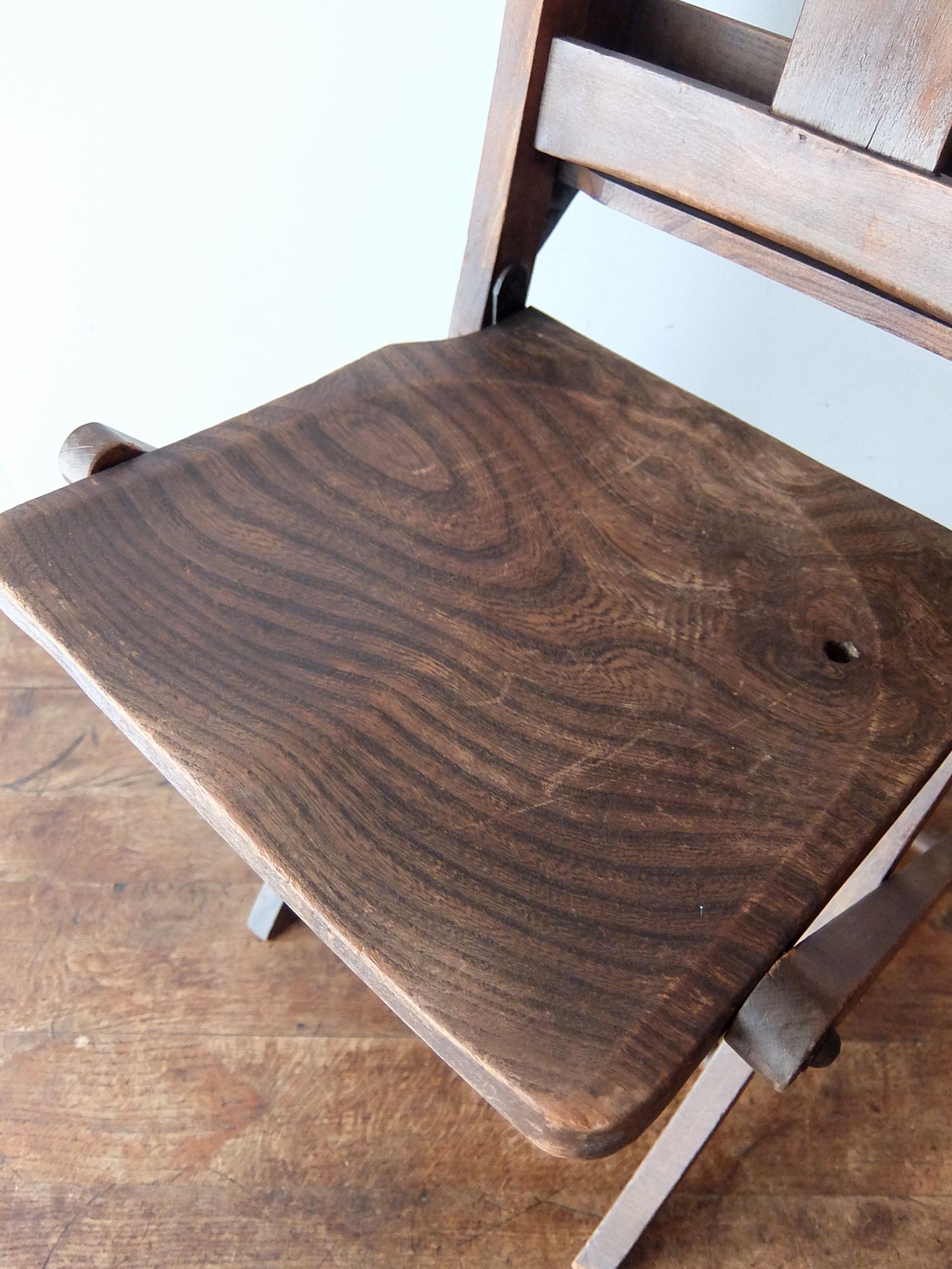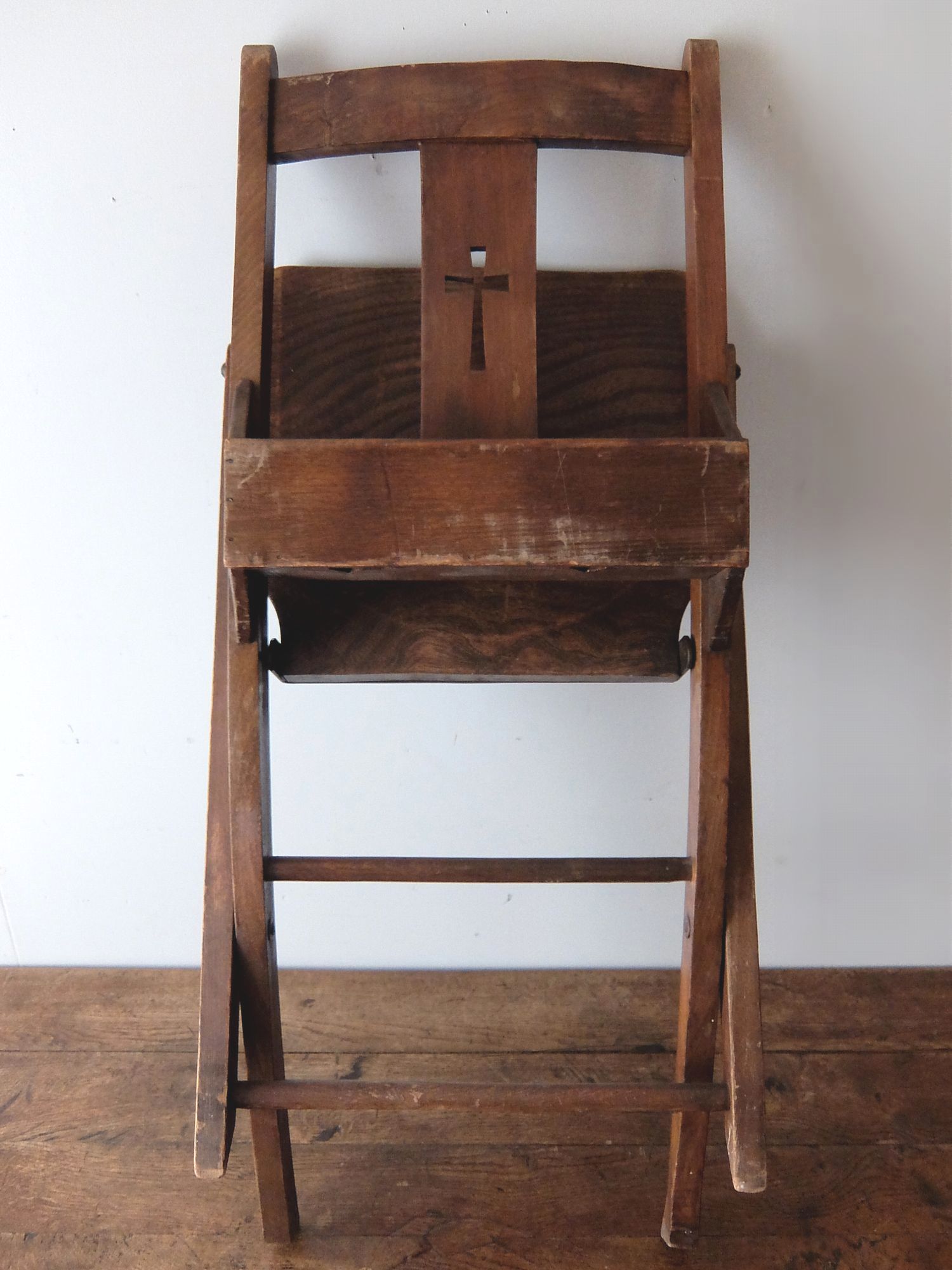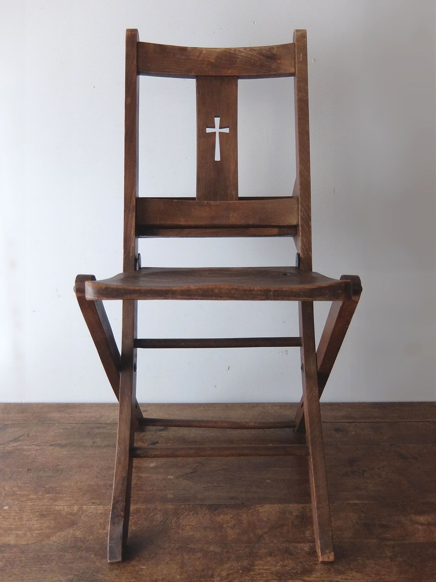 背もたれの十字架の意匠が印象的な折り畳み式のチャーチチェアー