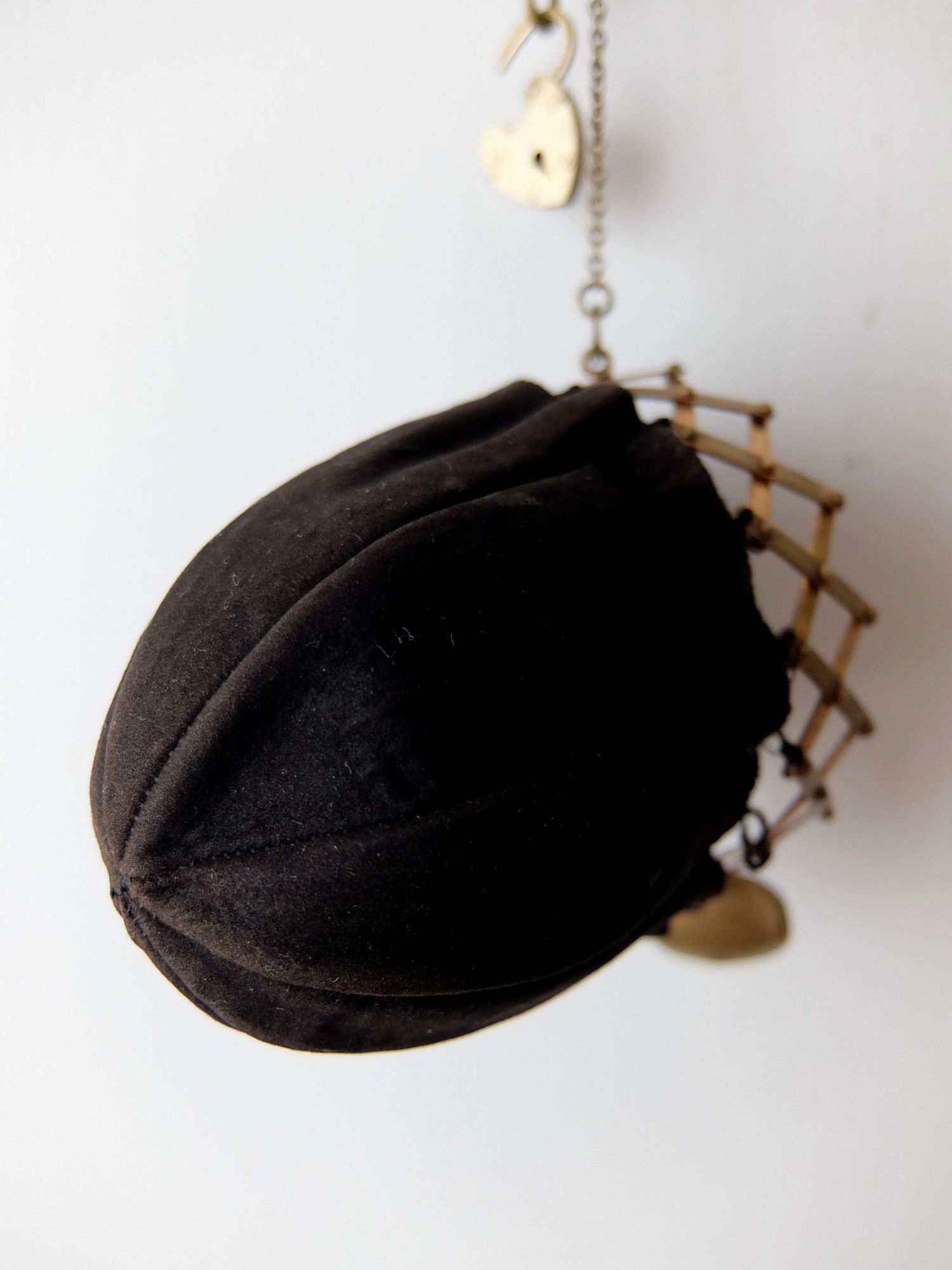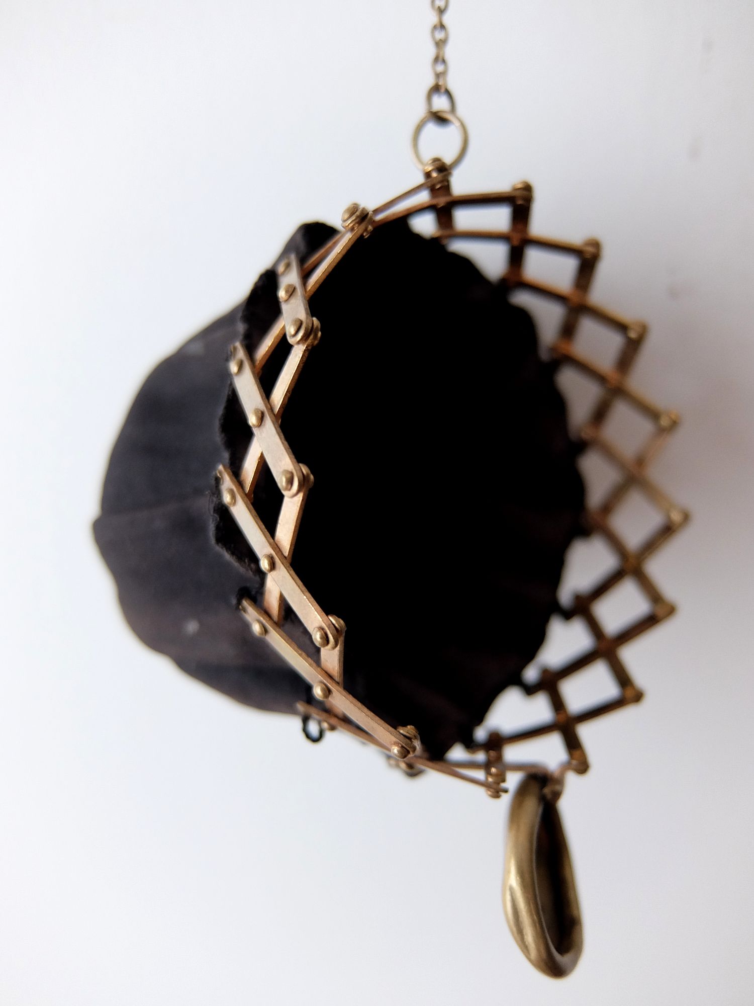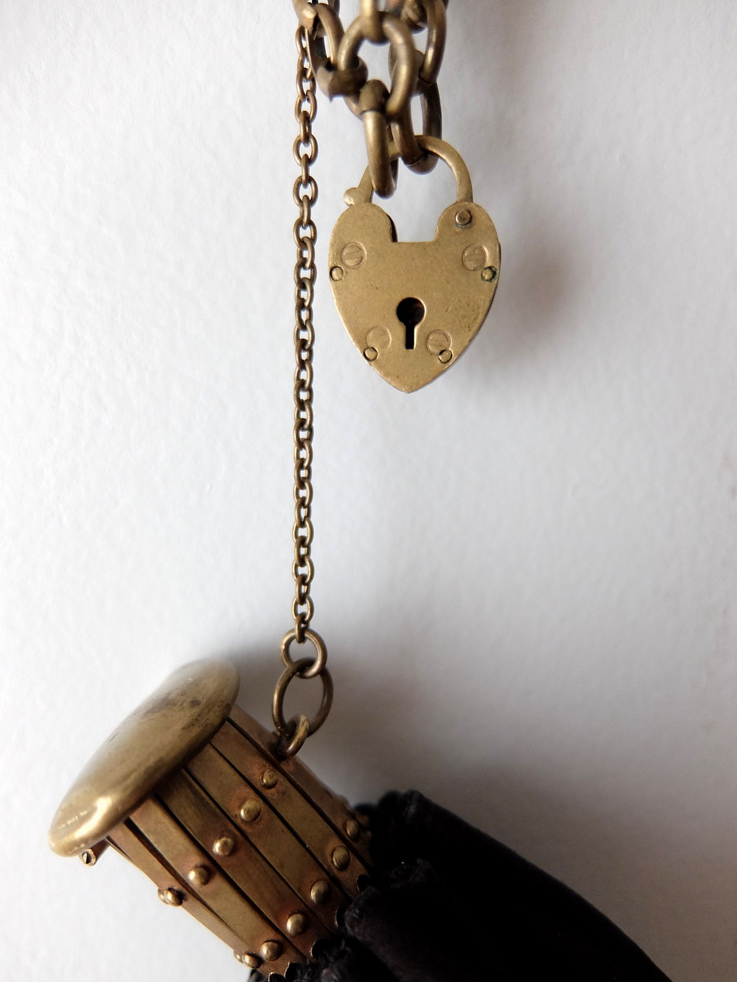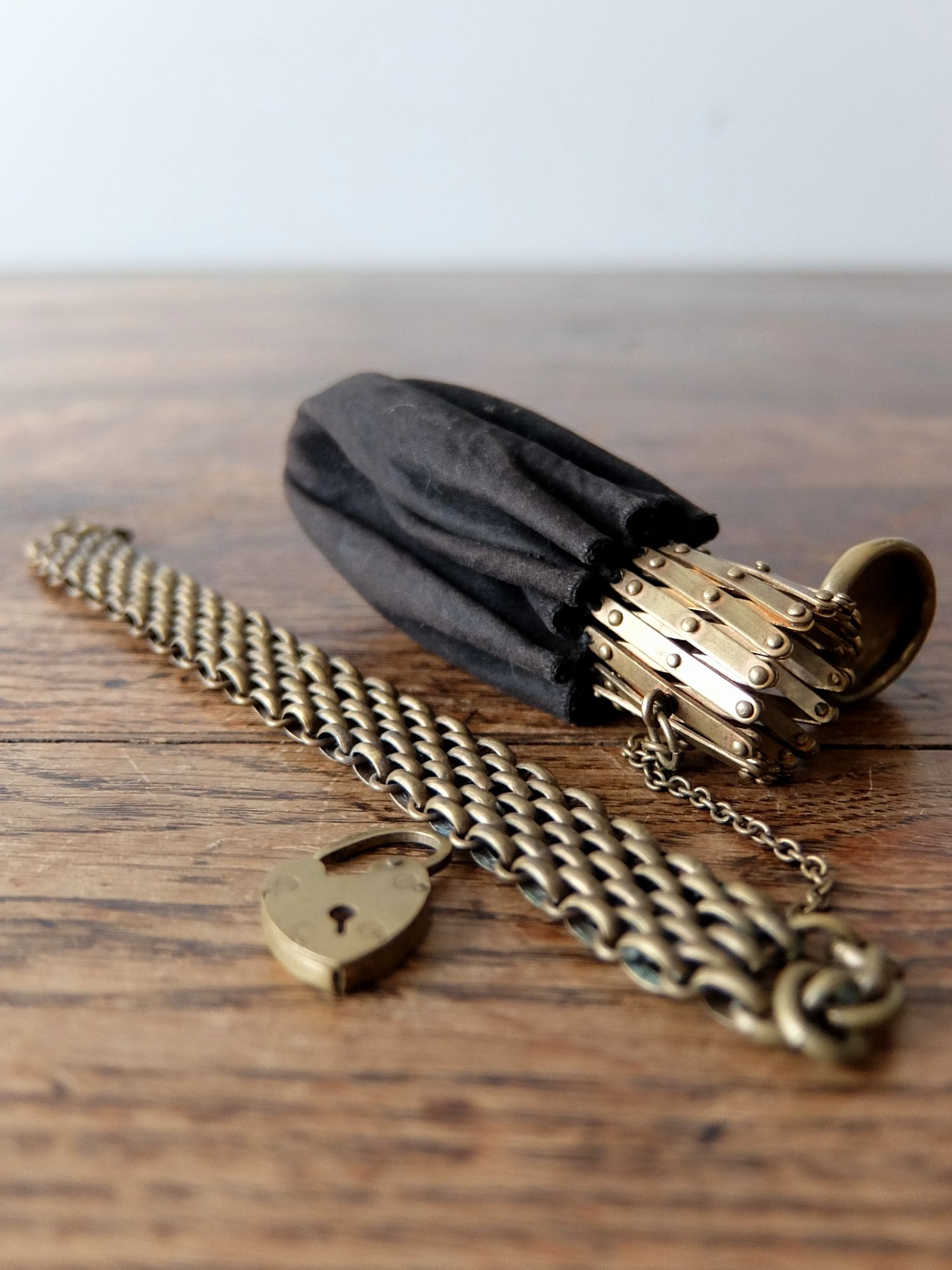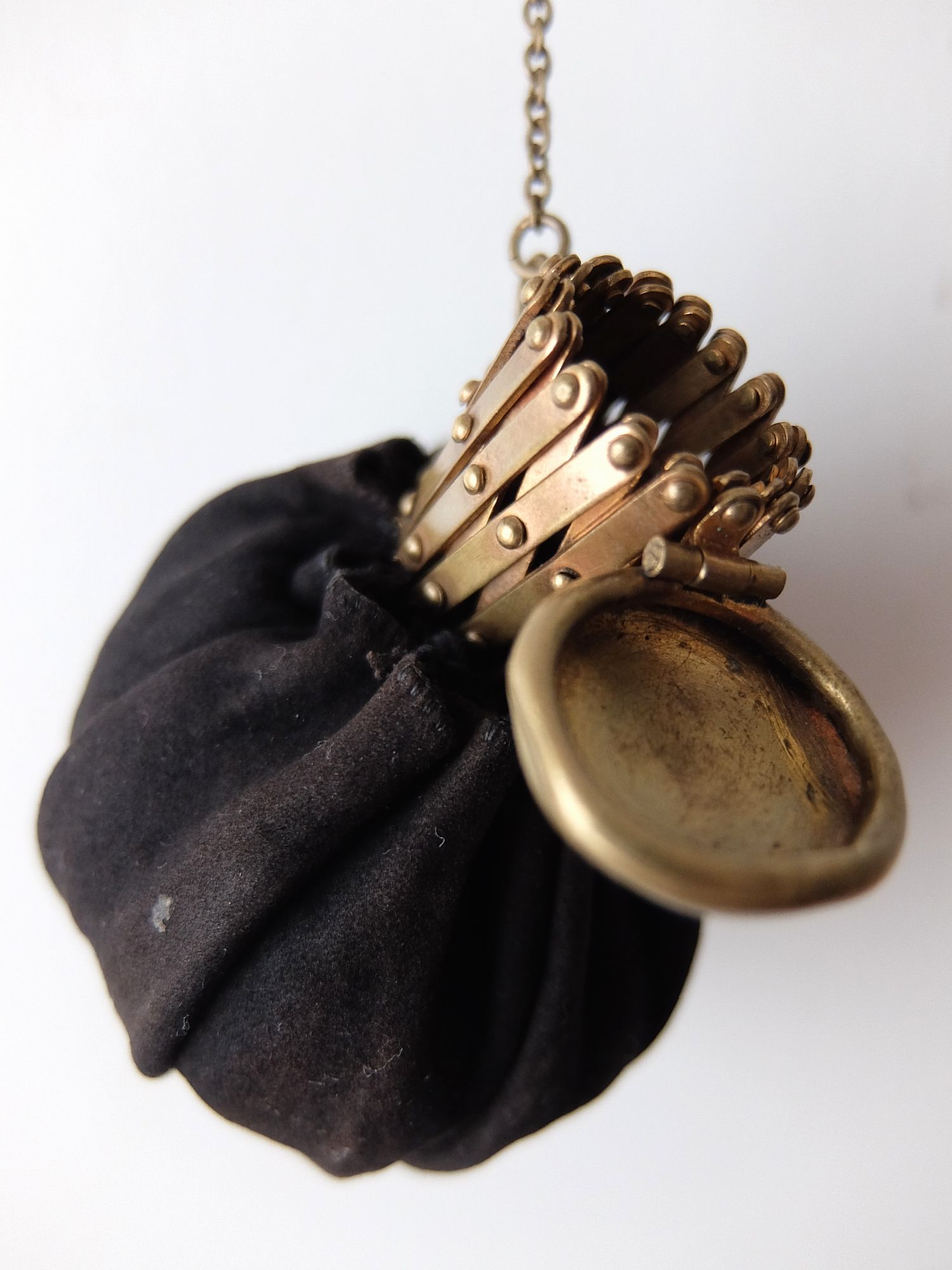 細工が美しい真鍮製のチェーンが付いた黒い革製の小物入れ